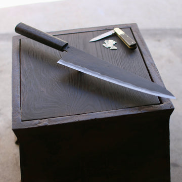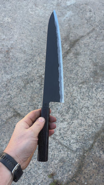 This Gyuto Shefu feature a long blade, good distal taper, thin tip. Flat profile at the heel with a slight curve toward the tip. The San-mai is laminated by myself in house. Forged to shape and to geometry the blade is ground on water cooled grinding wheel.