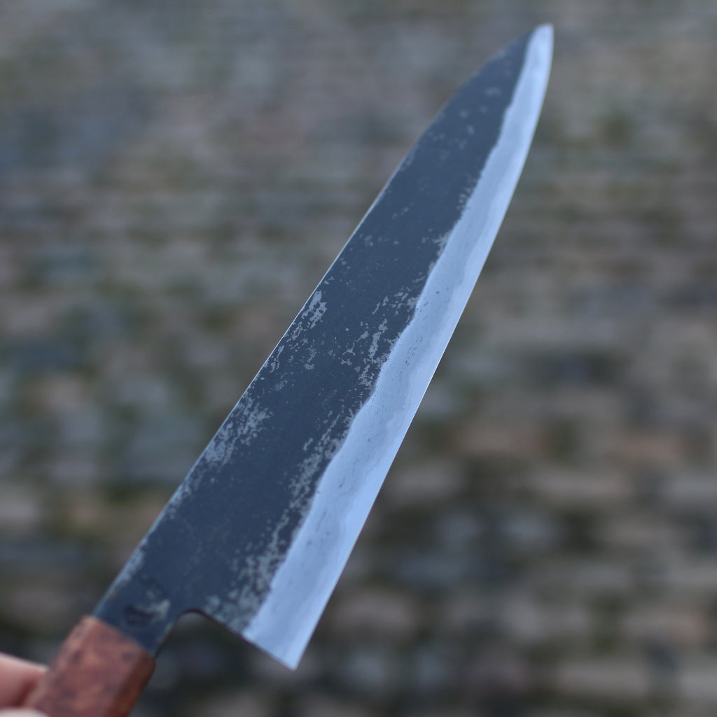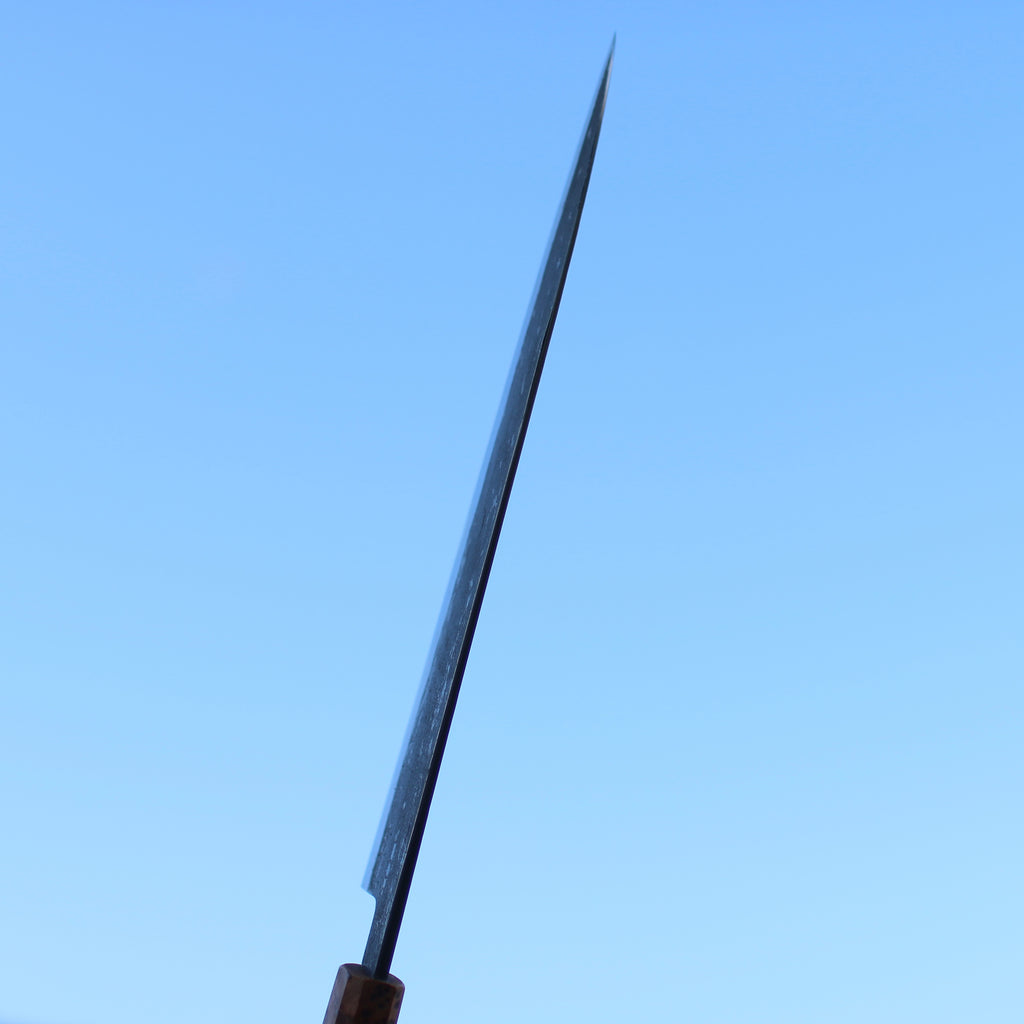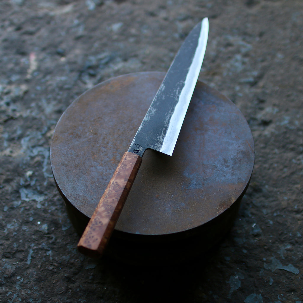 This Tetsu Gyuto feature a long blade, good distal taper, and thin tip. Flat profile with a slight curve toward the tip. The san-mai is made from 115CrV3 core steel with vintage wrought iron cladding. Forged to shape and to geometry the bevels are ground on water cooled grinding stone with a Kasumi finish.