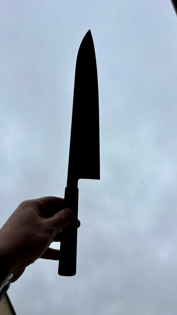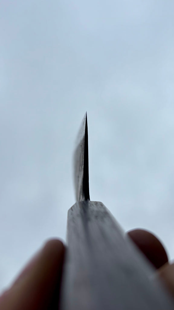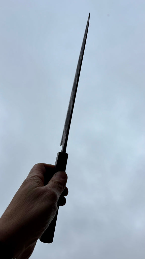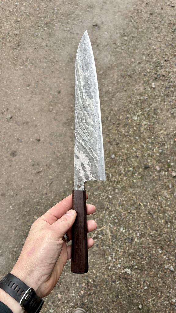 This Suminagashi Gyuto feature a long blade, good distal taper, and thin tip. Flat profile at the heel with a slight curve toward the tip. The San-mai is made from 135Cr3 steel core with Suminagashi cladding. Forged to shape and to geometry the blade is ground on water cooled grinding wheel.