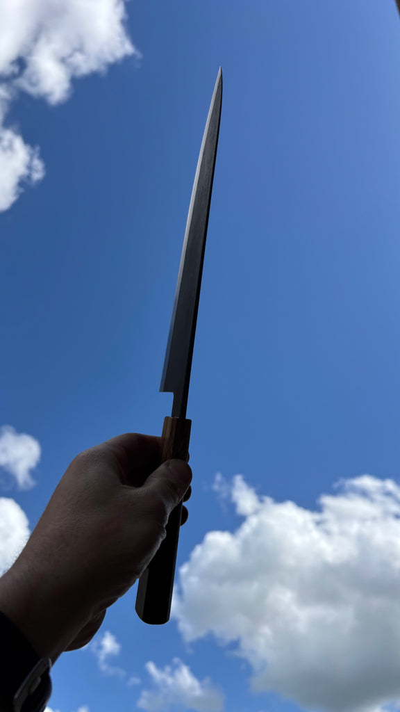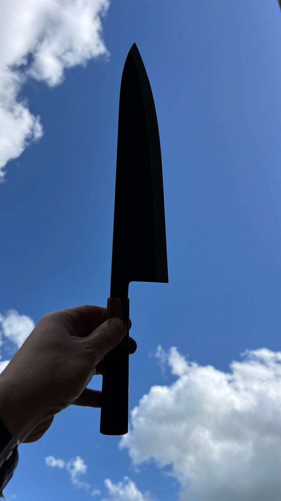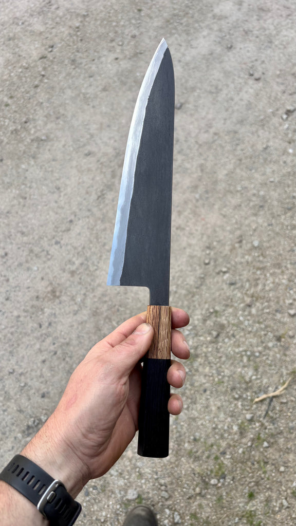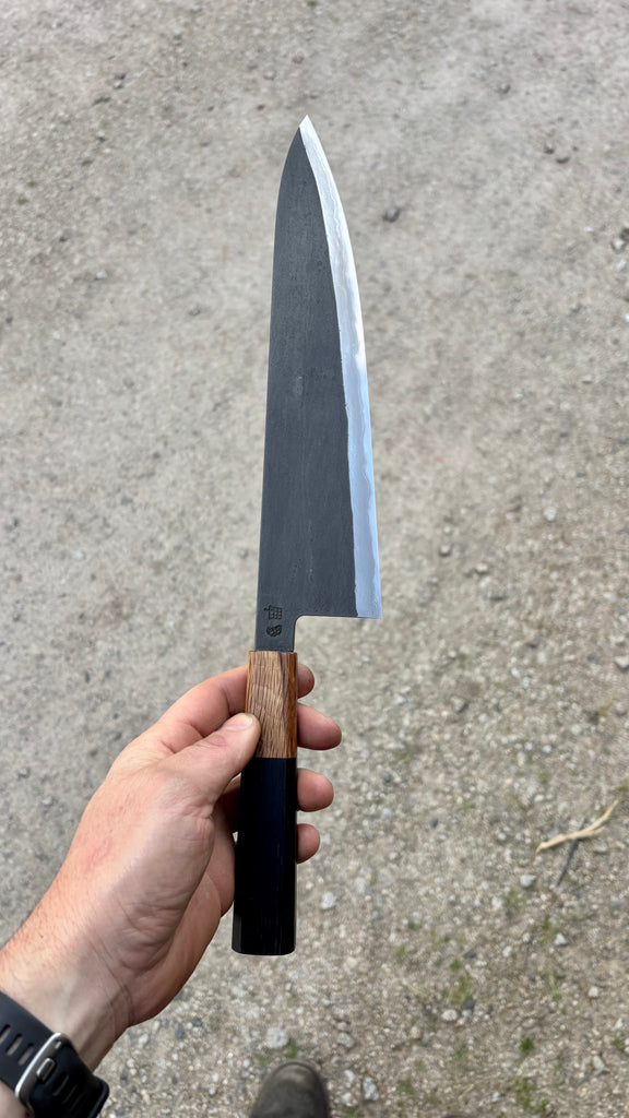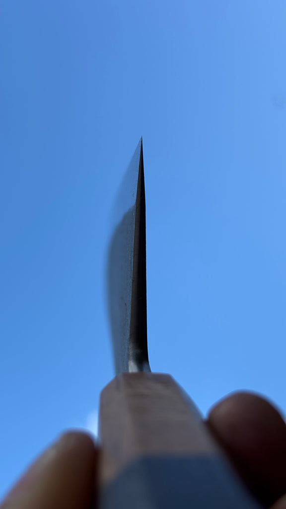 This Tetsu Gyuto feature a tall and long blade, good distal taper, thin tip. Flat profile at the heel with a slight curve toward the tip. The San-mai is made from 115CrV3 steel core with wrought iron cladding. Forged to shape and to geometry the blade is ground on water cooled grinding wheel.