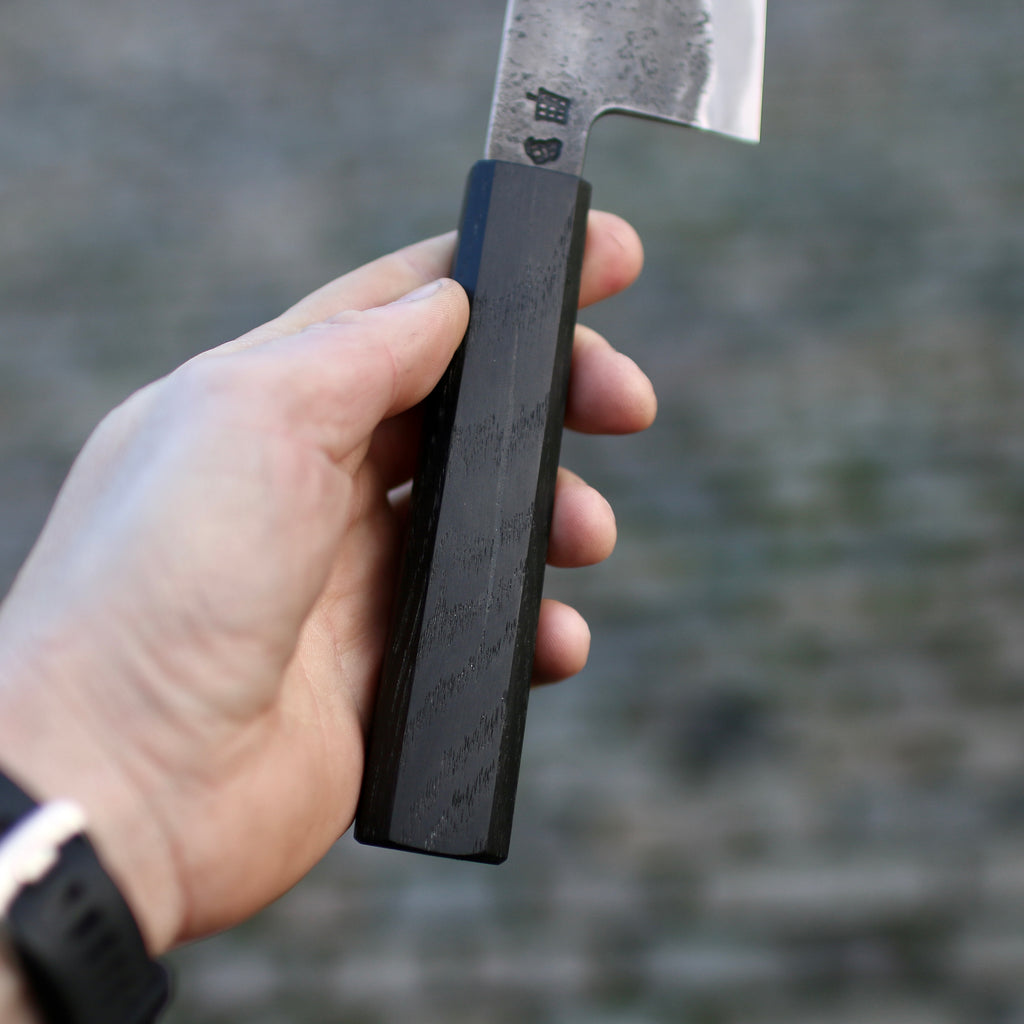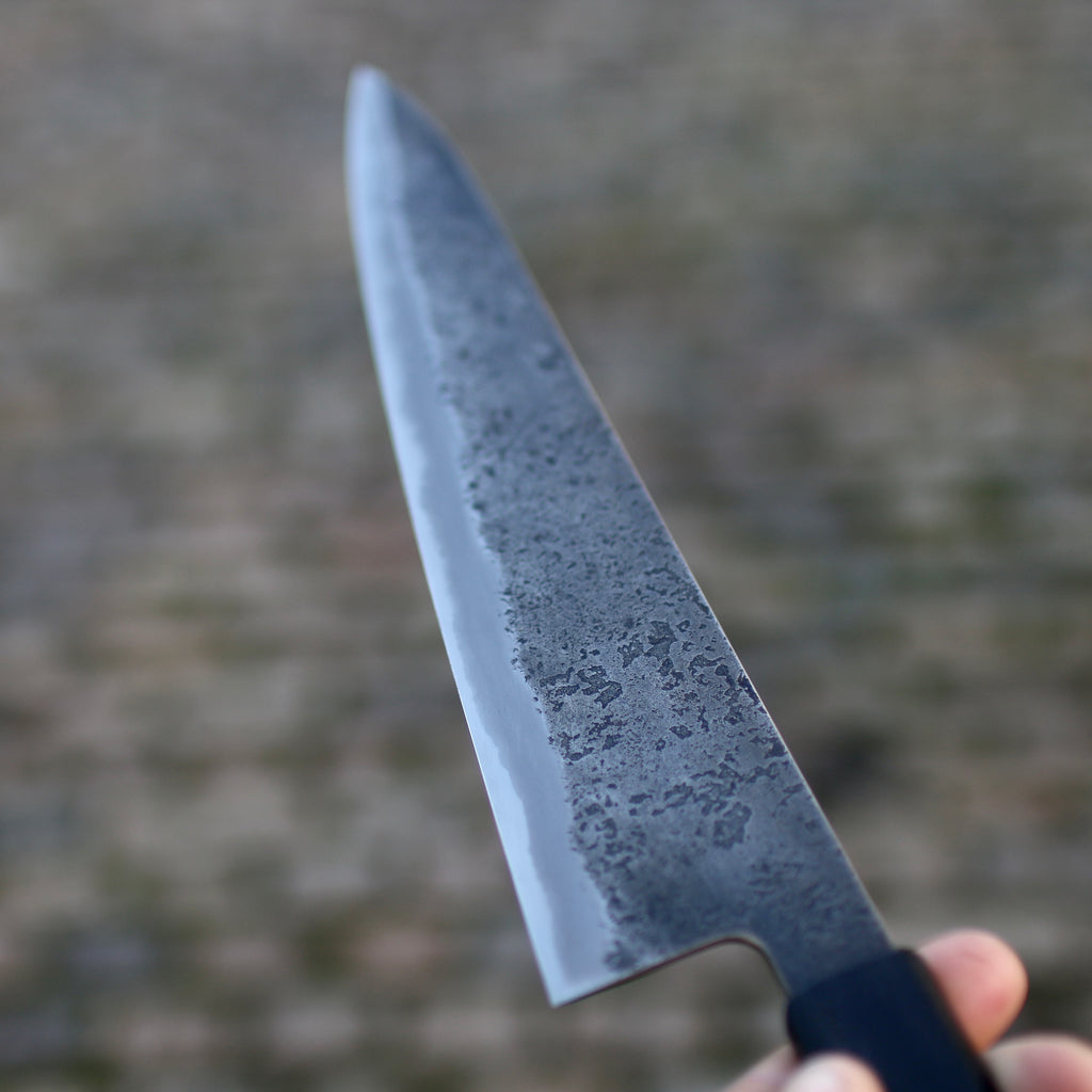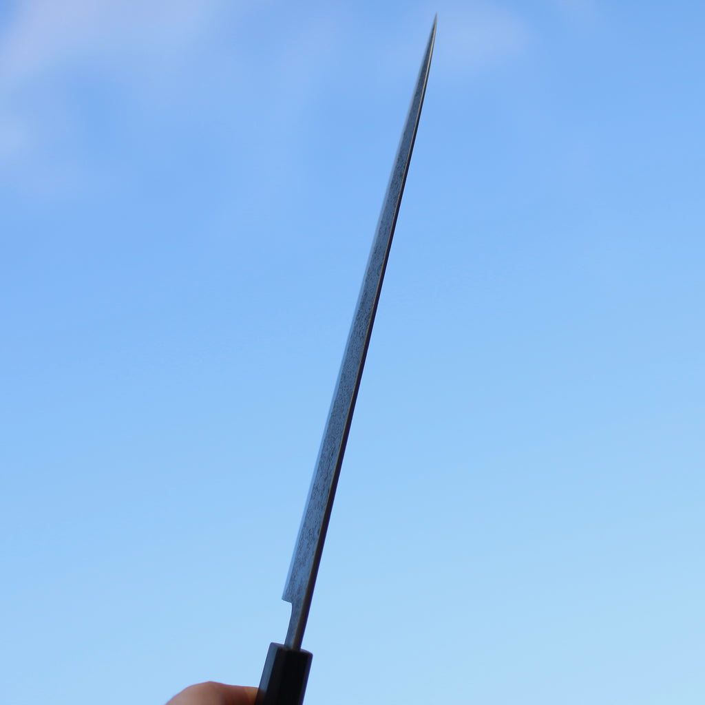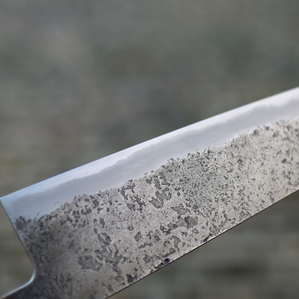 This Tetsu Gyuto feature a long blade, good distal taper, and thin tip. Flat profile with a slight curve toward the tip. The san-mai is made from C130 core steel with vintage wrought iron cladding. Forged to shape and to geometry the bevels are ground on water cooled grinding stone with a Kasumi finish.