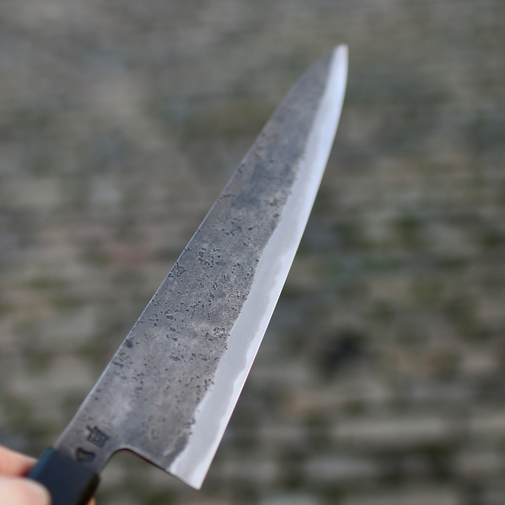 My blades are made from carbon steel not stainless steel, it gives my knives an unbeatable sharpness. I prefer carbon steel for it ease to sharpen, the fine edge it takes and the beautiful patina that will develop. You do, however, need to give carbon steel knives just a little extra care to keep them in top shape. There are trade-offs in everything. Claddings stated as "dirty wrought iron" will be very reactive.