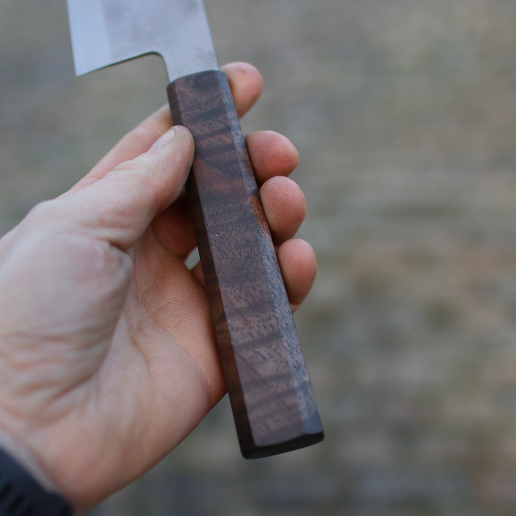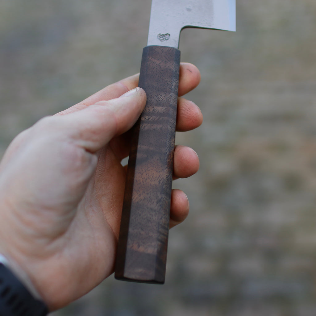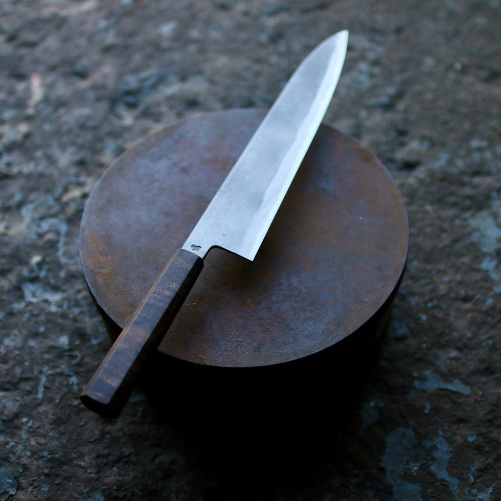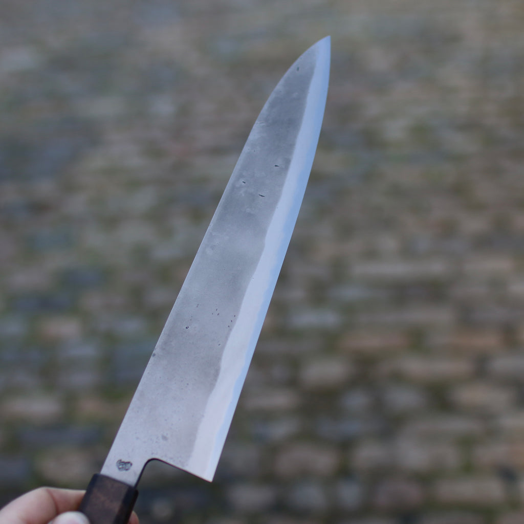 When stated, my knives bevels are ground and polished with Japanese whetstones. This allow an easy maintenance at home. For Sharpening service please contact Scott from www.sheffieldknifesharpening.com