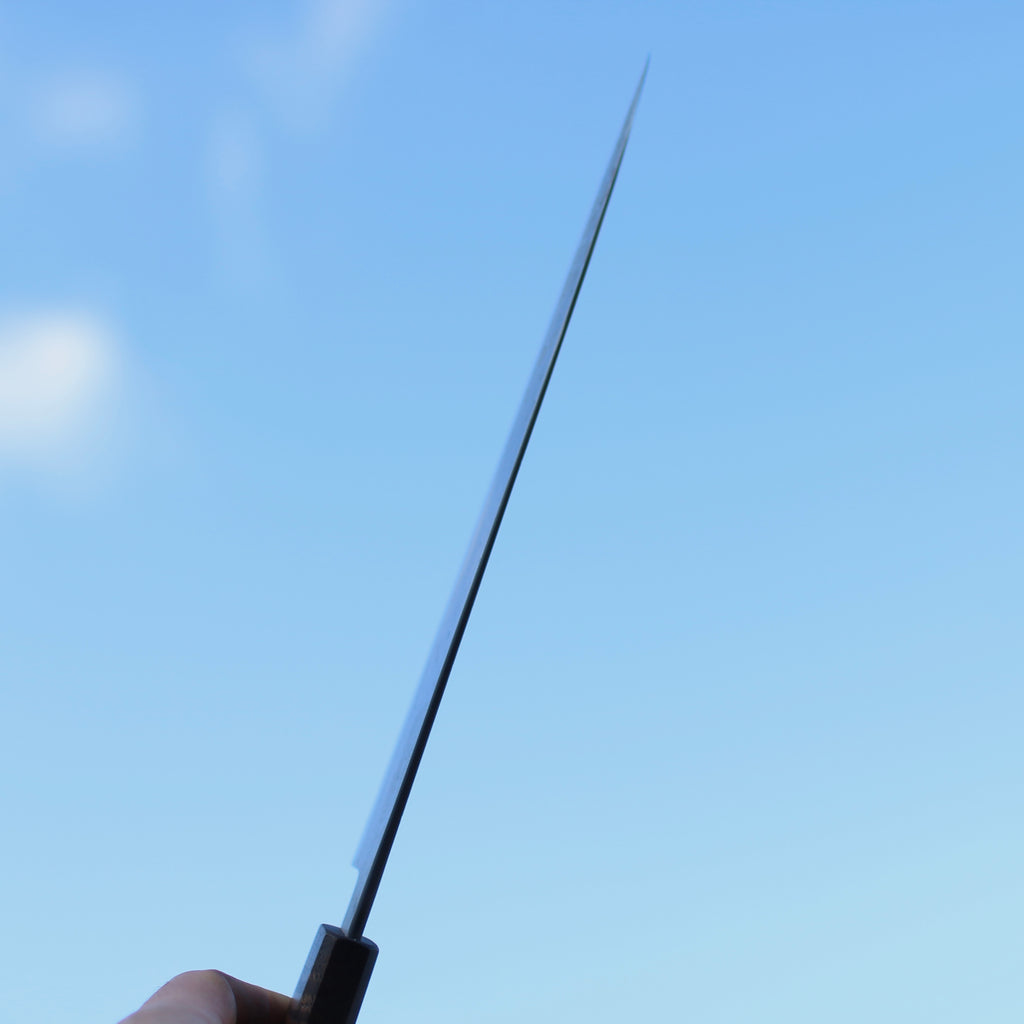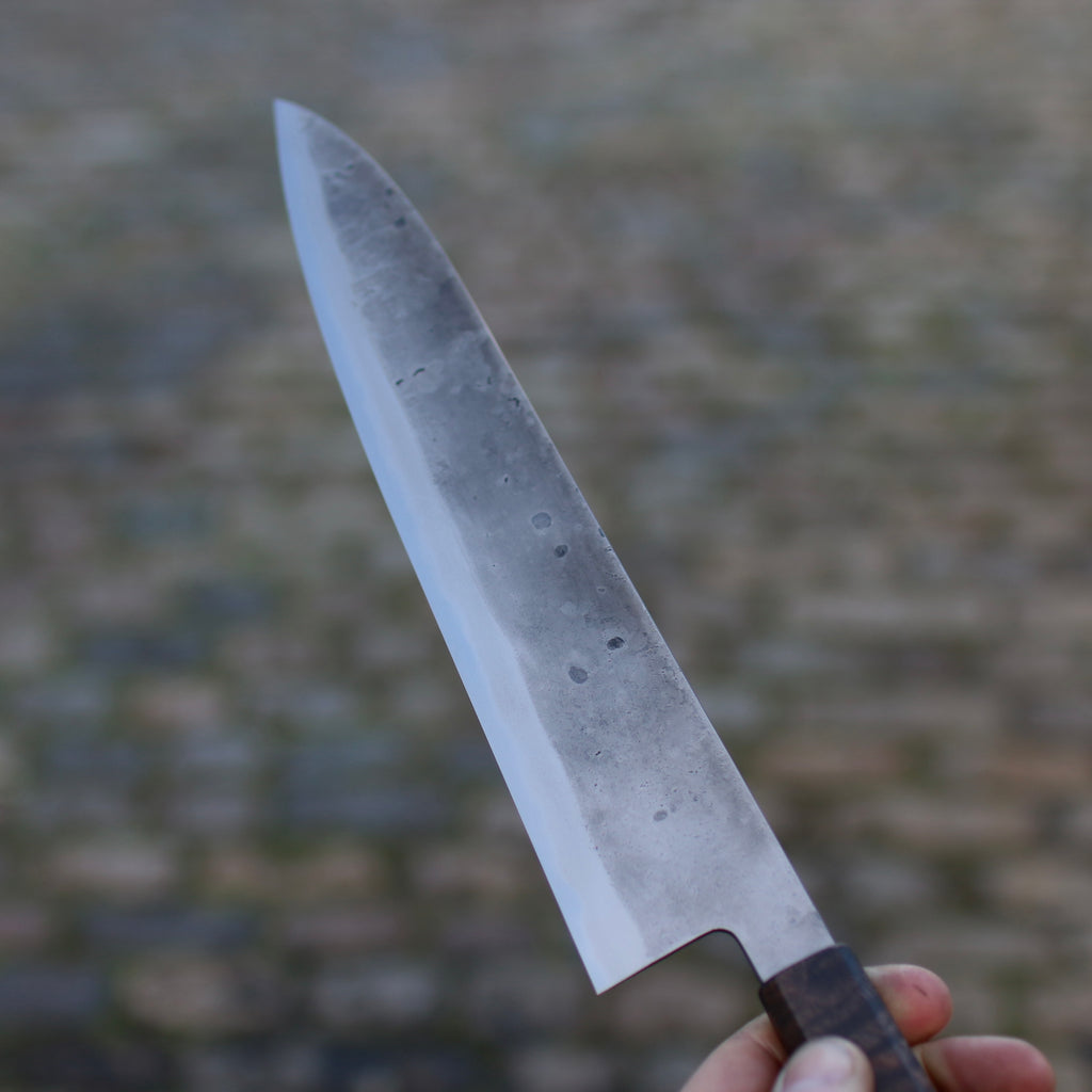 This Nashiji Gyuto feature a long blade, good distal taper, and thin tip. Flat profile with a slight curve toward the tip. The san-mai is made from 135Cr3 core steel with soft steel cladding. Forged to shape and to geometry the bevels are ground on water cooled grinding stone with a satin finish.