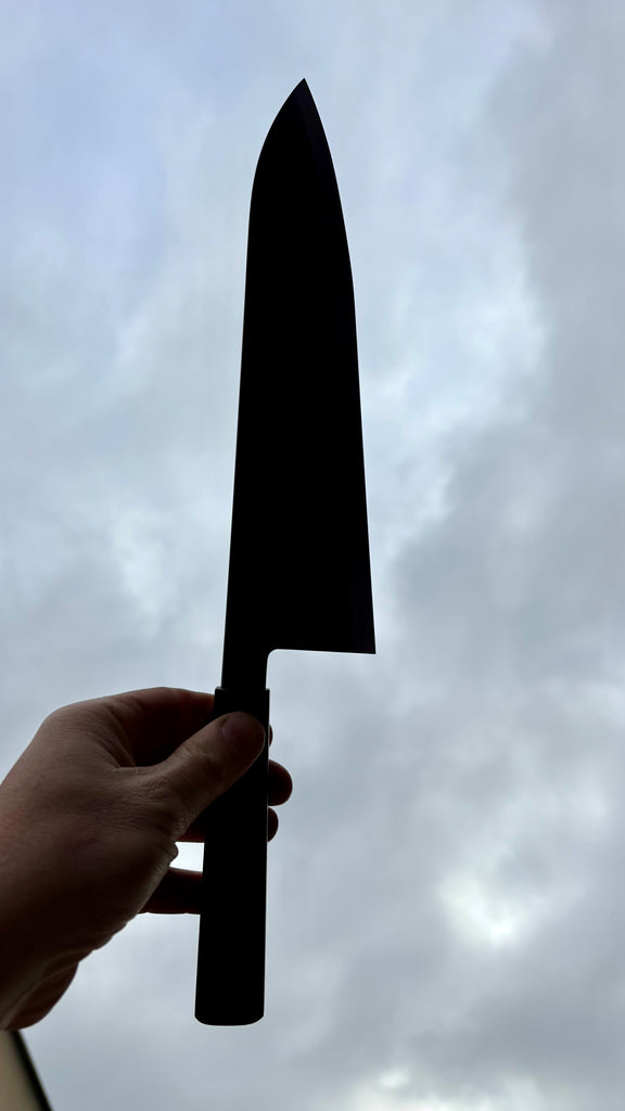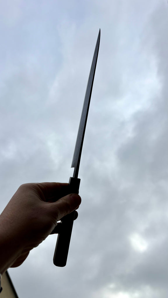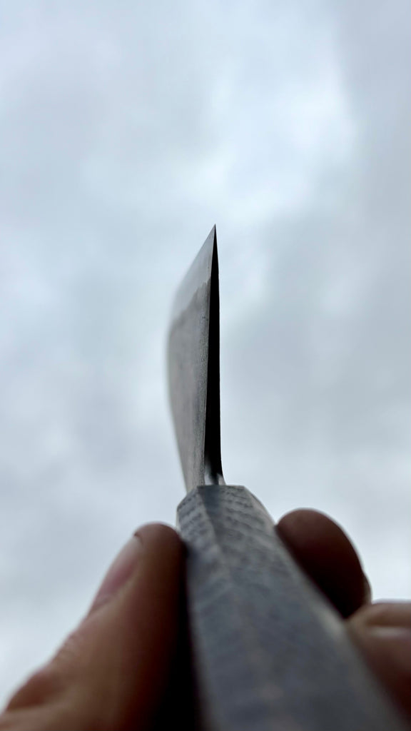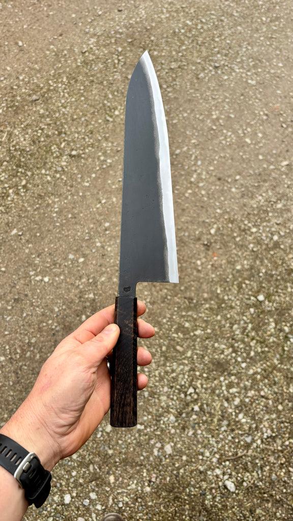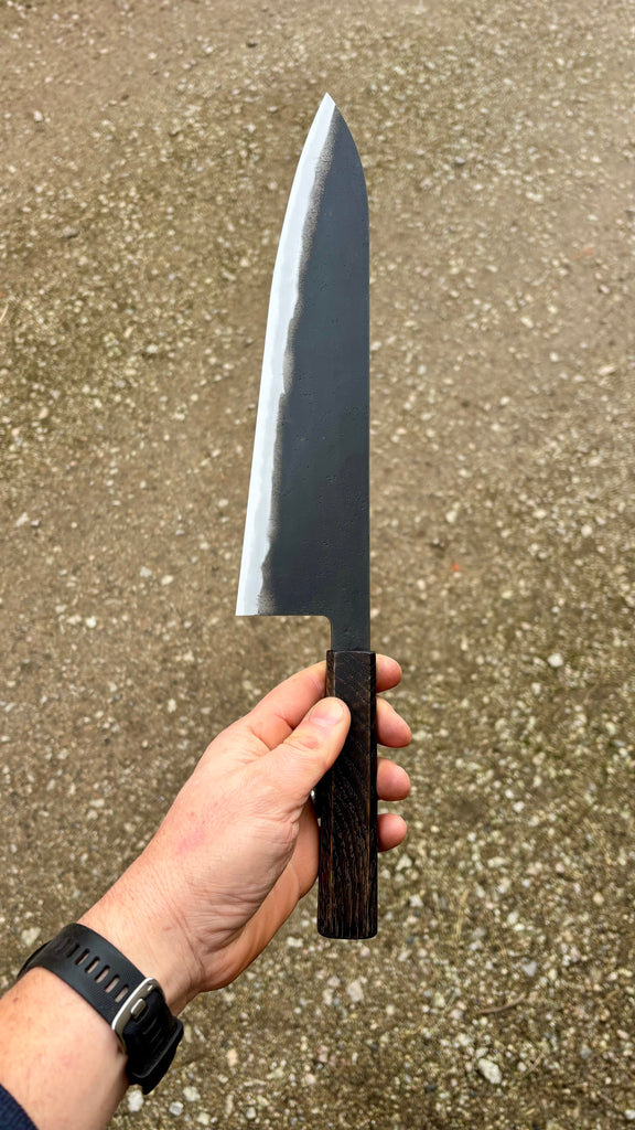 This Nishiji KU Gyuto feature a long and tall blade, good distal taper, and thin tip. Flat profile at the heel with a slight curve toward the tip. The San-mai is made from 135Cr3 steel core with soft steel cladding. Forged to shape and to geometry the blade is ground on water cooled grinding wheel.