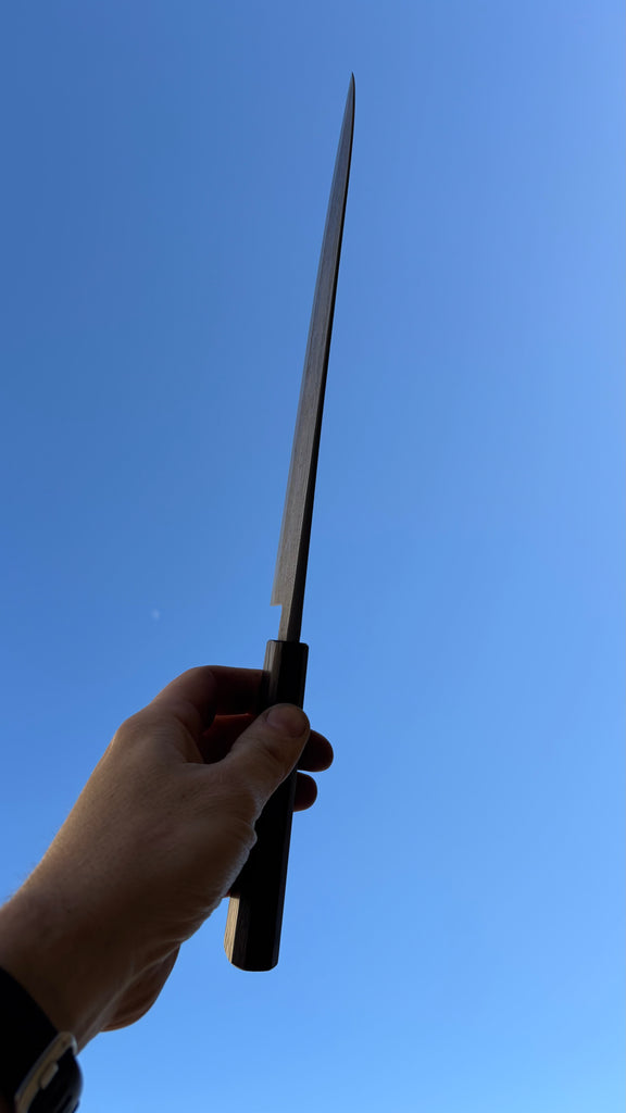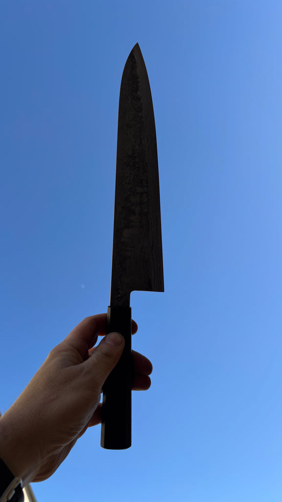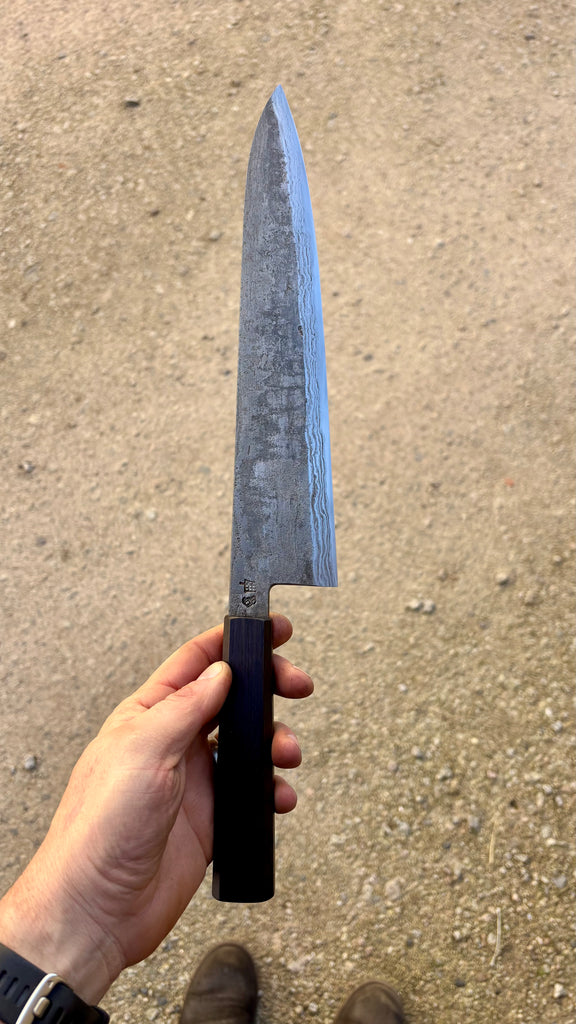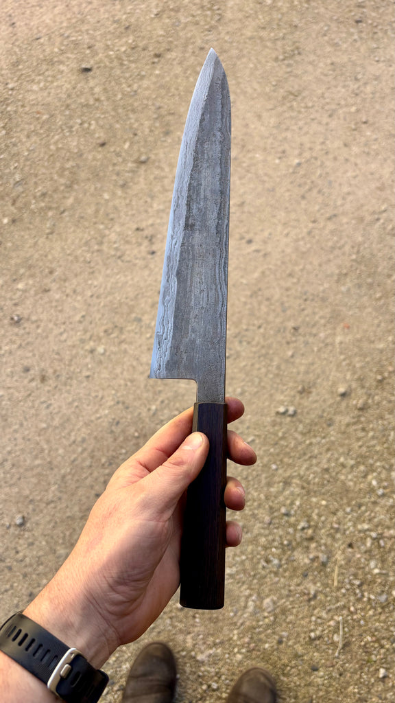 This Suminagashi Gyuto feature a long size blade, good distal taper, and thin tip. Flat profile at the heel with a slight curve toward the tip. The San-mai is made from 26C3 steel core with flat Suminagashi cladding. Forged to shape and to geometry the blade is ground on water cooled grinding wheel.