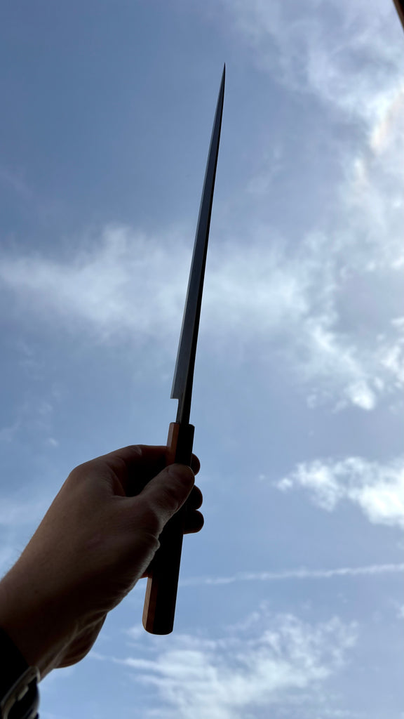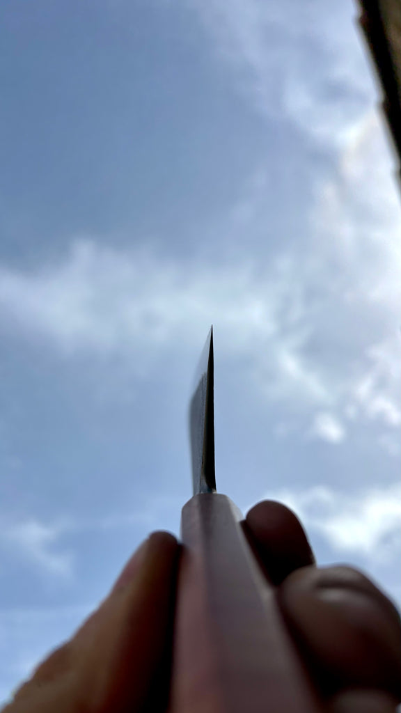 This Nishiji KU Gyuto feature a tall and long blade, good distal taper, thin tip. Flat profile at the heel with a slight curve toward the tip. The San-mai is made from 135Cr3 steel core with soft steel cladding. Forged to shape and to geometry the blade is ground on water cooled grinding wheel.