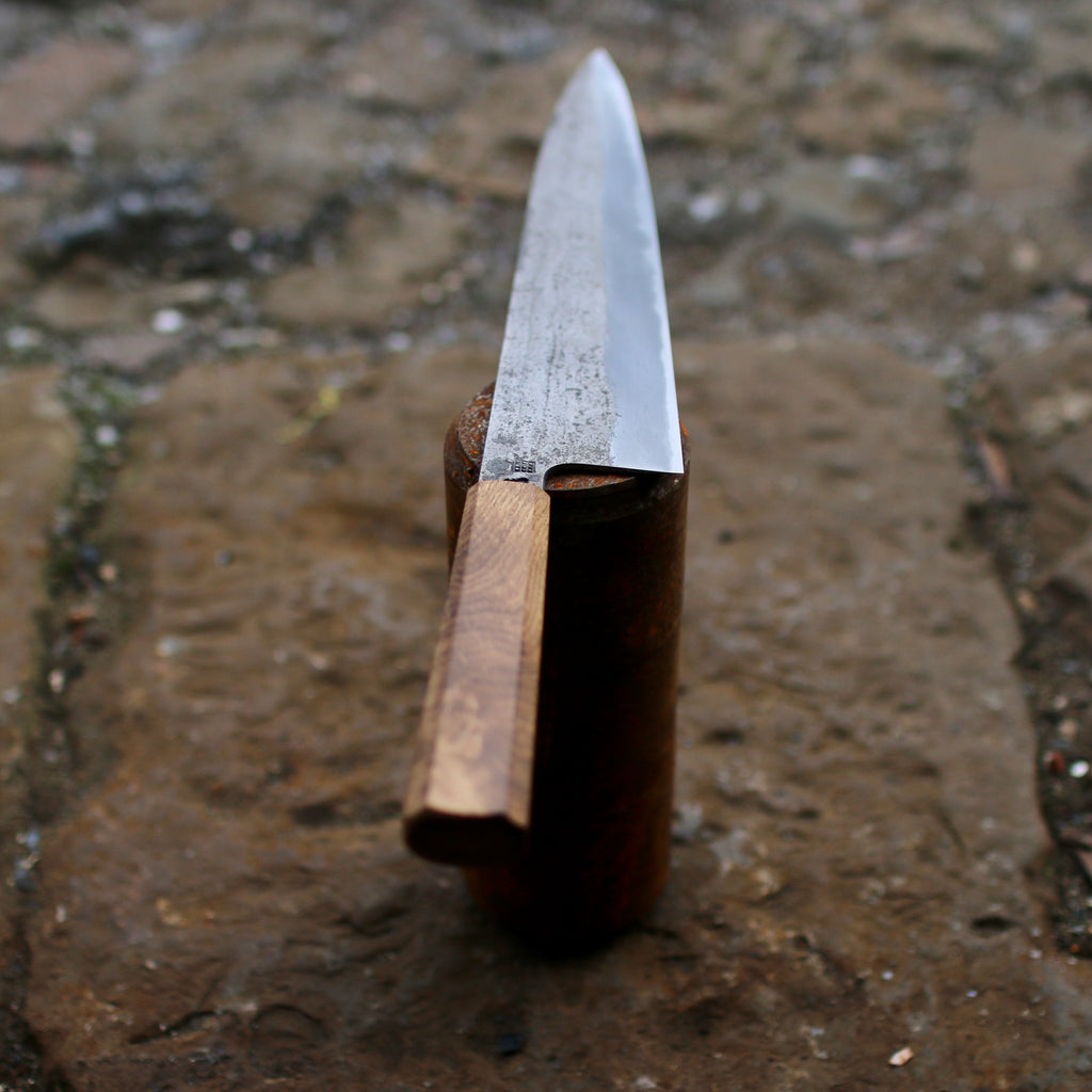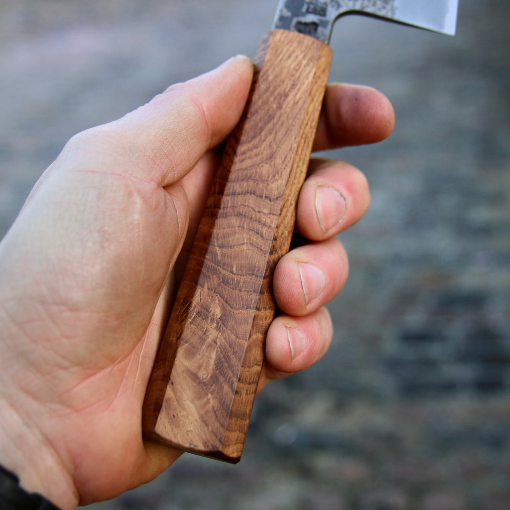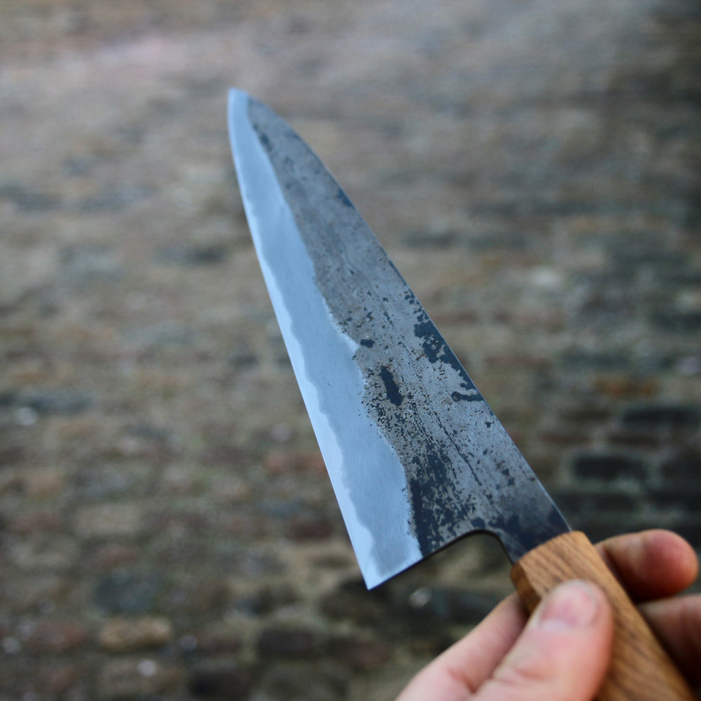 This Gyuto (Japanese chef knife) feature a flat heel, slight belly, tall bevel with a good distal taper and nimble tip. Shop made san-maï with 26C3 steel core and historic wrought iron cladding (Trash Knife Project). Forged to shape and to geometry the bevels are ground on water cooled grinding stone with a kasumi finish. The handle is made with English Oak.