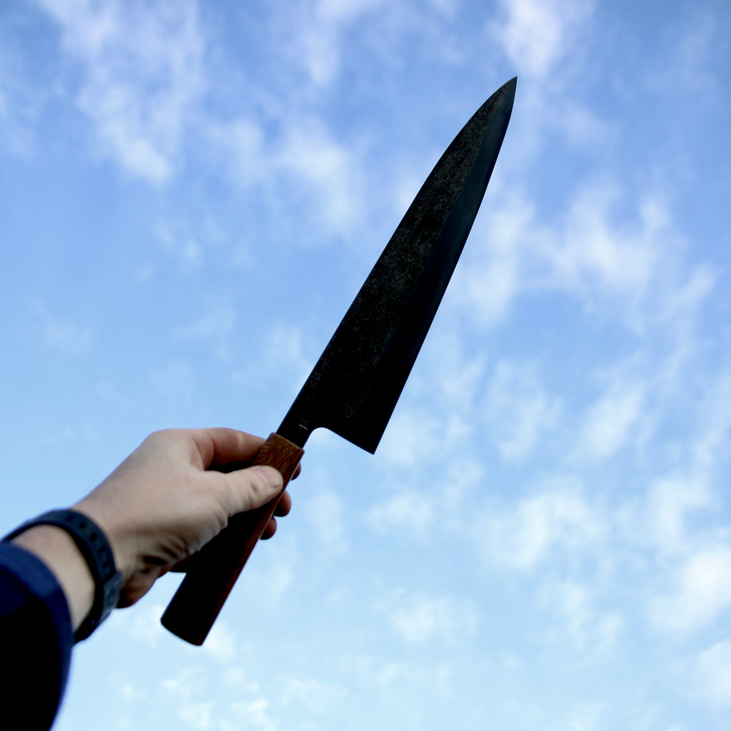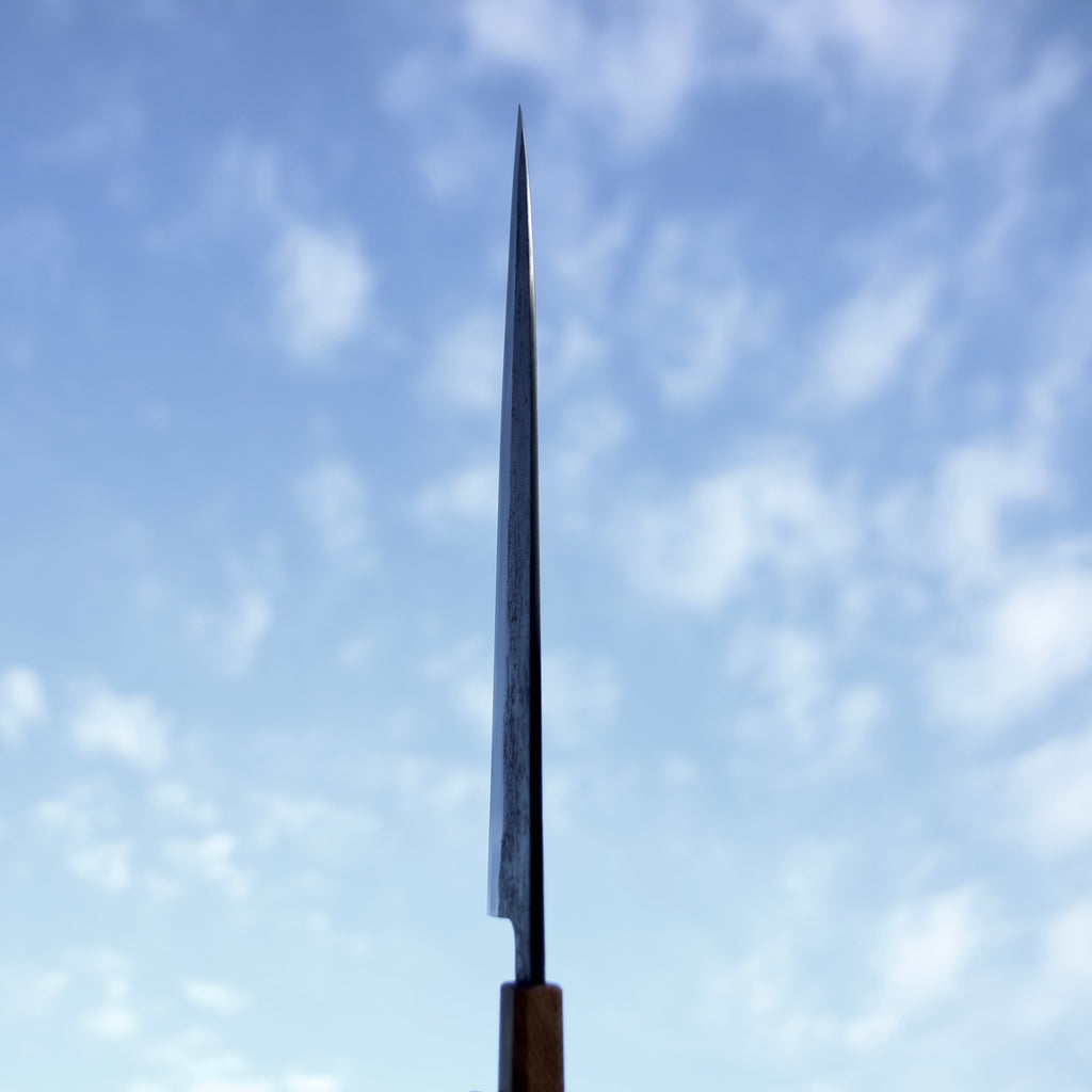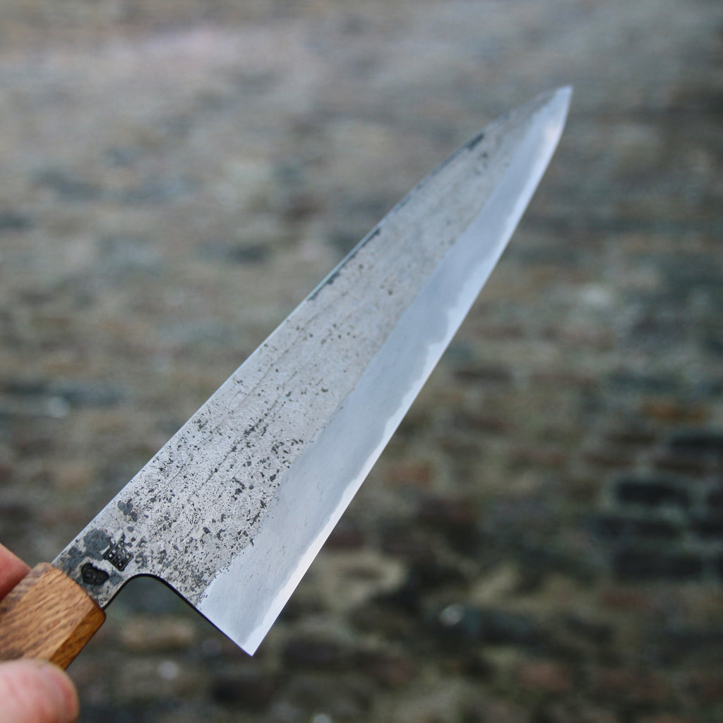 This Gyuto (Japanese chef knife) feature a flat heel, slight belly, tall bevel with a good distal taper and nimble tip. Shop made san-maï with 26C3 steel core and historic wrought iron cladding (Trash Knife Project). Forged to shape and to geometry the bevels are ground on water cooled grinding stone with a kasumi finish. The handle is made with English Oak.