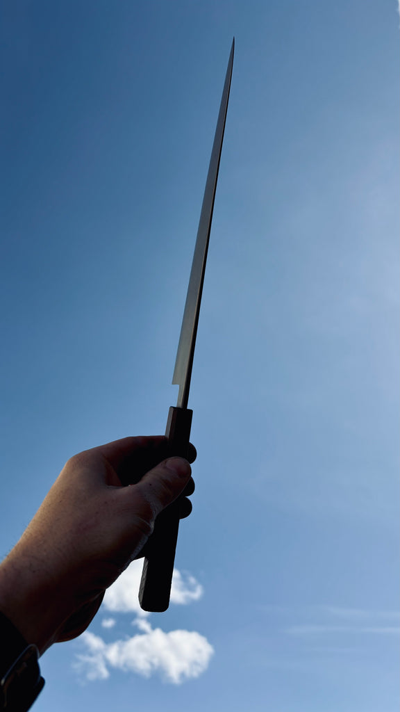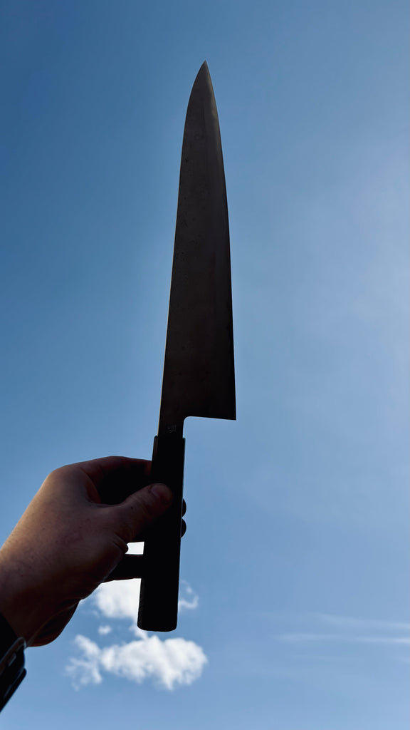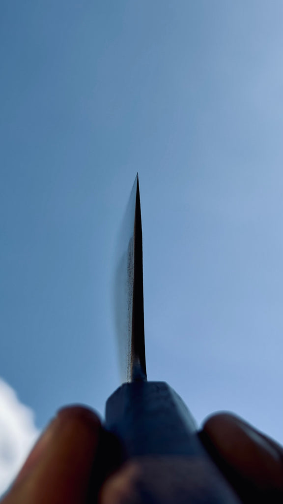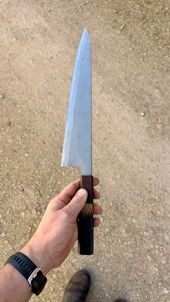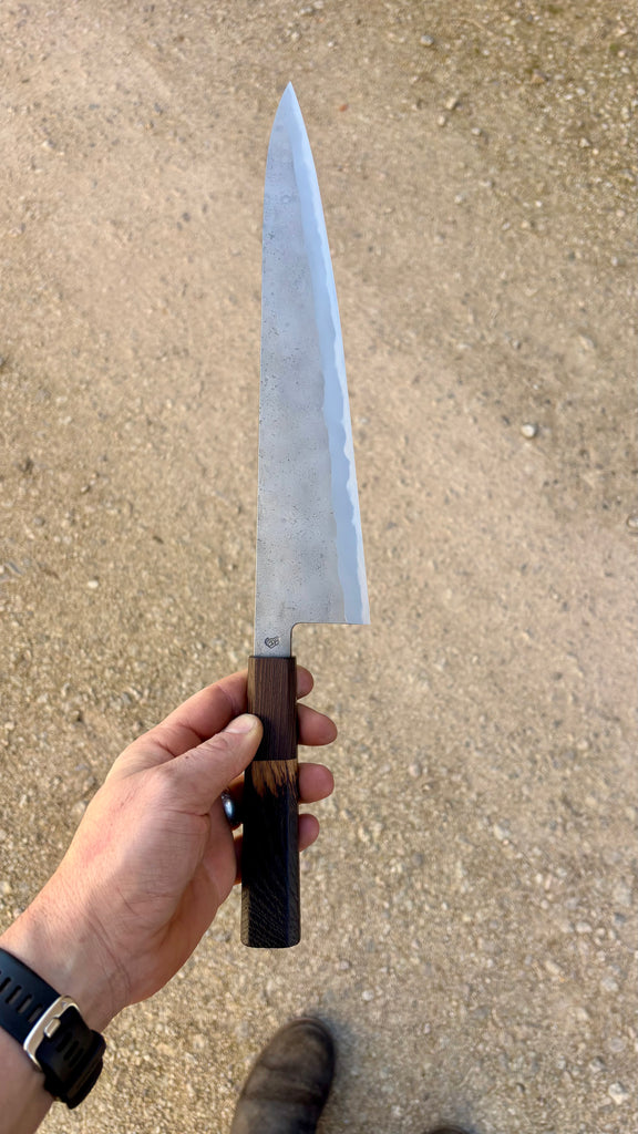 This Nishiji Gyuto feature a long blade, good distal taper, and thin tip. Flat profile at the heel with a slight curve toward the tip. The San-mai is made from 135Cr3 steel core with soft steel cladding. Forged to shape and to geometry the blade is ground on water cooled grinding wheel.
