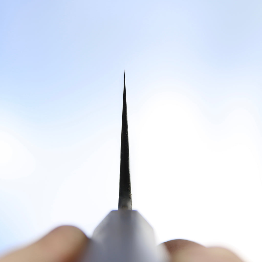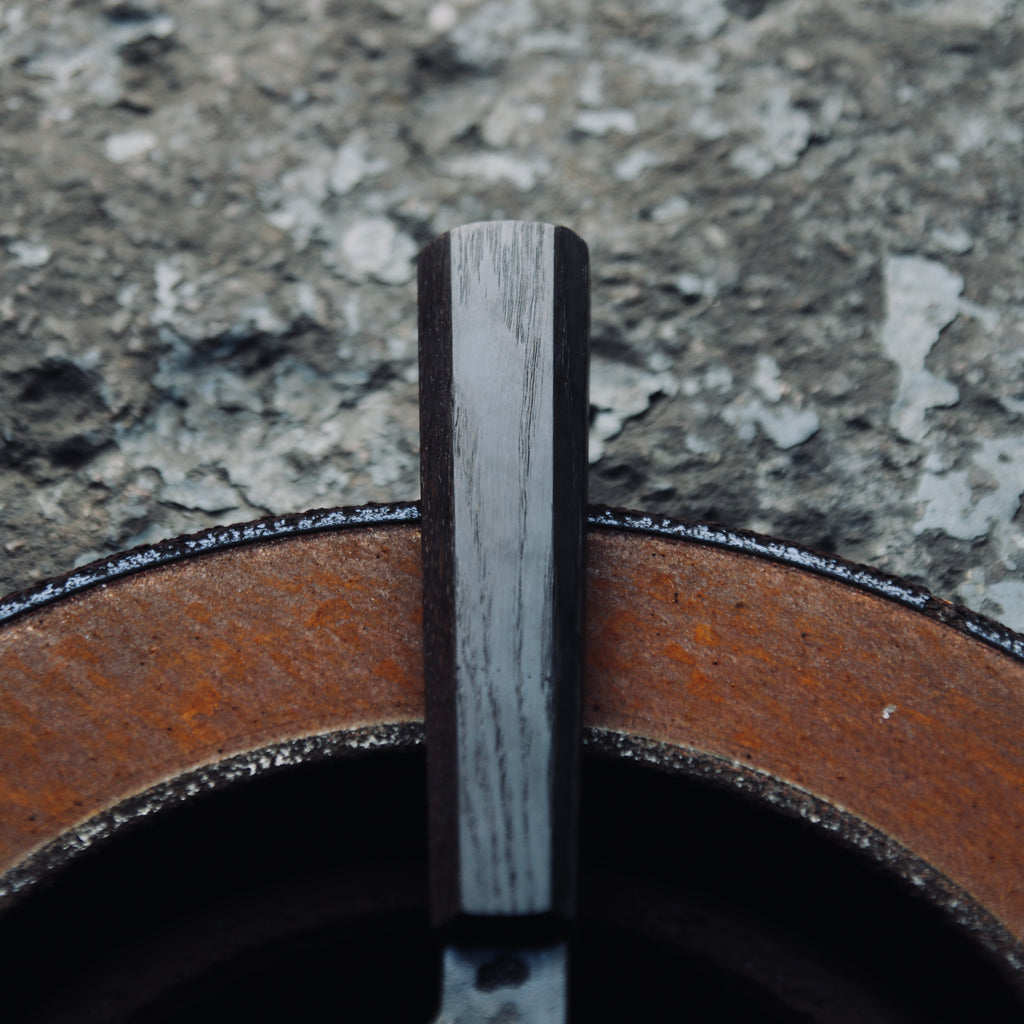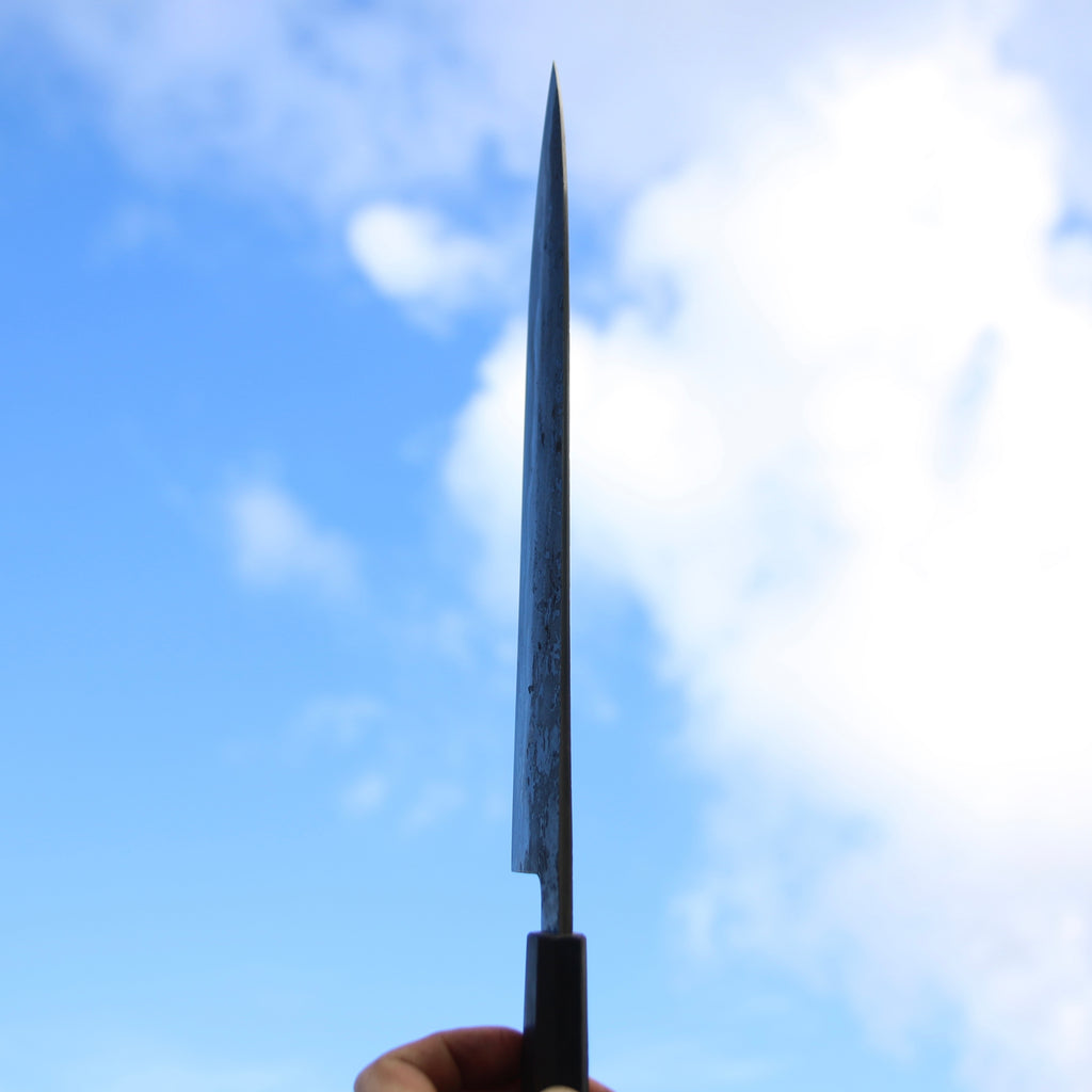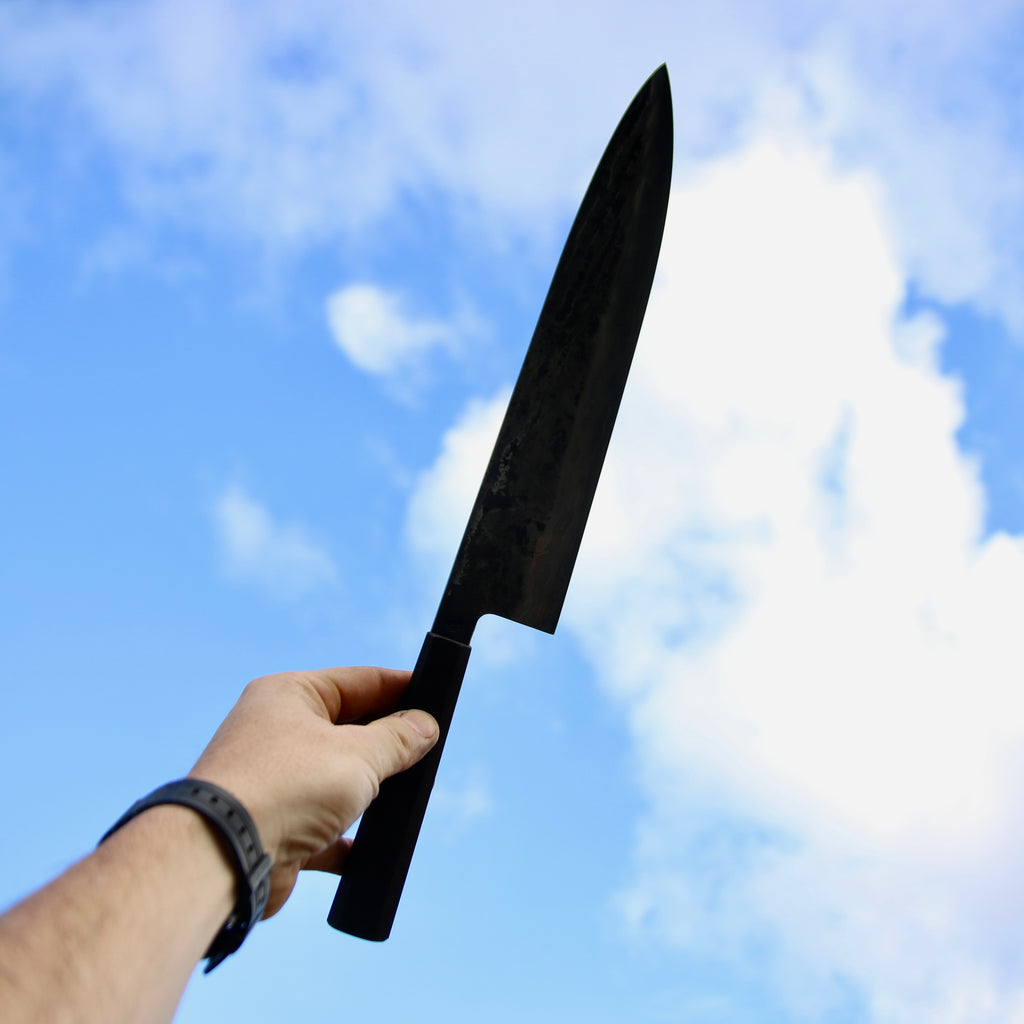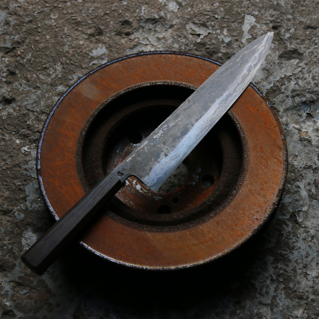 My blades are made from carbon steel not stainless steel, it gives my knives an unbeatable sharpness. I prefer carbon steel for it ease to sharpen, the fine edge it takes and the beautiful patina that will develop. You do, however, need to give carbon steel knives just a little extra care to keep them in top shape. There are trade-offs in everything.