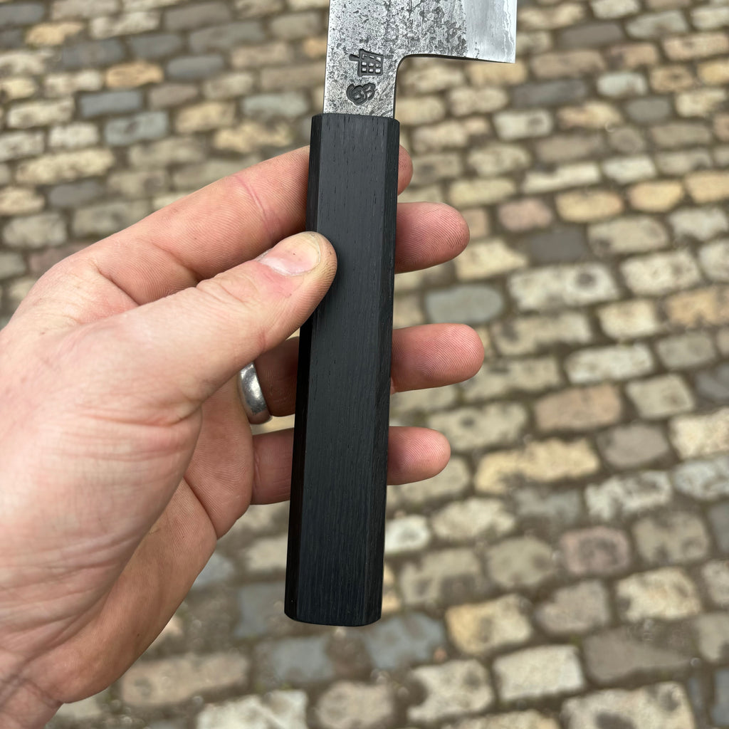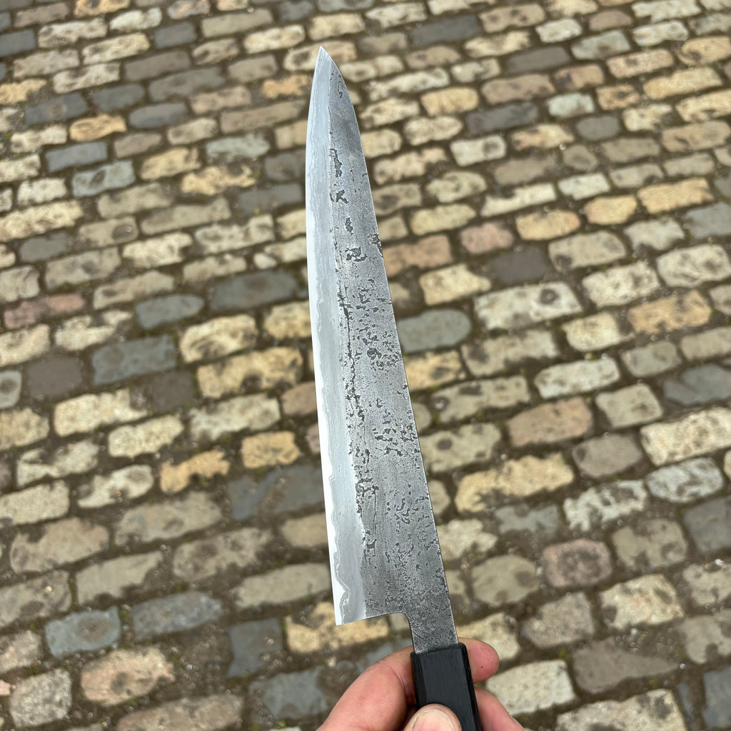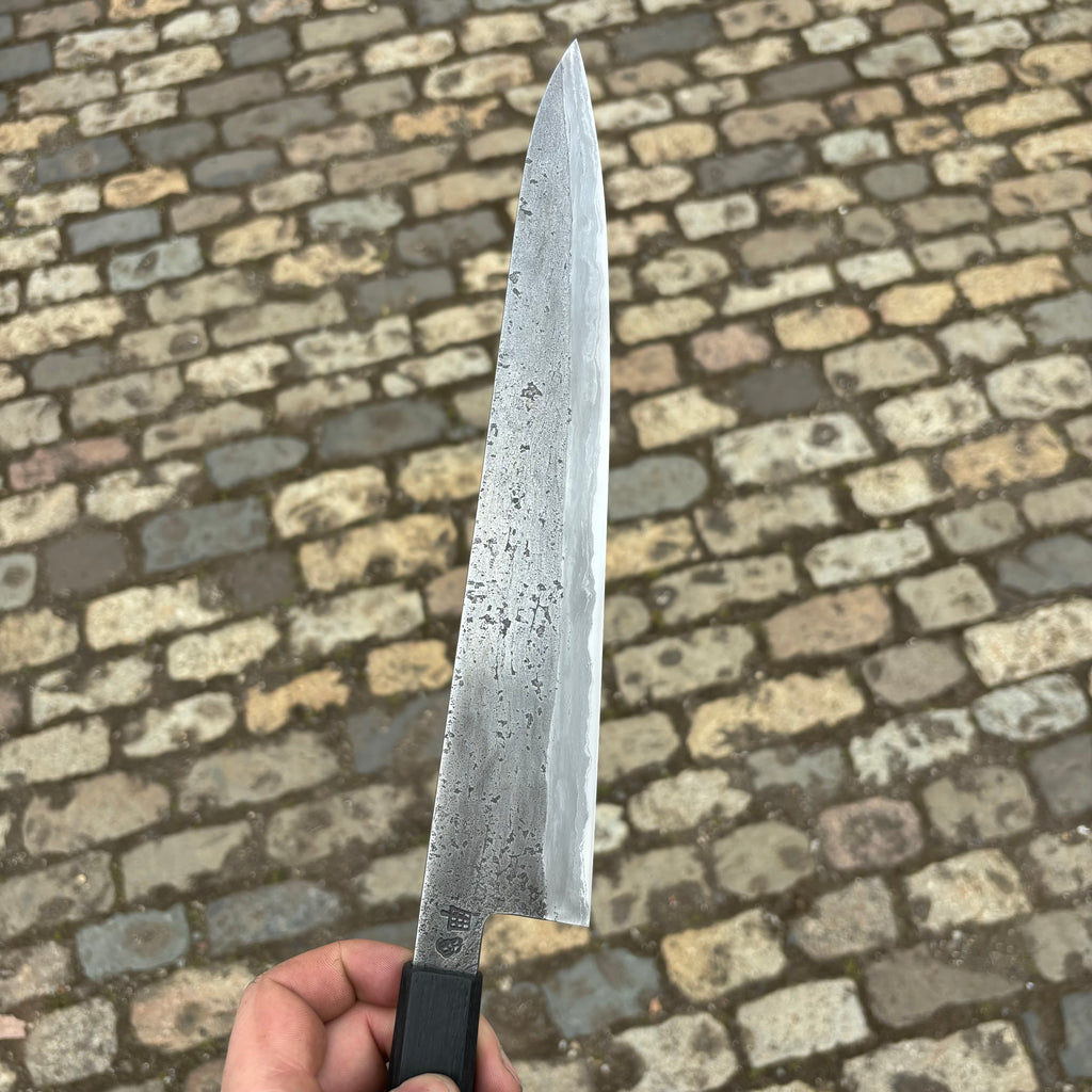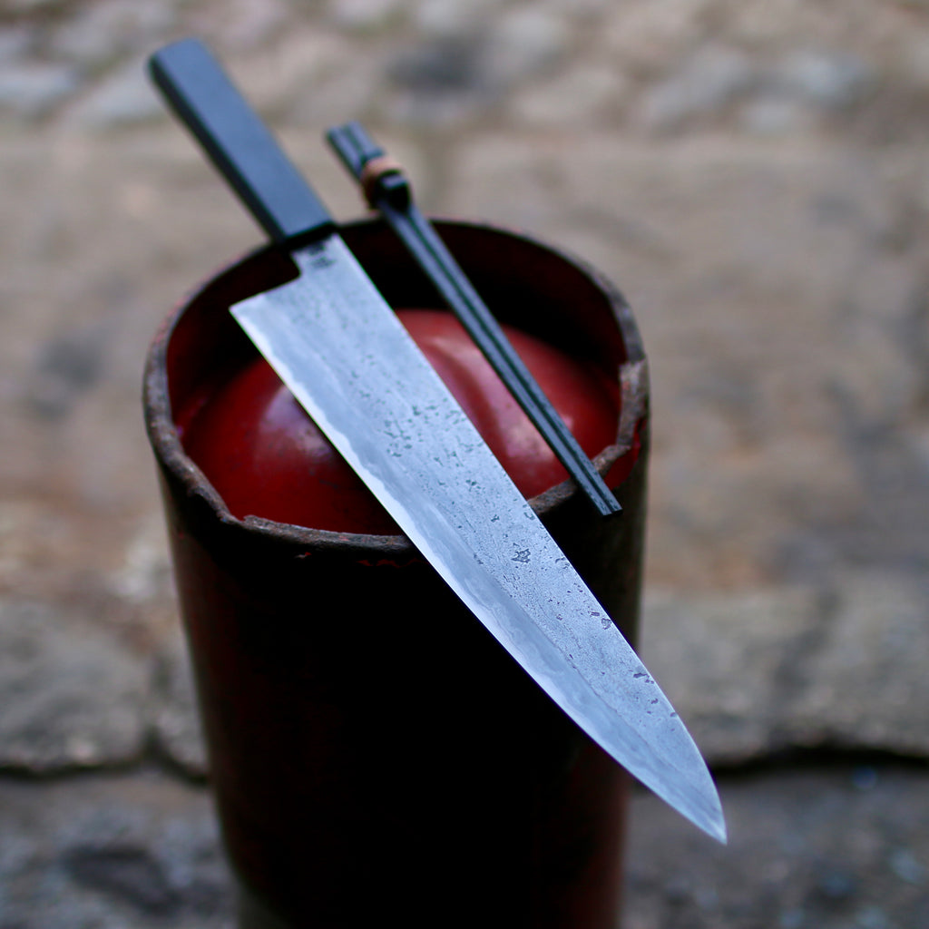 This long Gyuto is a collaboration between Steve from Rock Chop Knives Co and myself. I forged and handled the blade, Steve ground and polished the bevels. It feature a long blade, good distal taper, and thin tip. Flat profile with a slight curve toward the tip. The san-mai is made from Shirogami 1 steel core with wrought iron cladding. Forged to shape and to geometry the blade is ground on water cooled grinding wheel with a 9 stones progression kasumi finish.