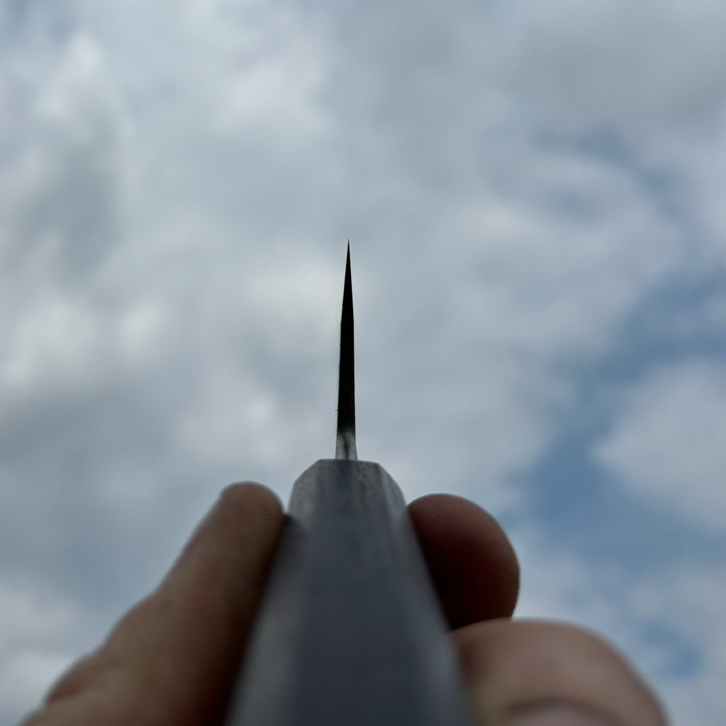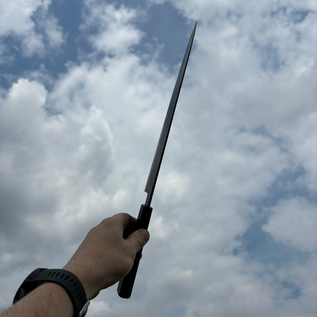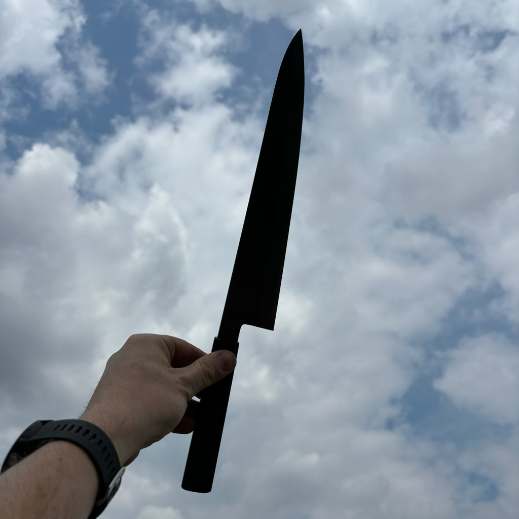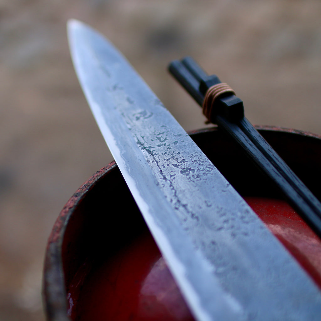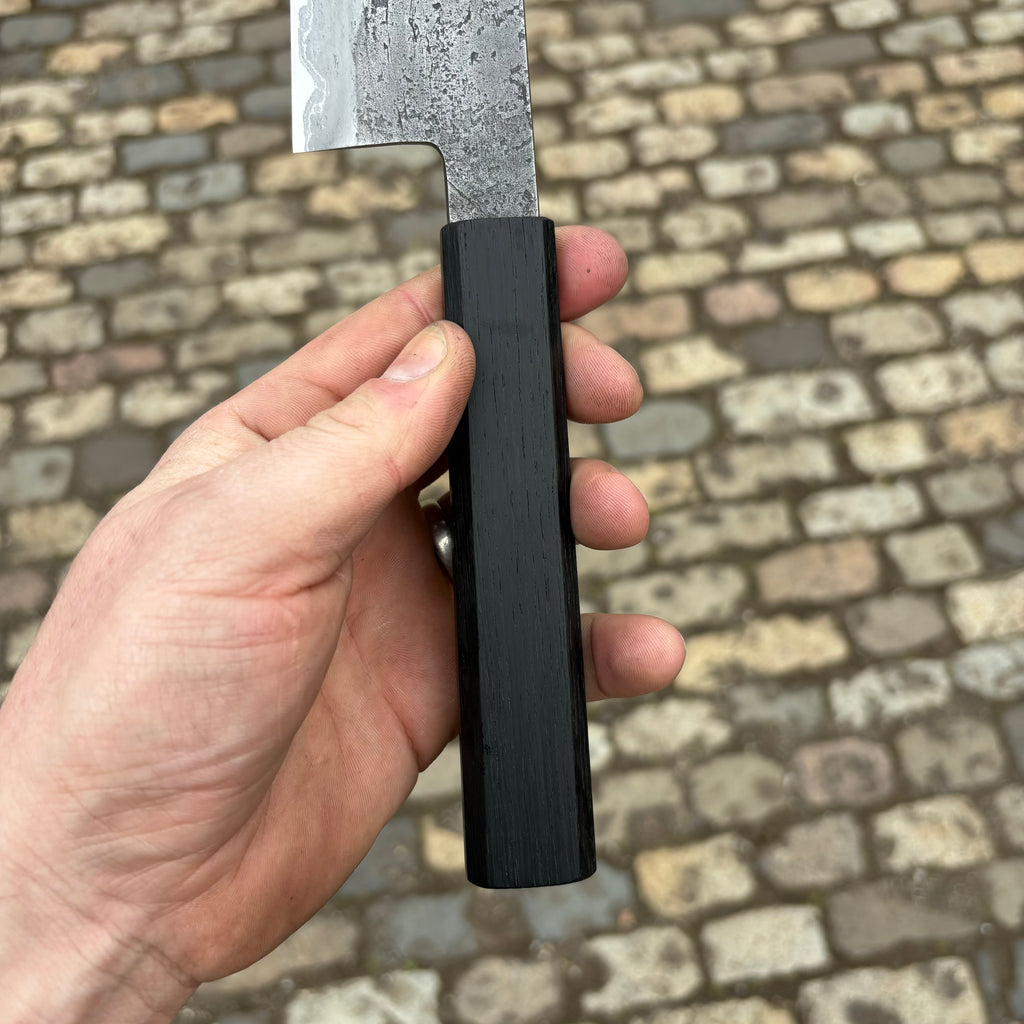This long Gyuto is a collaboration between Steve from Rock Chop Knives Co and myself. I forged and handled the blade, Steve ground and polished the bevels. It feature a long blade, good distal taper, and thin tip. Flat profile with a slight curve toward the tip. The san-mai is made from Shirogami 1 steel core with wrought iron cladding. Forged to shape and to geometry the blade is ground on water cooled grinding wheel with a 9 stones progression kasumi finish.