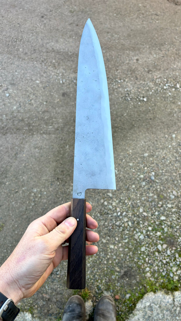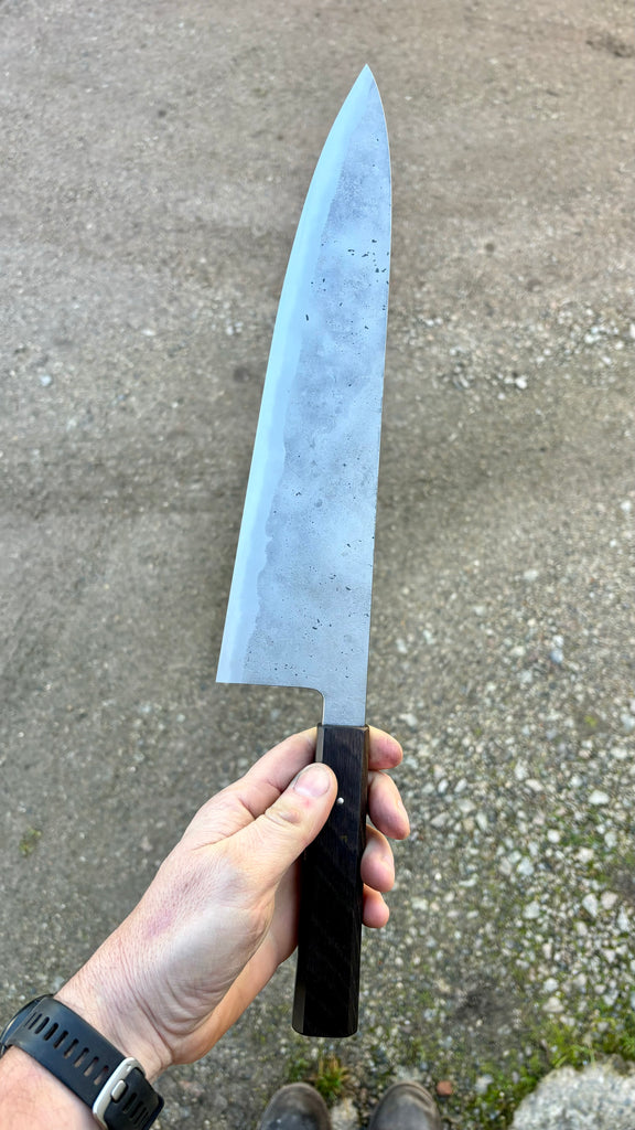 This Nishiji massive Gyuto feature a long and tall blade, good distal taper, and thin tip. Flat ish profile with a curve toward the tip. The San-mai is made from Shirogami 1 steel core with soft steel cladding. Forged to shape and to geometry the blade is ground on water cooled grinding wheel with a satin finish.