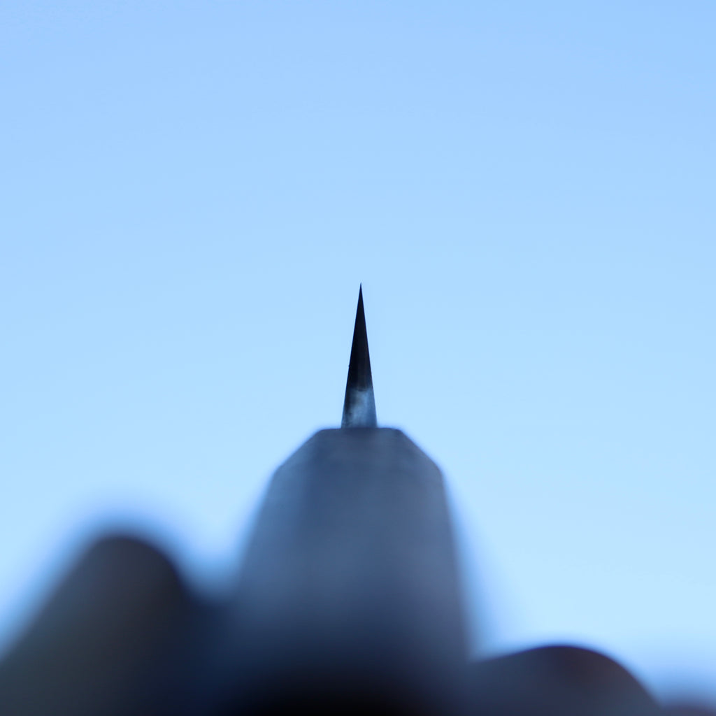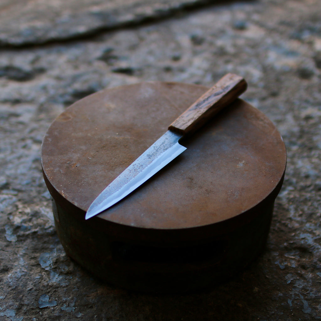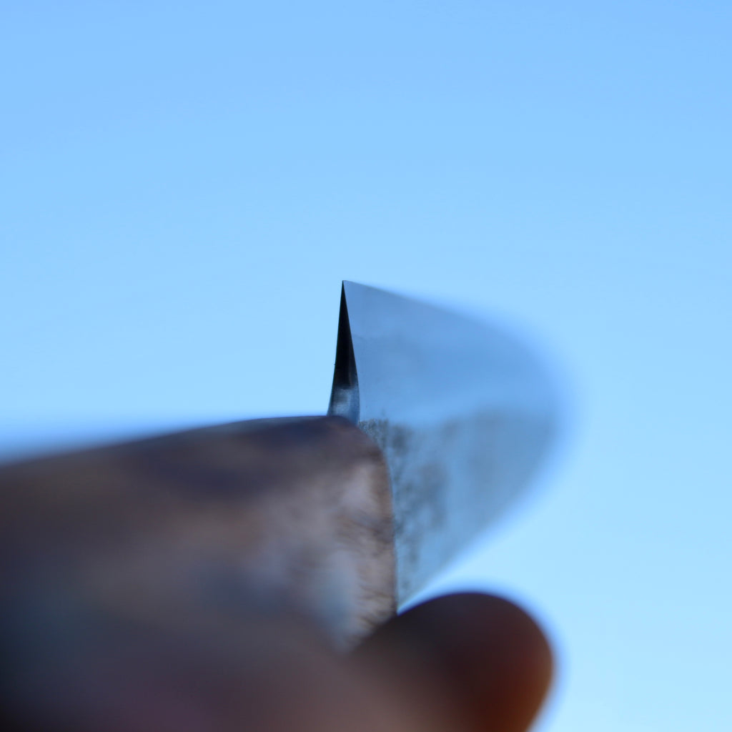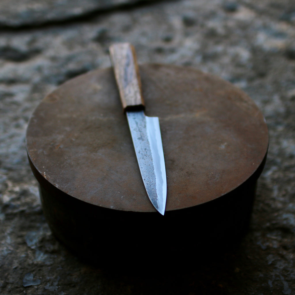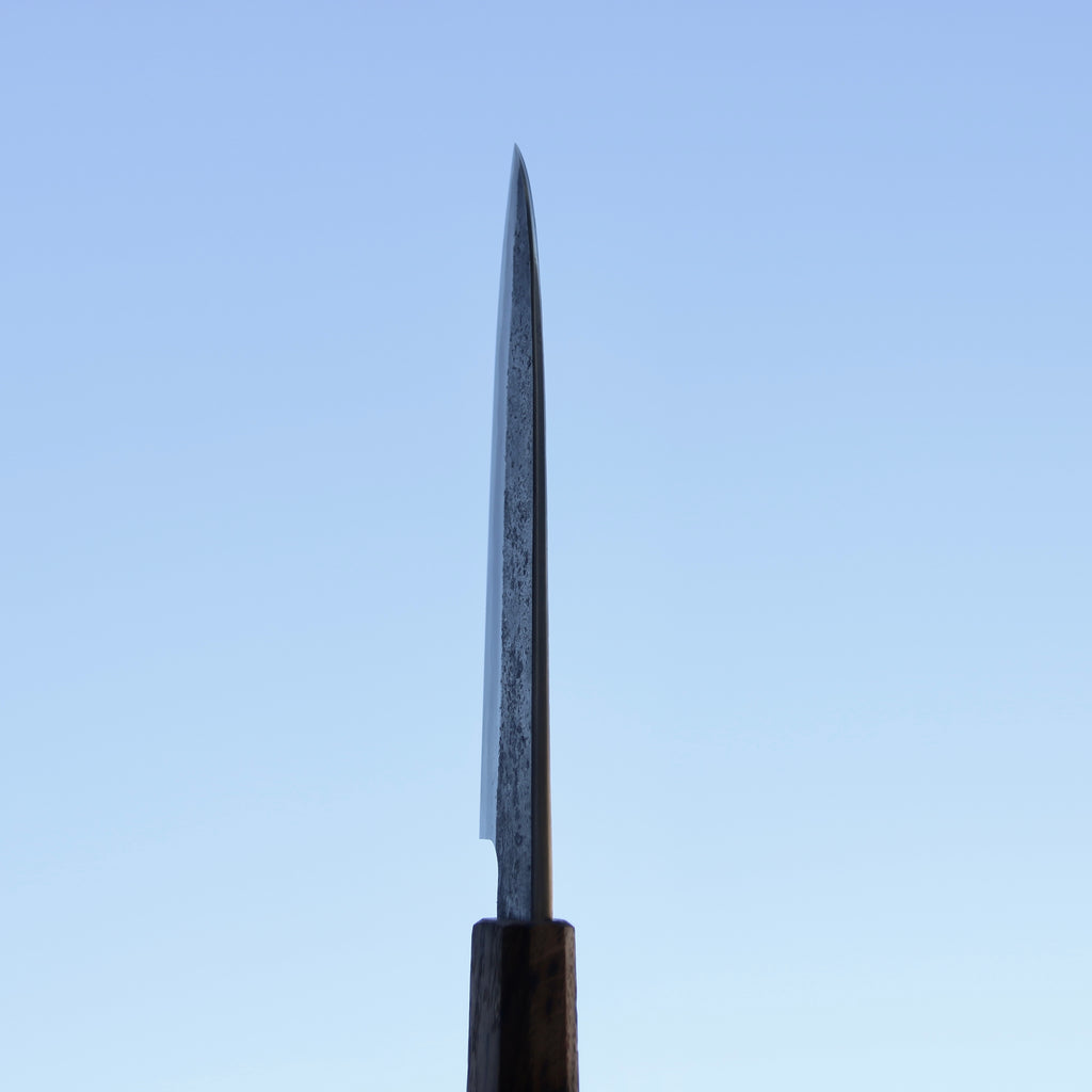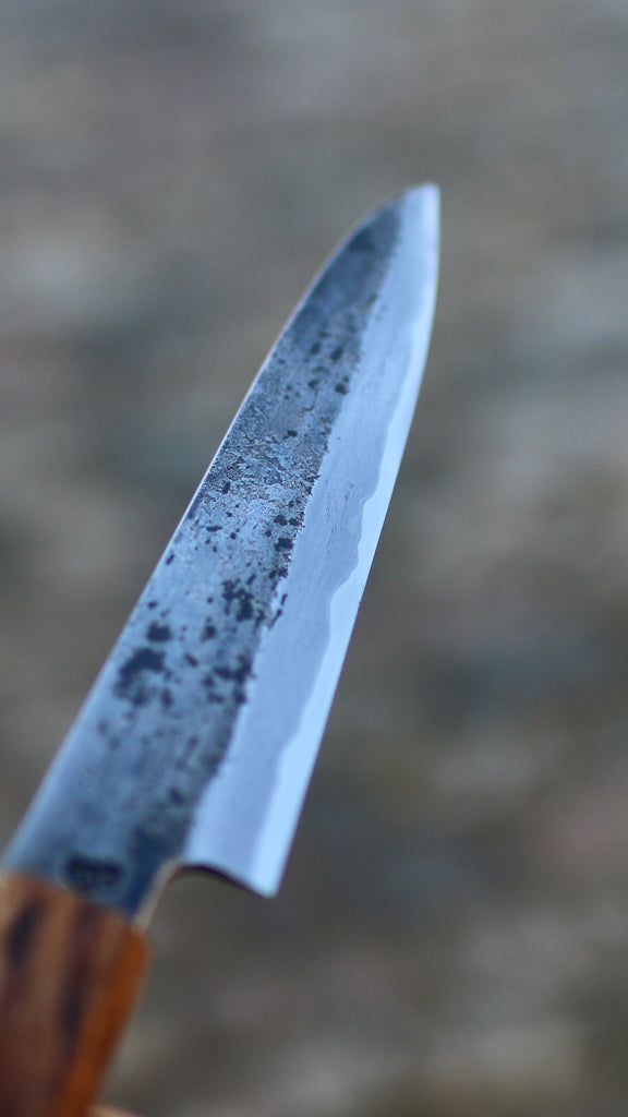 My blades are made from carbon steel not stainless steel, it gives my knives an unbeatable sharpness. I prefer carbon steel for it ease to sharpen, the fine edge it takes and the beautiful patina that will develop. You do, however, need to give carbon steel knives just a little extra care to keep them in top shape. There are trade-offs in everything.