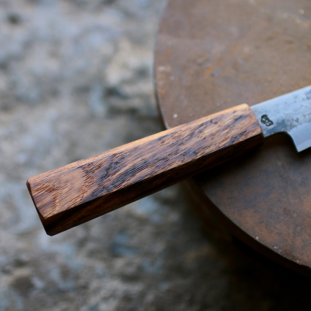 This San-maï Honesuki (Japanese butcher knife) feature a thick blade, good distal taper and nimble tip. It give to this blade a good maneuverability and resistance to work around bones. Confortable pinch grip with the polished spine and choil as well as the Emoto. The brown English Oak Wa handle compliment the blade.