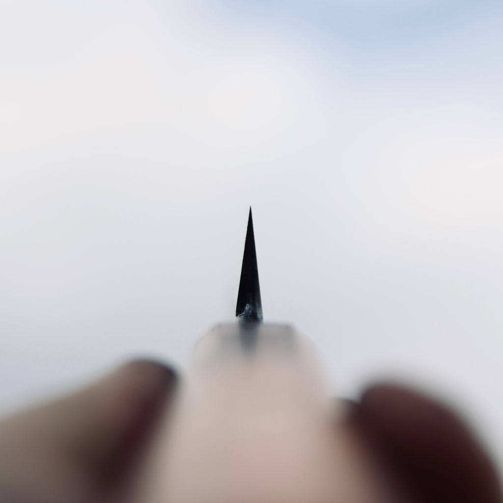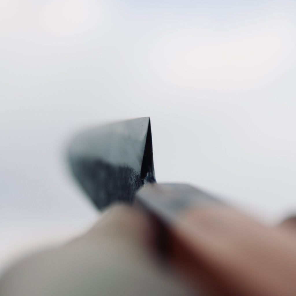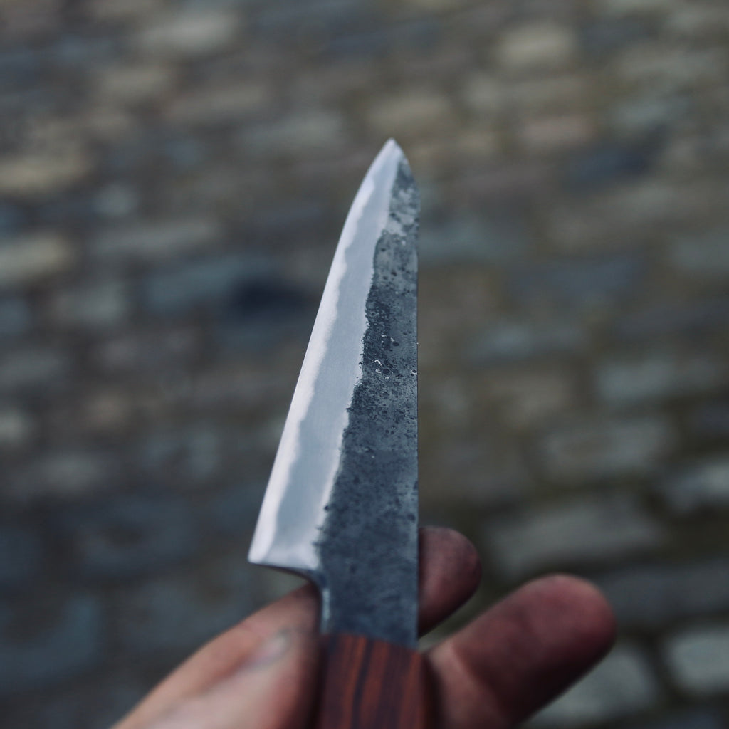 My blades are made from carbon steel not stainless steel, it gives my knives an unbeatable sharpness. I prefer carbon steel for it ease to sharpen, the fine edge it takes and the beautiful patina that will develop. You do, however, need to give carbon steel knives just a little extra care to keep them in top shape. There are trade-offs in everything.