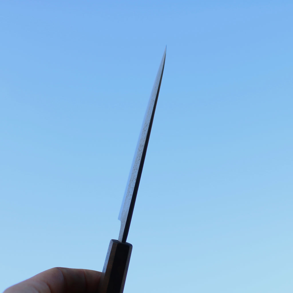 This Nashiji Honesuki feature a short and thick blade, good distal taper, and thin tip. Flat profile with a slight curve toward the tip. The san-mai is made from 26C3 core steel with soft steel cladding. Forged to shape and to geometry the bevels are ground on water cooled grinding stone with a satin finish.