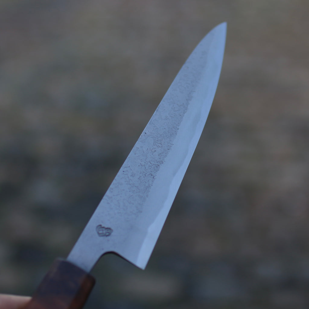 My blades are made from carbon steel not stainless steel, it gives my knives an unbeatable sharpness. I prefer carbon steel for it ease to sharpen, the fine edge it takes and the beautiful patina that will develop. You do, however, need to give carbon steel knives just a little extra care to keep them in top shape. There are trade-offs in everything. Claddings stated as "dirty wrought iron" will be very reactive.