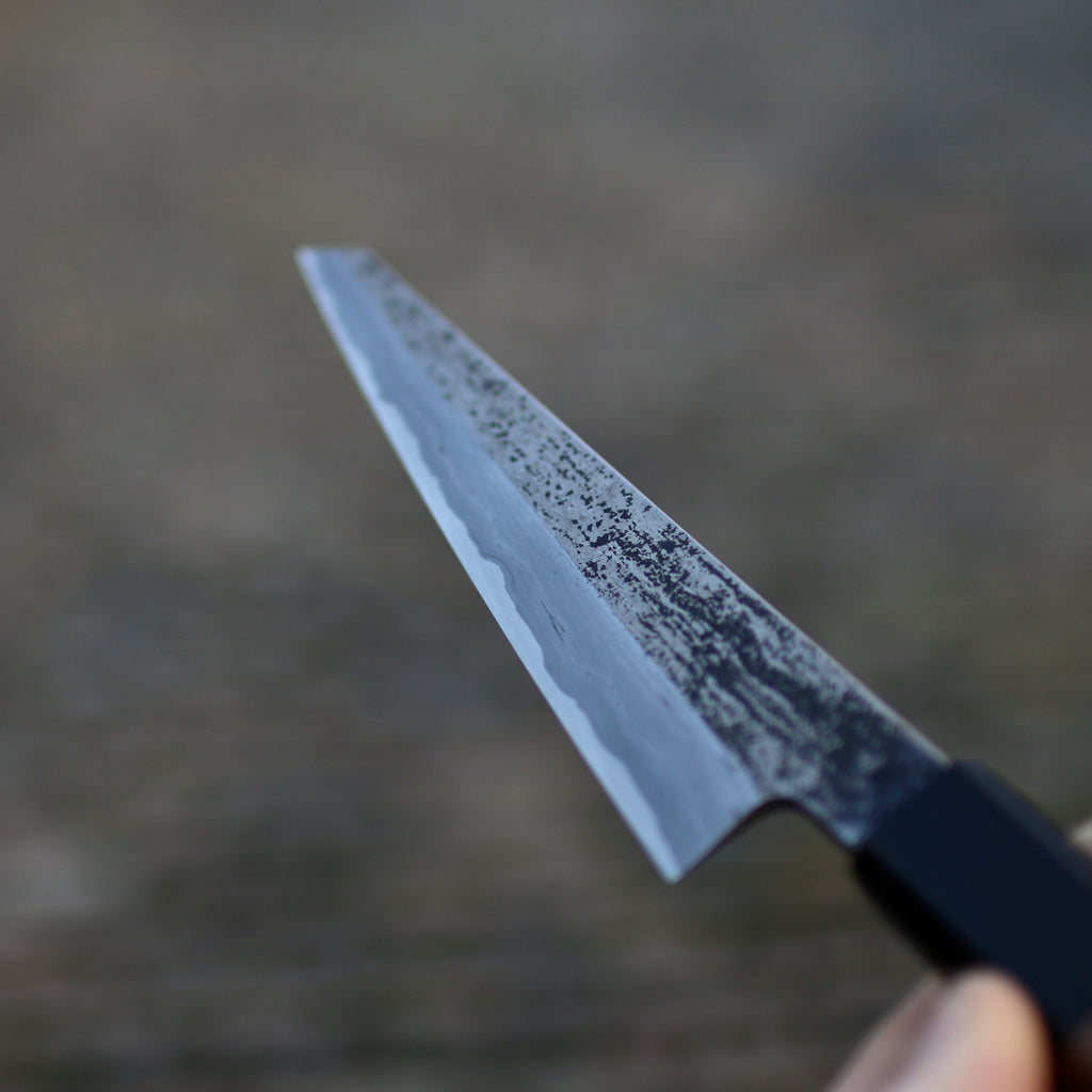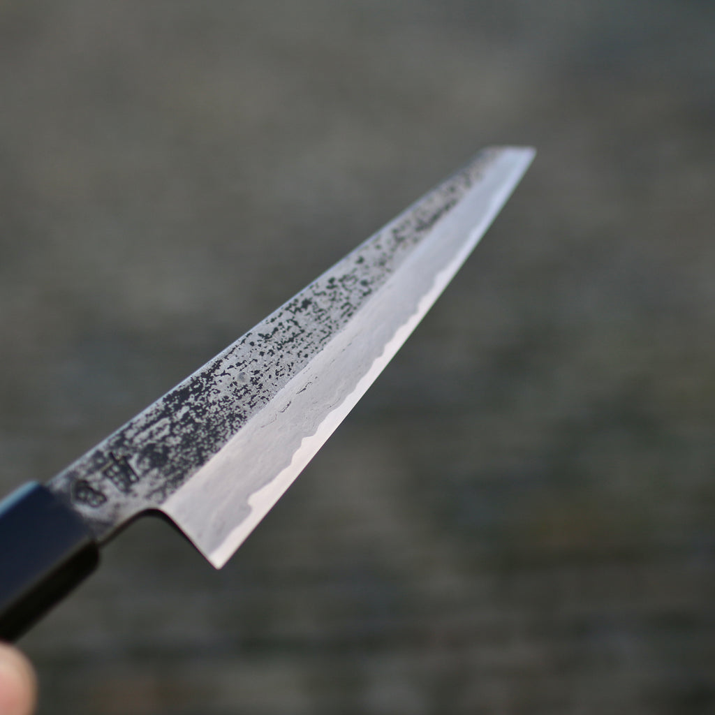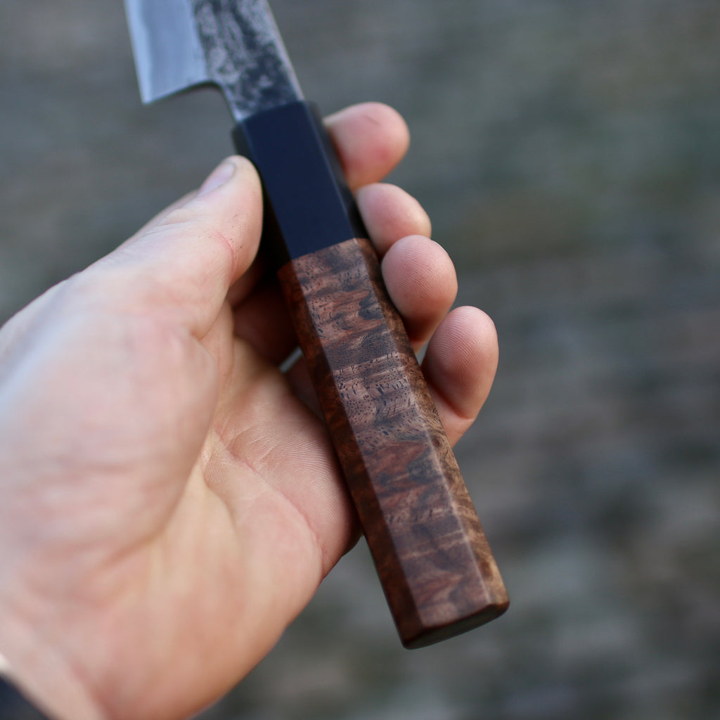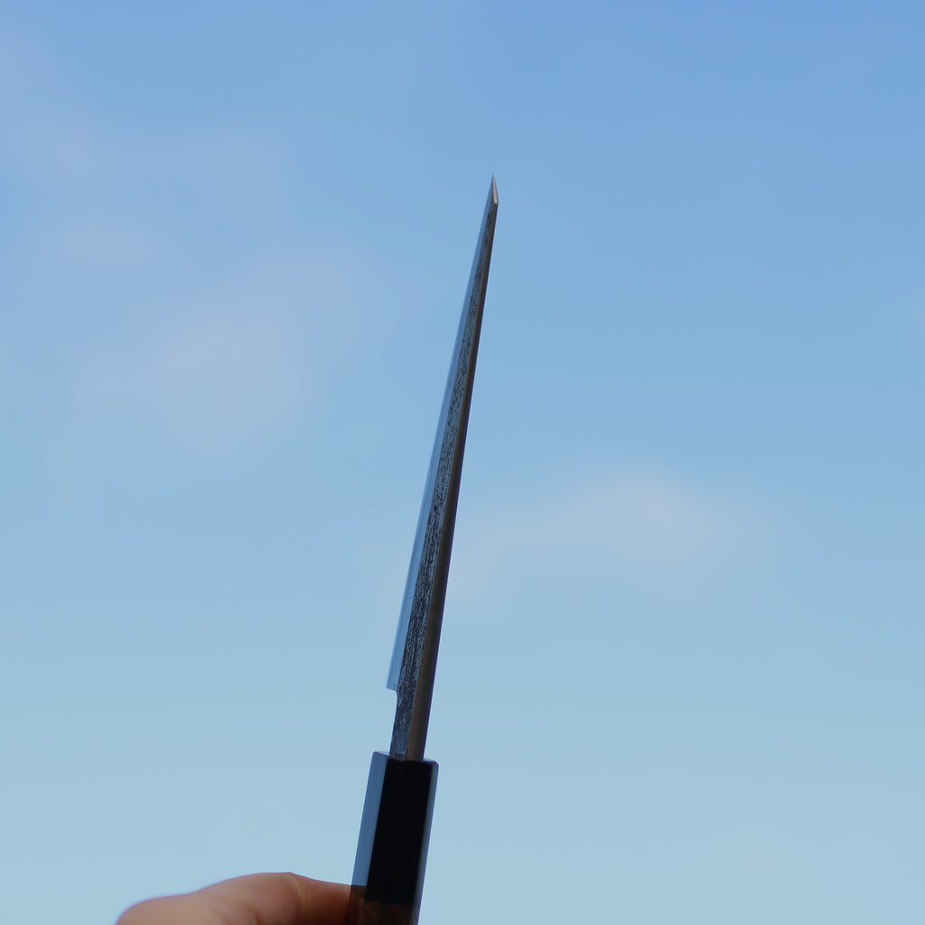 This Tetsu Honesuki feature a small and thick blade, good distal taper, and thin K-tip. Flat profile with a slight curve toward the tip. The san-mai is made from 52100 core steel with vintage wrought iron cladding. Forged to shape and to geometry the bevels are ground on water cooled grinding stone with a Kasumi finish.