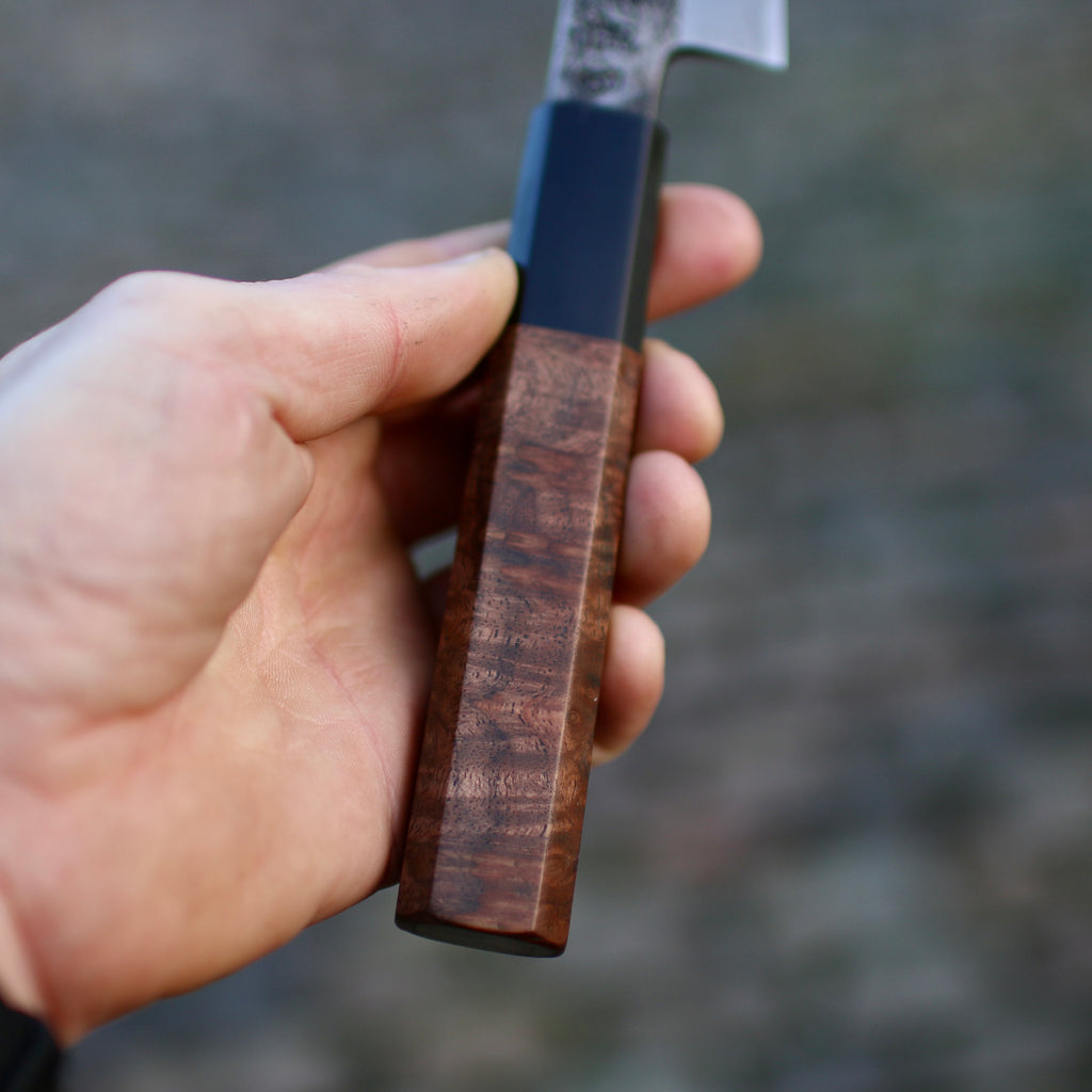 When stated, my knives bevels are ground and polished with Japanese whetstones. This allow an easy maintenance at home. For Sharpening service please contact Scott from www.sheffieldknifesharpening.com