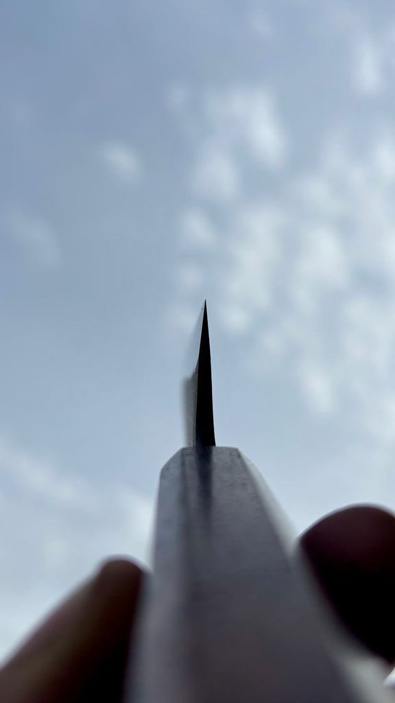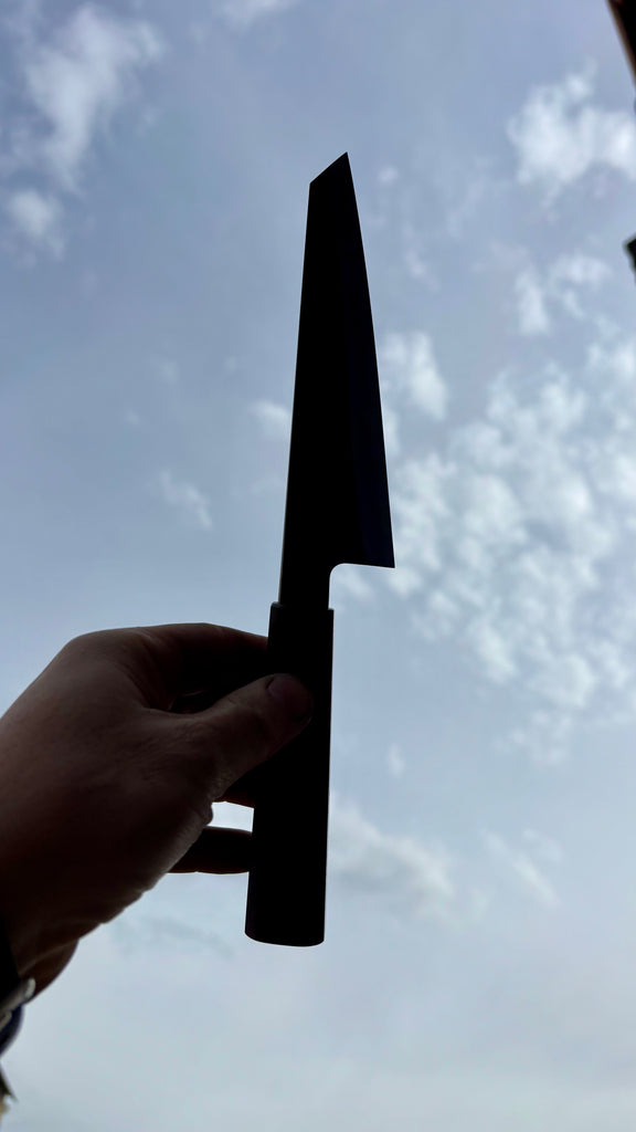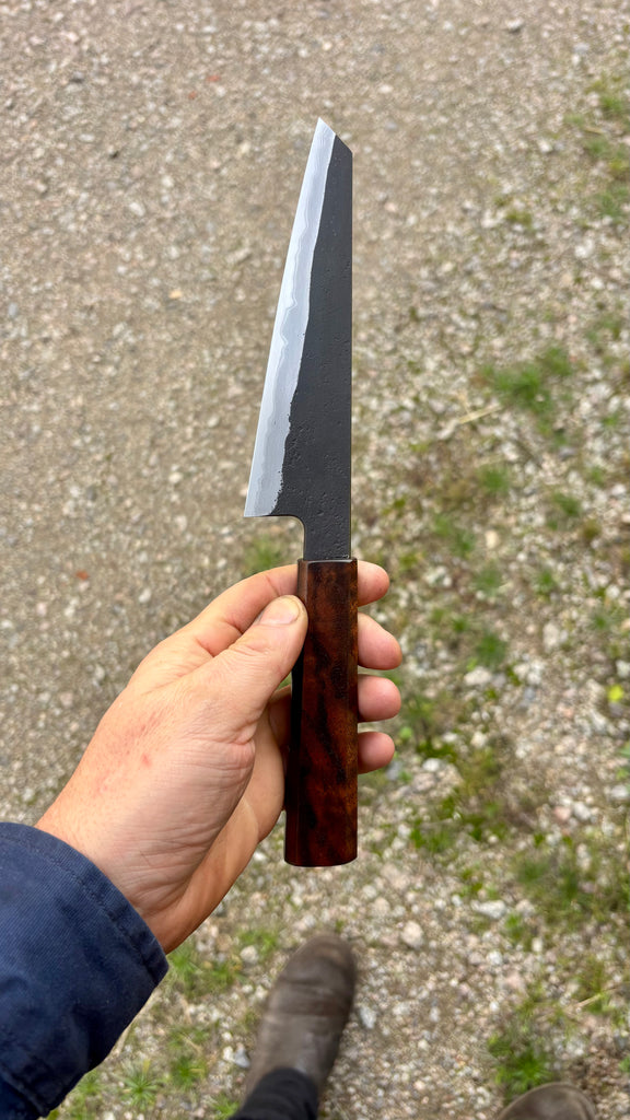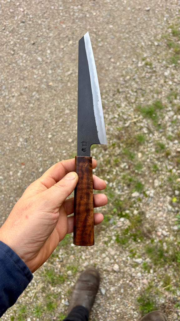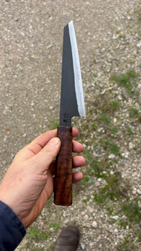 This Tetsu Honesuki feature a small blade, good distal taper, sturdy tip. Flat profile at the heel with a slight curve toward the tip. The San-mai is laminated by myself in house. Forged to shape and to geometry the blade is ground on water cooled grinding wheel.