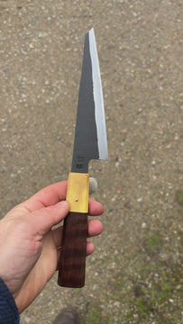 This Tetsu Honesuki feature a short blade, good distal taper, thin tip. Flat profile at the heel with a slight curve toward the tip. The San-mai is laminated by myself in house. Forged to shape and to geometry the blade is ground on water cooled grinding wheel.