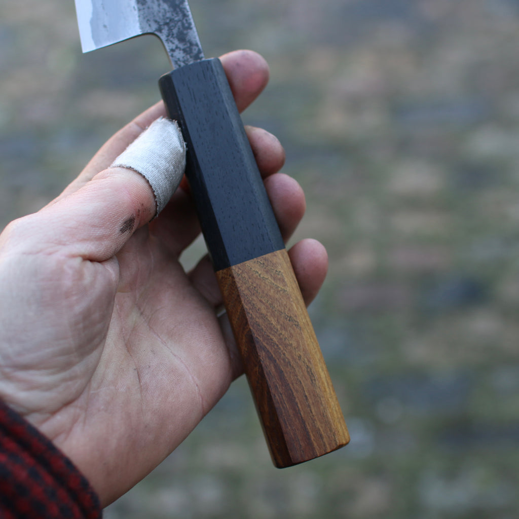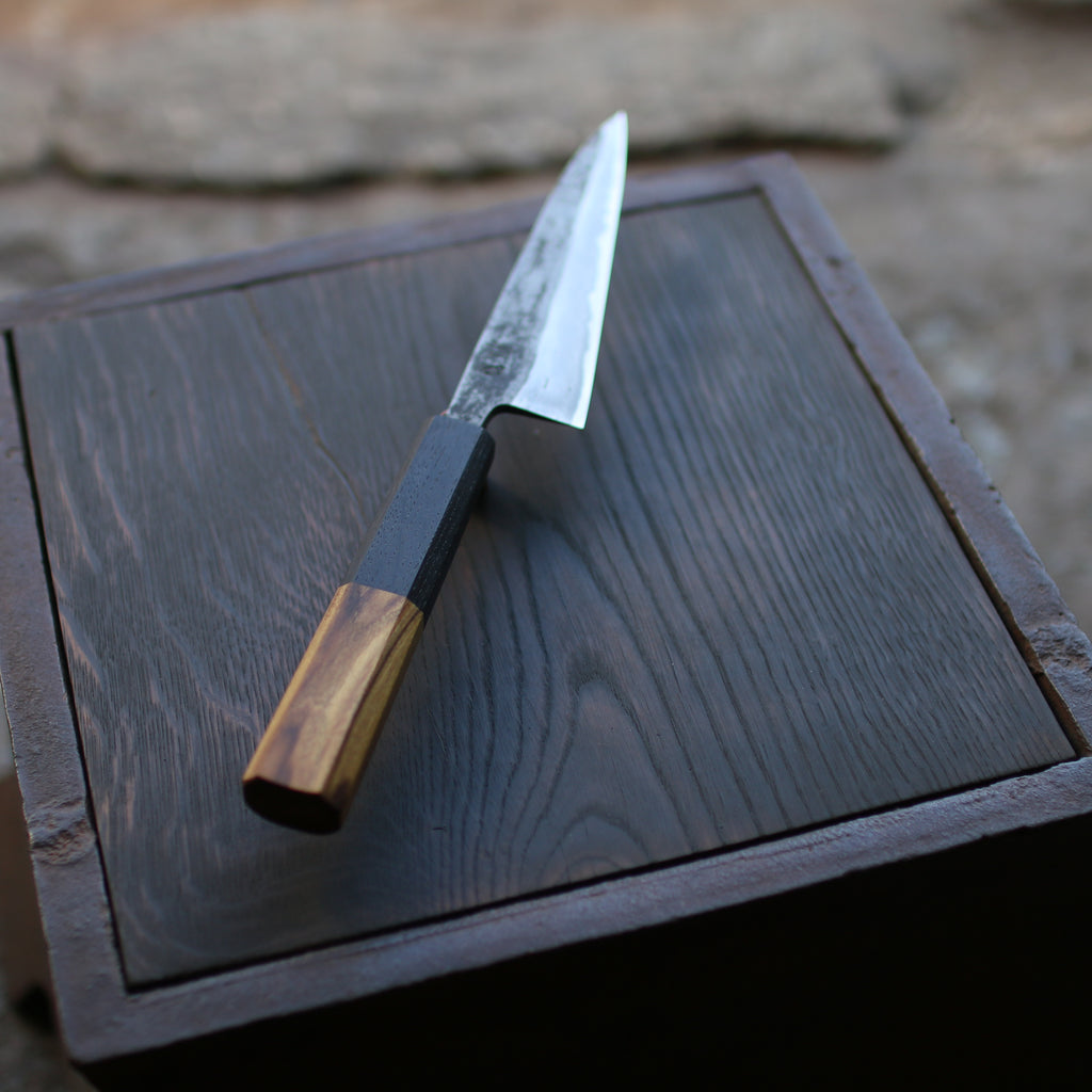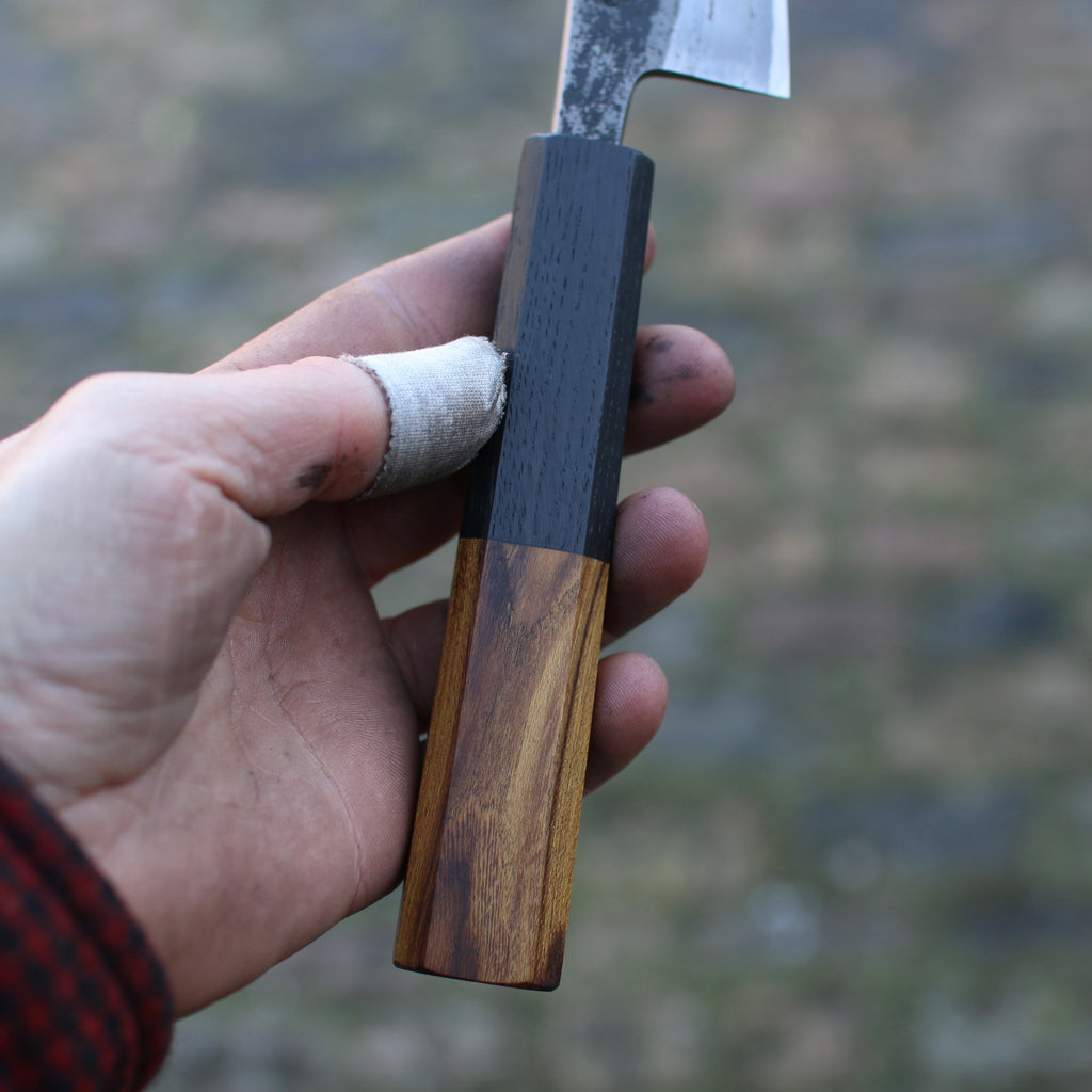 This Tetsu Honesuki feature a small blade but thick, good distal taper, and thin tip. Flat profile with a slight curve toward the tip. The san-mai is made from 52100 core steel with vintage wrought iron cladding. Forged to shape and to geometry the bevels are ground on water cooled grinding stone with a Kasumi finish.
