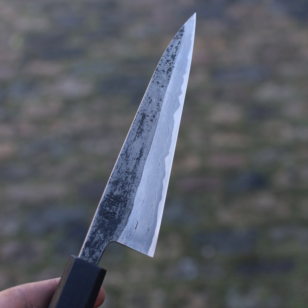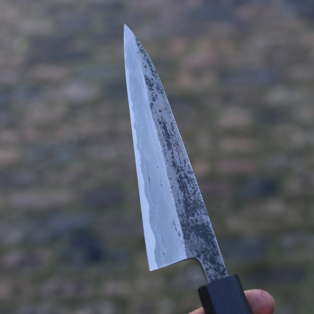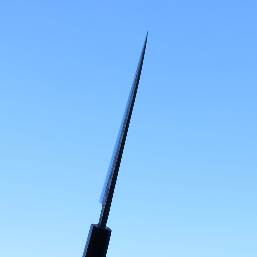 This Tetsu Honesuki feature a small blade but thick, good distal taper, and thin tip. Flat profile with a slight curve toward the tip. The san-mai is made from 52100 core steel with vintage wrought iron cladding. Forged to shape and to geometry the bevels are ground on water cooled grinding stone with a Kasumi finish.