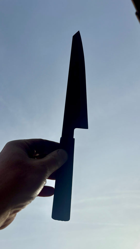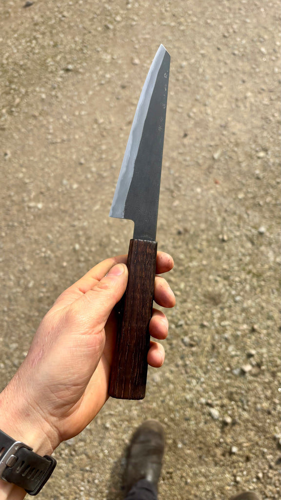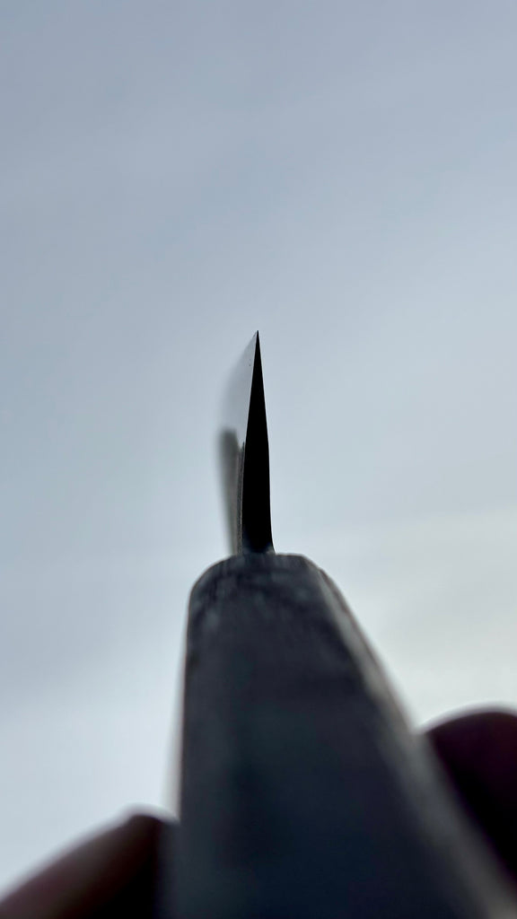 This Honesuki feature a small blade, good distal taper, and thin tip. Flat profile at the heel with a slight curve toward the tip. The San-mai is made from 135Cr3 steel core with wrought iron cladding. Forged to shape and to geometry the blade is ground on water cooled grinding wheel.