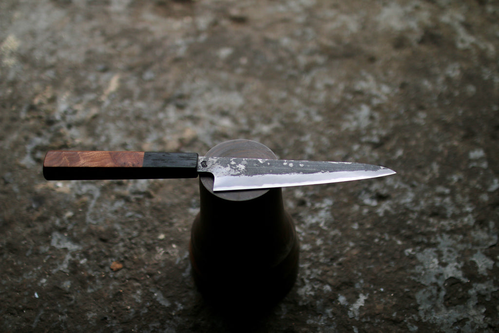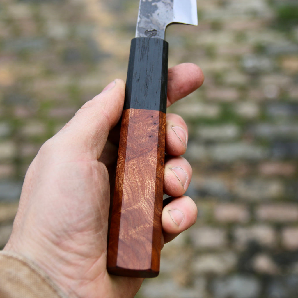 This Honesuki (Japanese boning knife) feature a short, strong and thick blade. Shop made san-maï with 26C3 core steel and pure iron cladding. Forged to shape and to geometry the bevels are ground on whetstone with a Kasumi finish (JNS Red Aoto). The handle is made with Bog Oak and Burl Elm.