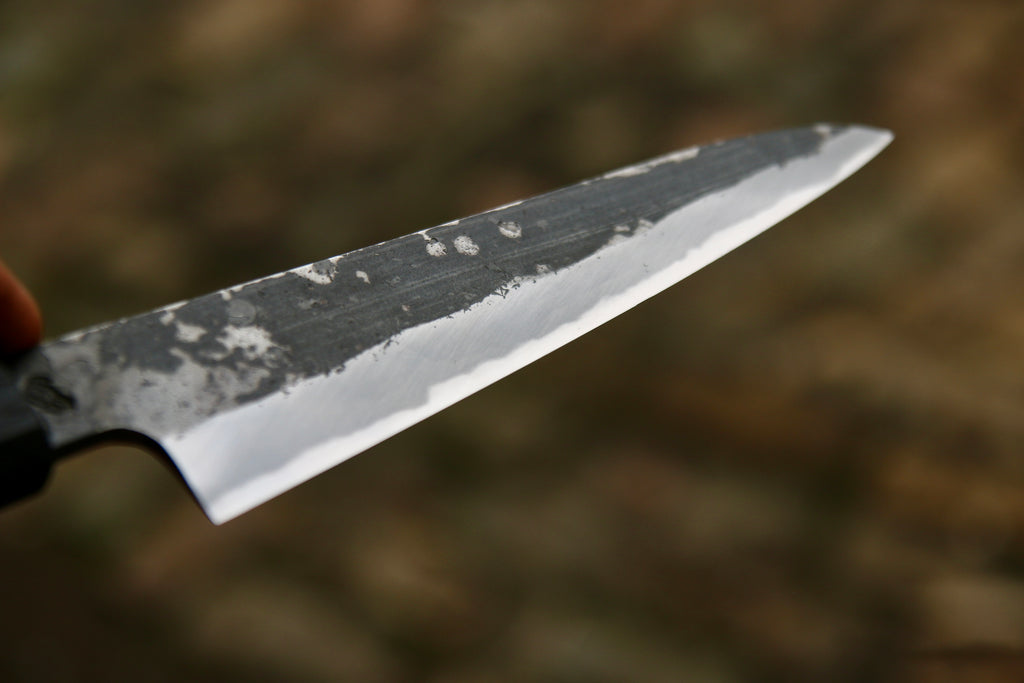 My blades are made from carbon steel not stainless steel, it gives my knives an unbeatable sharpness. I prefer carbon steel for it ease to sharpen, the fine edge it takes and the beautiful patina that will develop. You do, however, need to give carbon steel knives just a little extra care to keep them in top shape. There are trade-offs in everything. Dirty wrought iron claddings are very reactive.