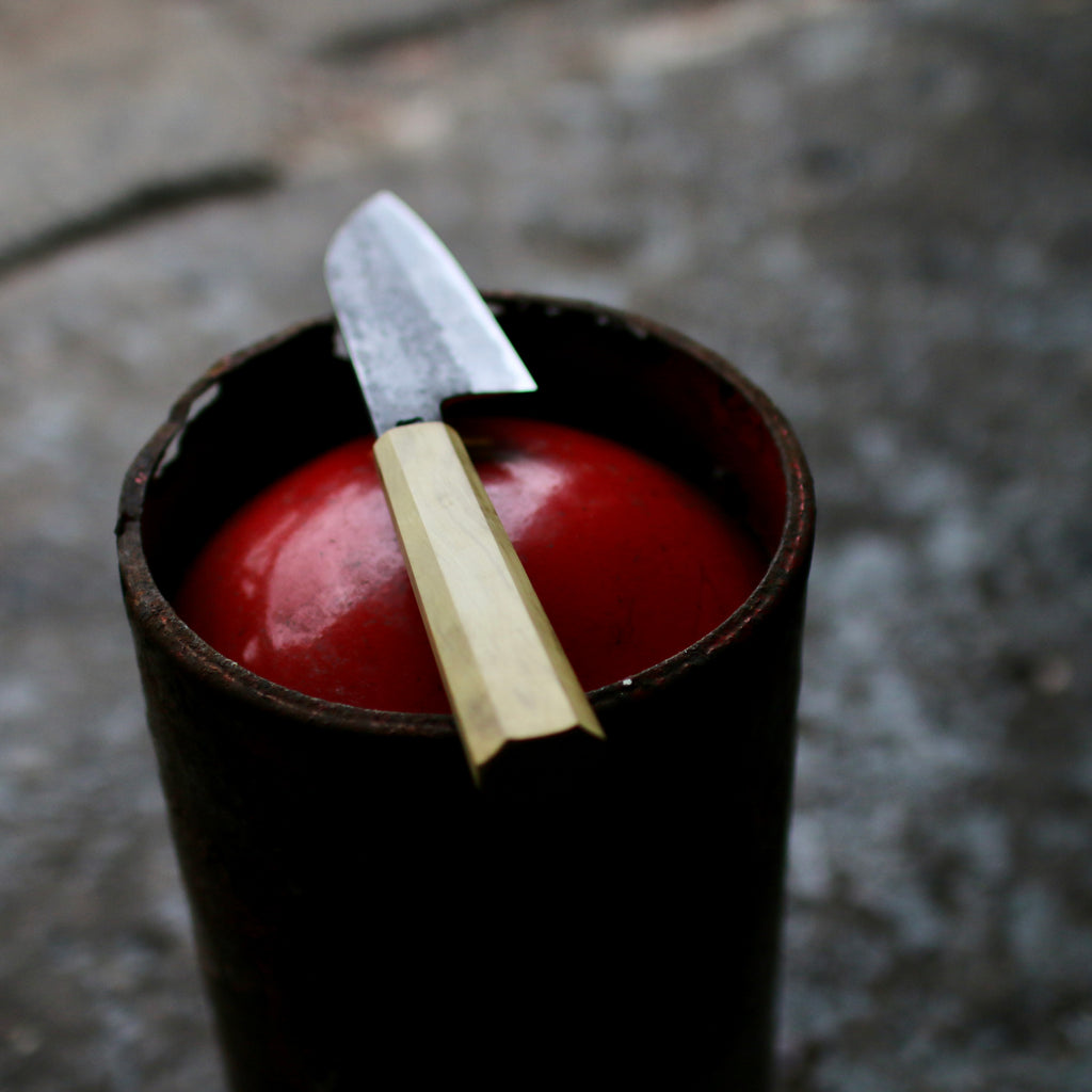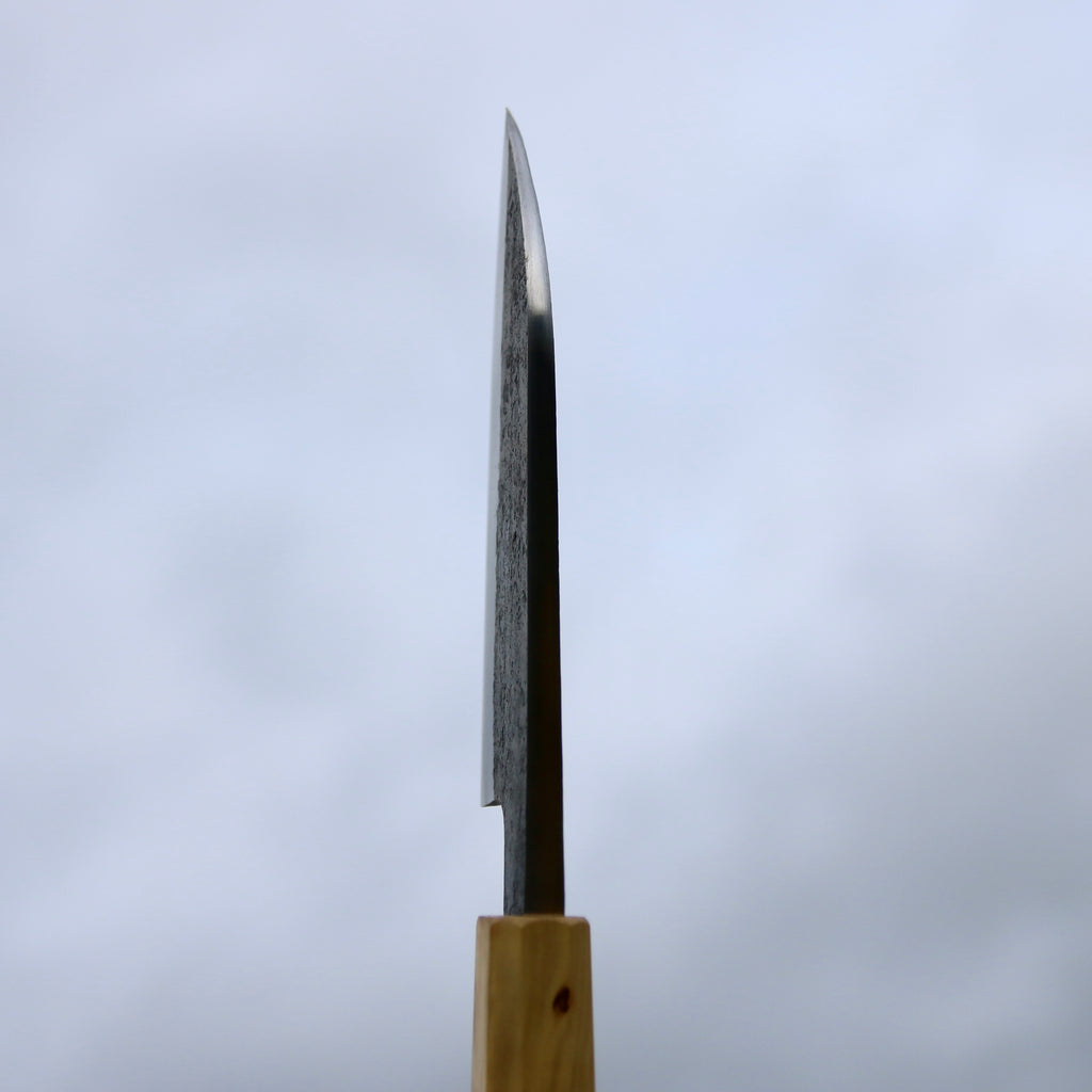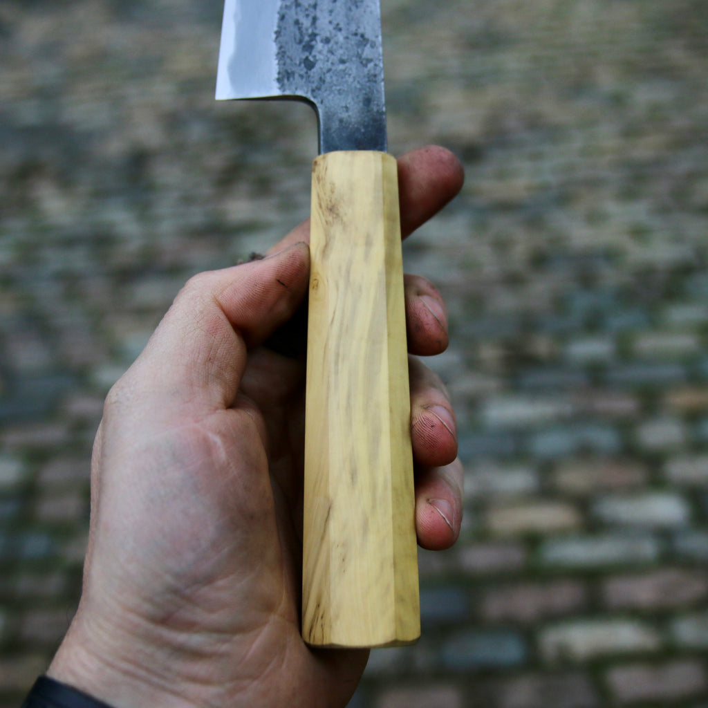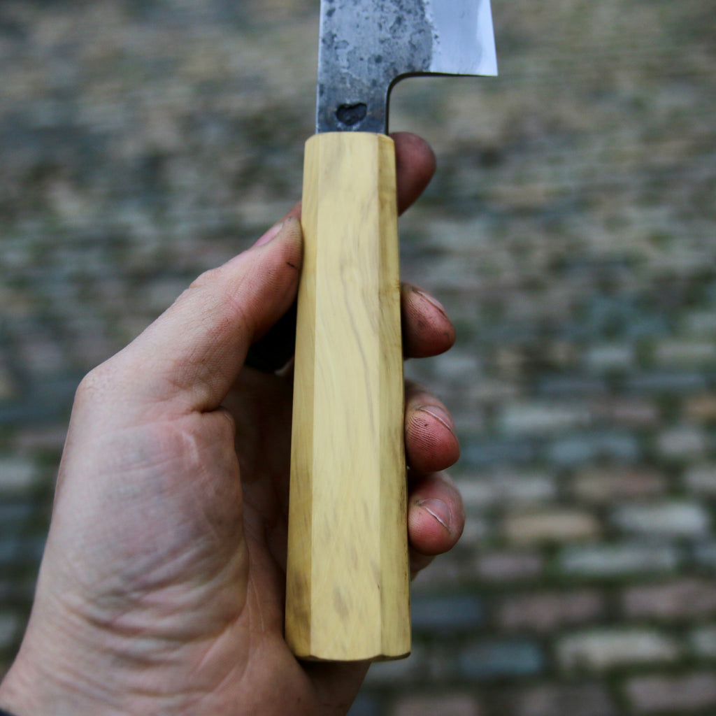 This Ko-Deba (Japanese carving knife) feature a short and thick blade. Shop made san-maï with 135Cr3 core steel and historic, dirty wrought iron cladding. Forged to shape and to geometry the bevels are ground on whetstone with a Kasumi finish (Shobudani). The handle is made with French Box wood.