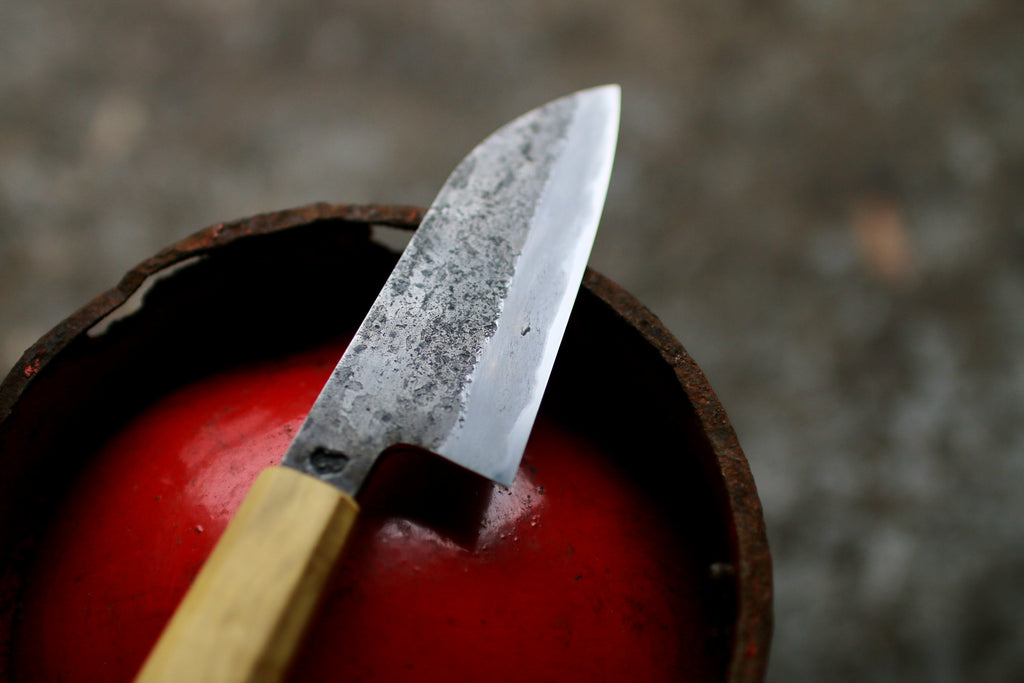 My blades are made from carbon steel not stainless steel, it gives my knives an unbeatable sharpness. I prefer carbon steel for it ease to sharpen, the fine edge it takes and the beautiful patina that will develop. You do, however, need to give carbon steel knives just a little extra care to keep them in top shape. There are trade-offs in everything. Dirty wrought iron cladding are very reactive.