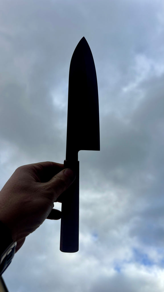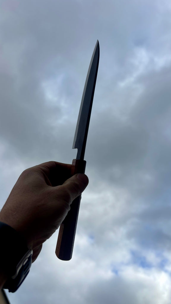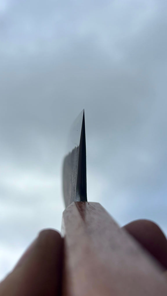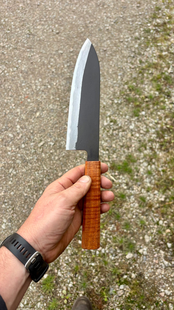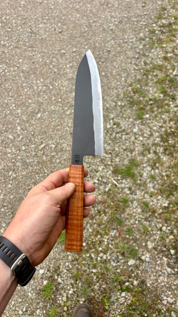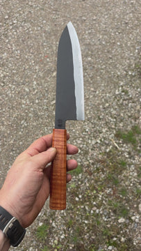 This double bevel Tetsu Ko-Deba feature a medium size and thick blade. Flat profile at the heel with a slight curve toward the tip. The San-mai is laminated by myself in house. Forged to shape and to geometry the blade is ground on water cooled grinding wheel.