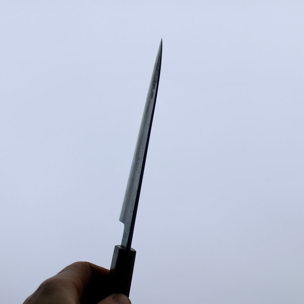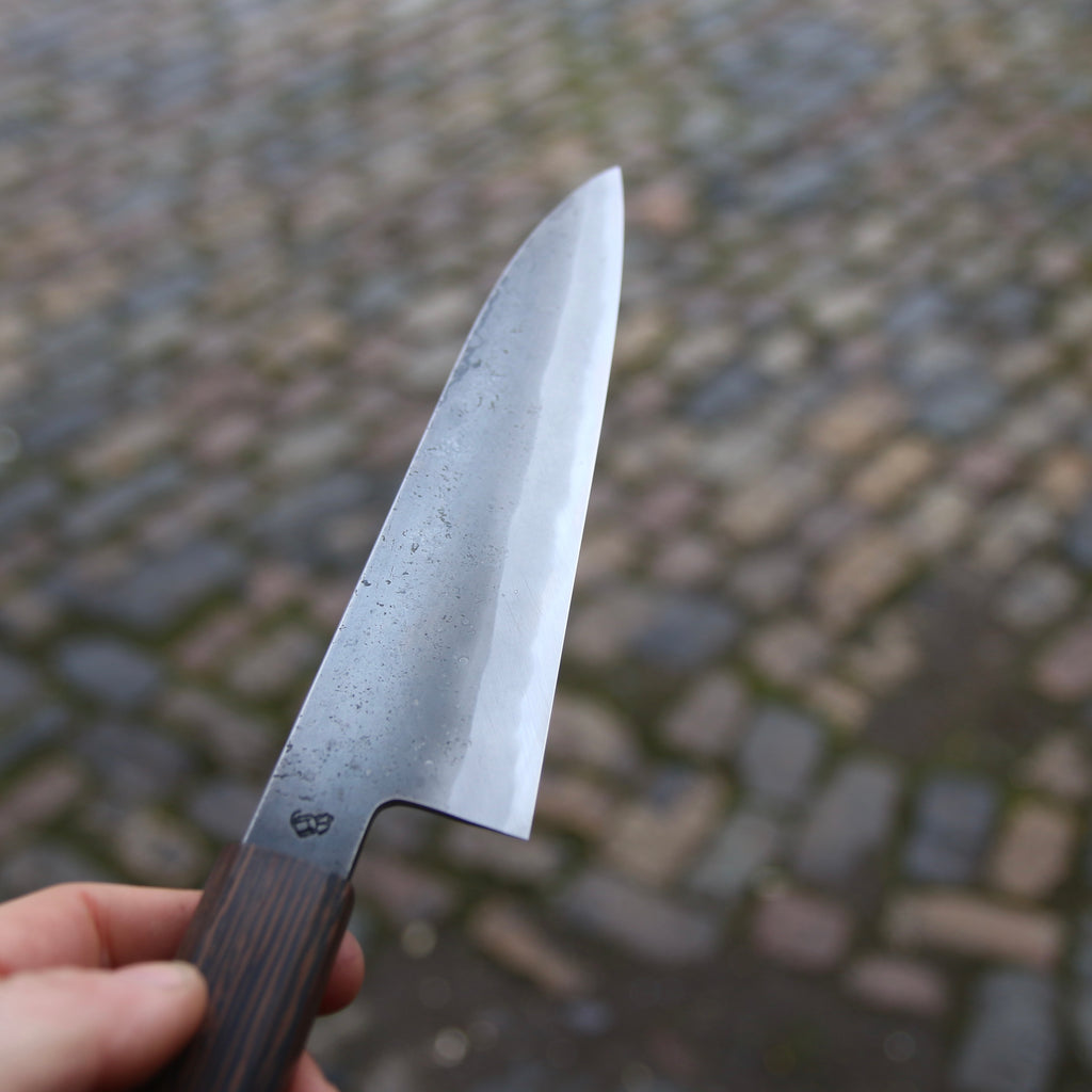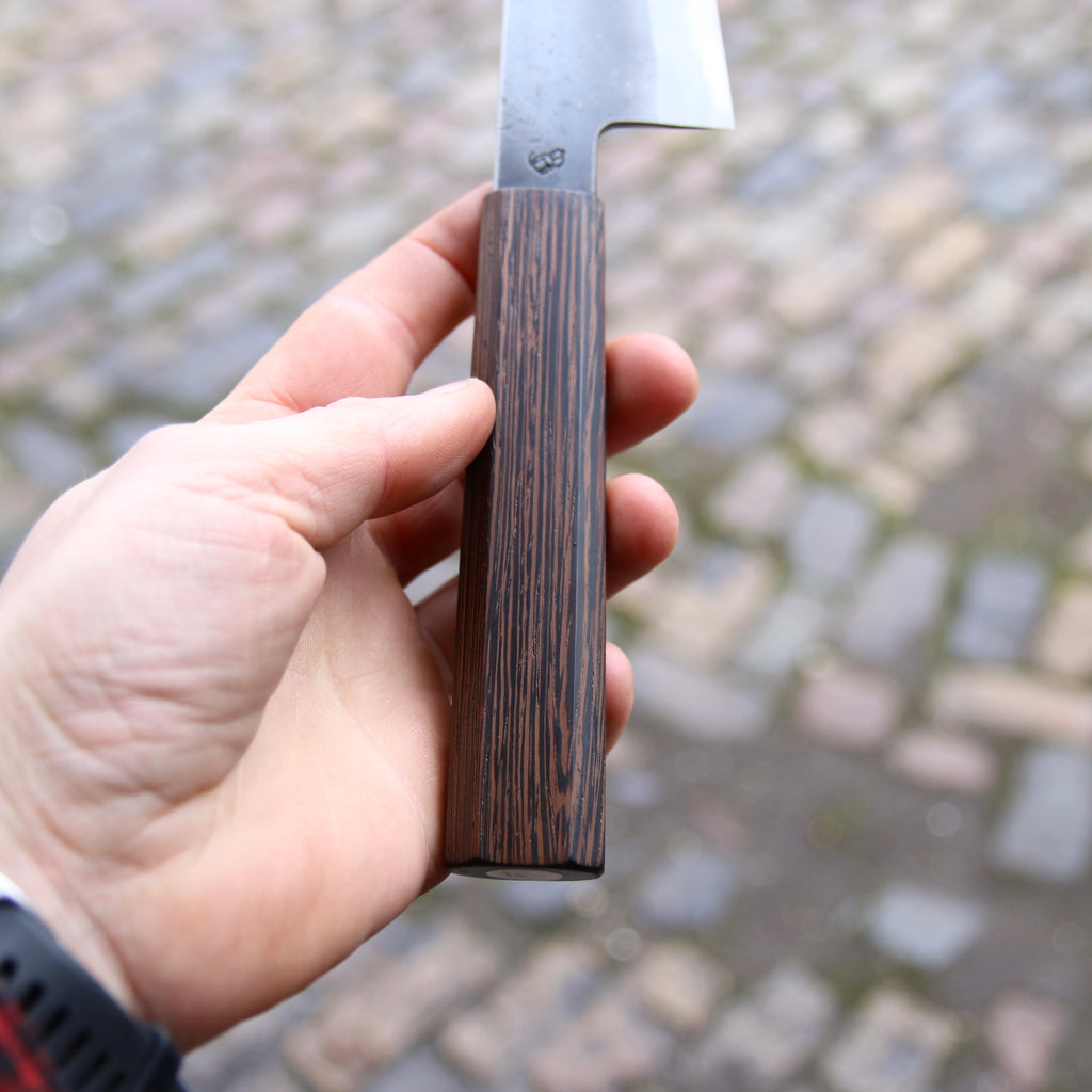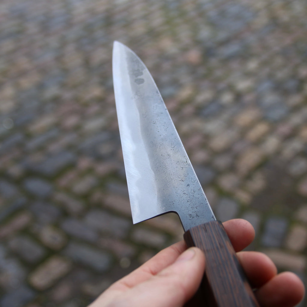 This Nashiji Ko-Gyuto feature a short blade, good distal taper, and thin tip. Flat profile with a slight curve toward the tip. The san-mai is made from 135Cr3 core steel with soft steel cladding. Forged to shape and to geometry the bevels are ground on water cooled grinding stone with a machine finish (scratches visible).