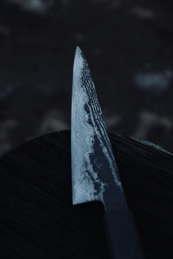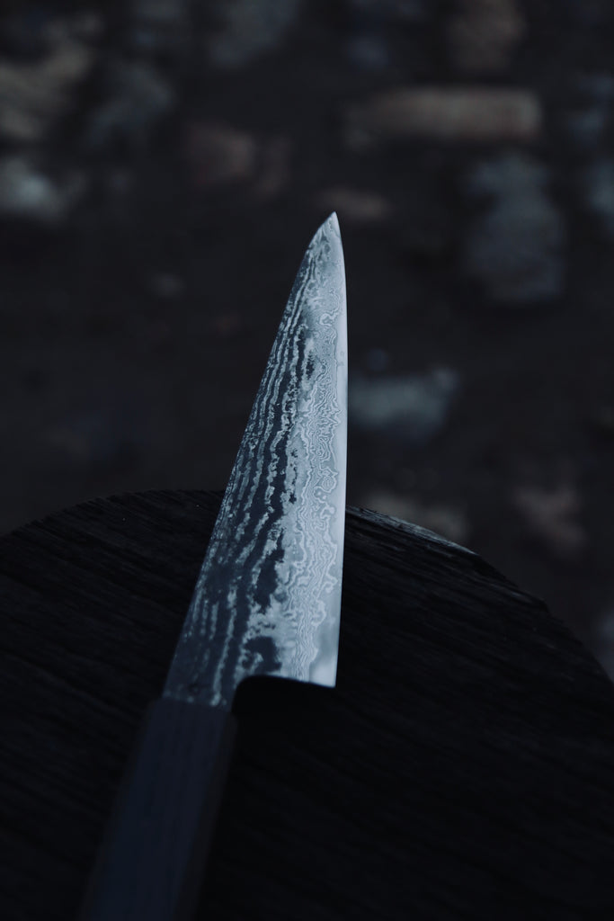 Ko-Gyuto 175x43mm, San-maï hand forged from 26C3 high carbon steel core and pattern welded steel cladding (15n20 with EN40J) in Sheffield.