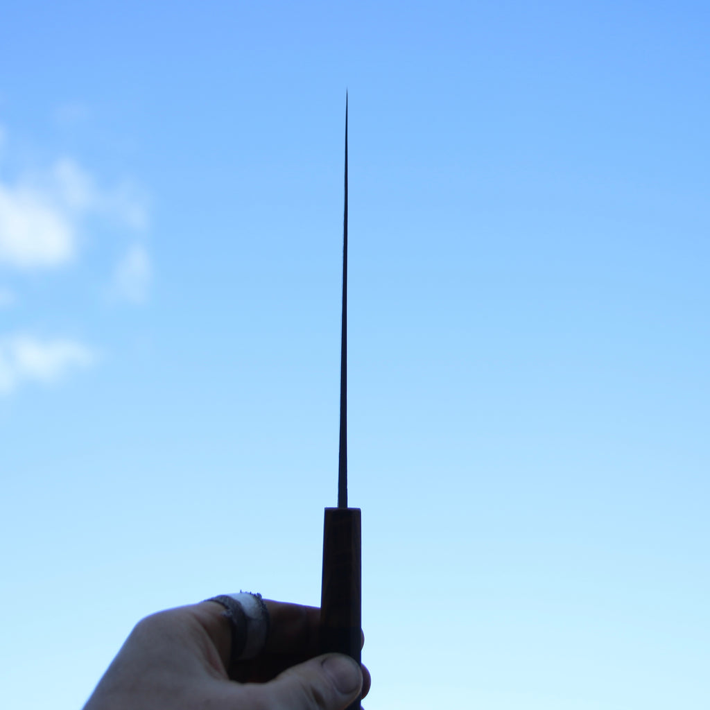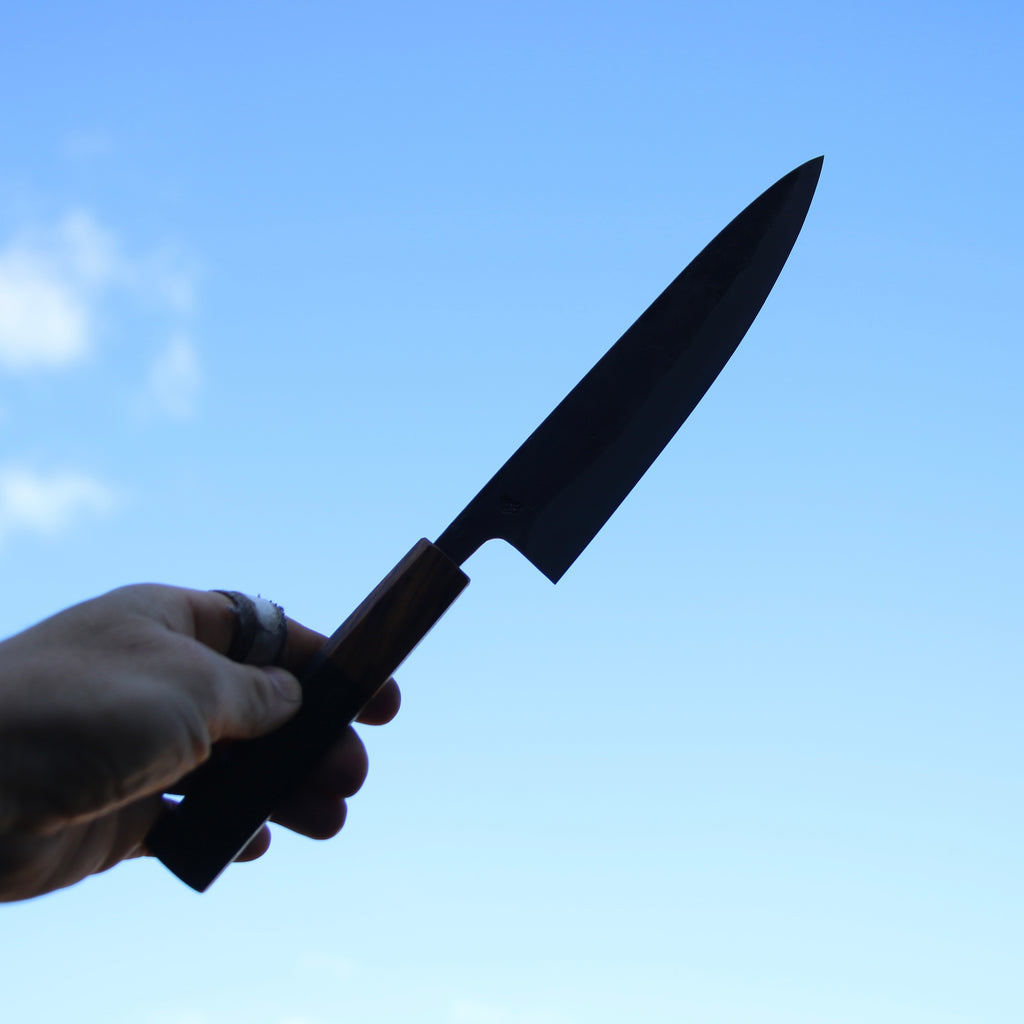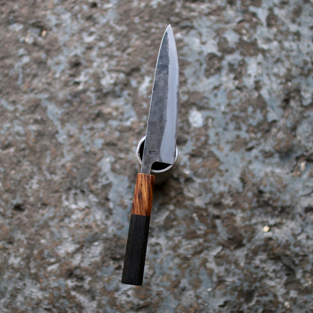 My blades are made from carbon steel not stainless steel, it gives my knives an unbeatable sharpness. I prefer carbon steel for it ease to sharpen, the fine edge it takes and the beautiful patina that will develop. You do, however, need to give carbon steel knives just a little extra care to keep them in top shape. There are trade-offs in everything.