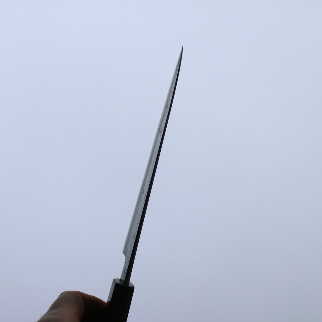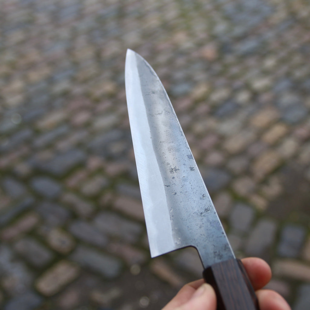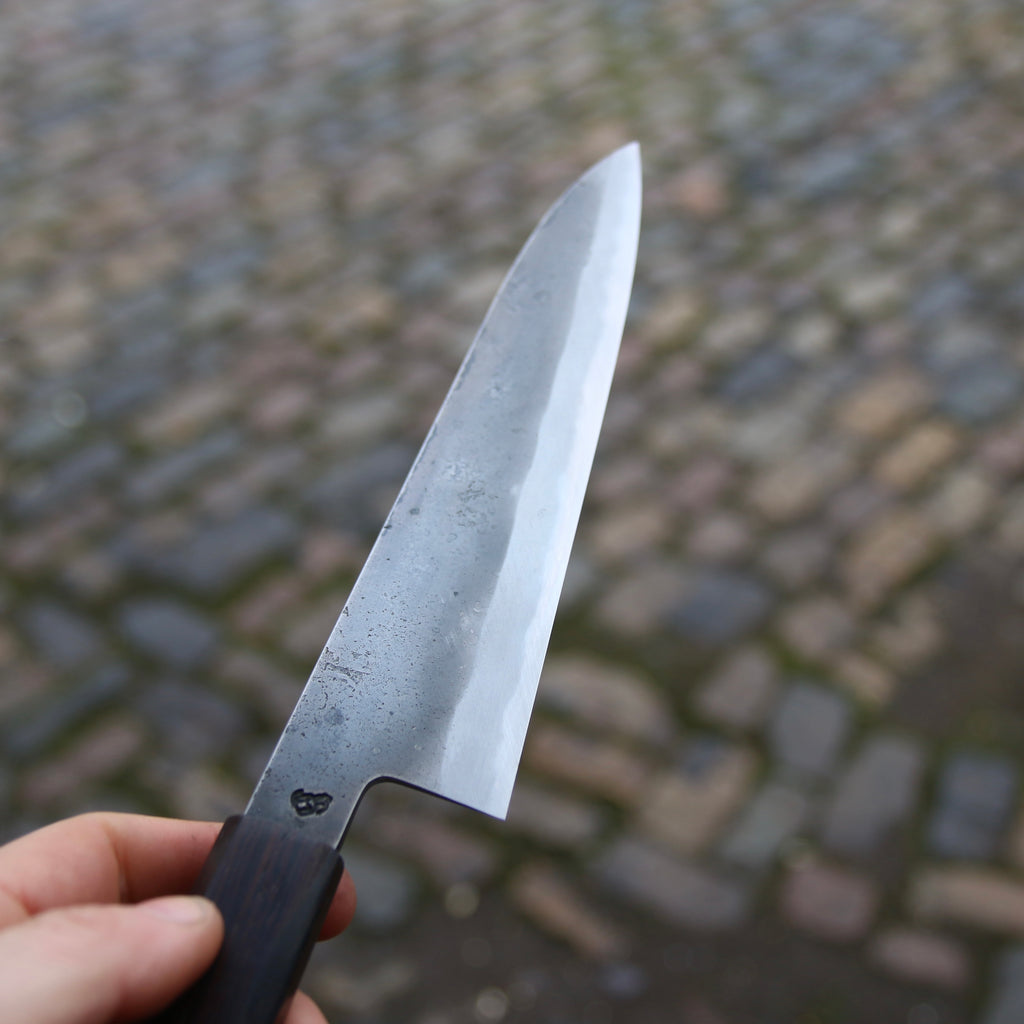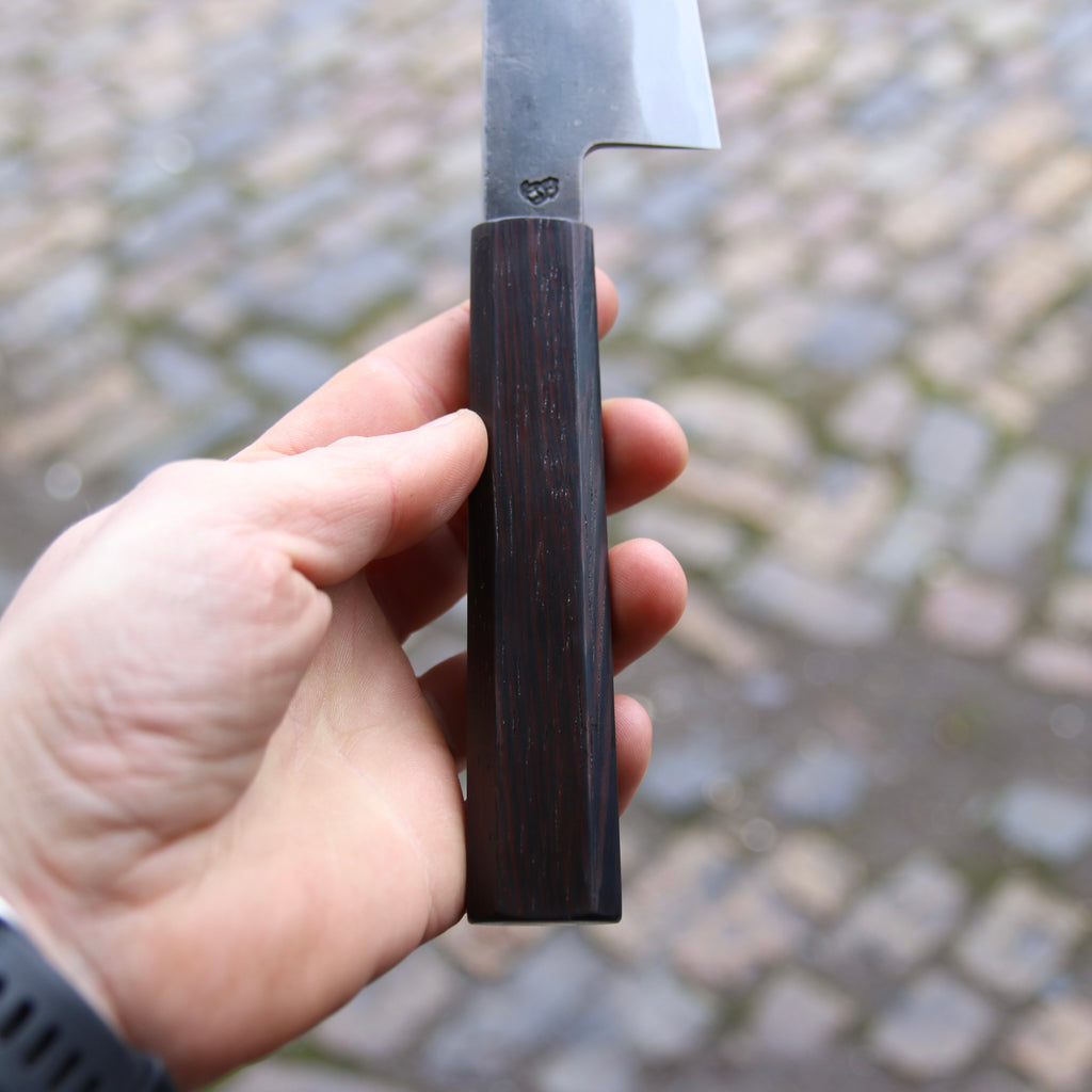 This Nashiji Ko-Gyuto feature a short blade, good distal taper, and thin tip. Flat profile with a slight curve toward the tip. The san-mai is made from 135Cr3 core steel with soft steel cladding. Forged to shape and to geometry the bevels are ground on water cooled grinding stone with a machine finish (scratches visible).