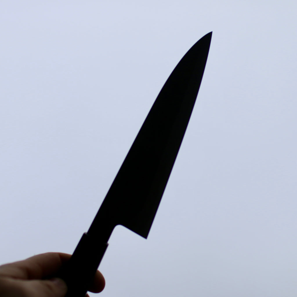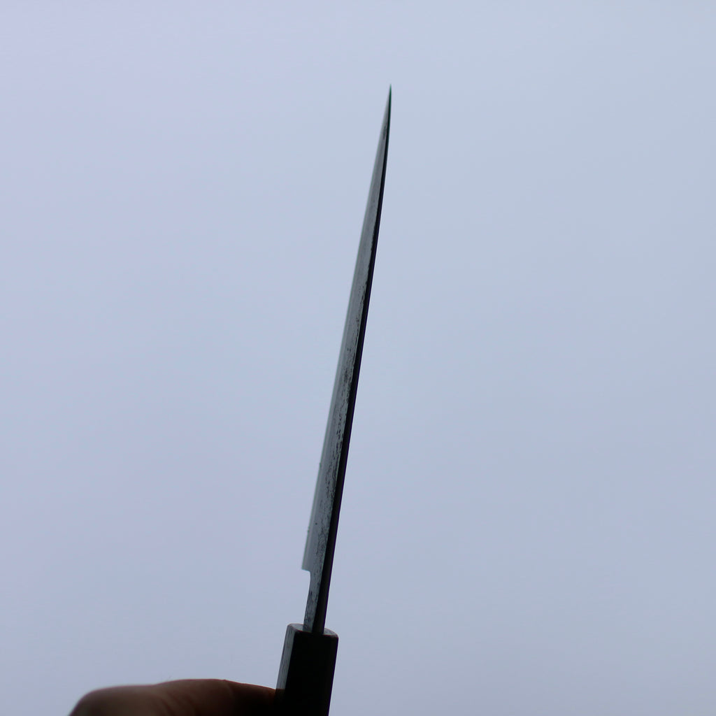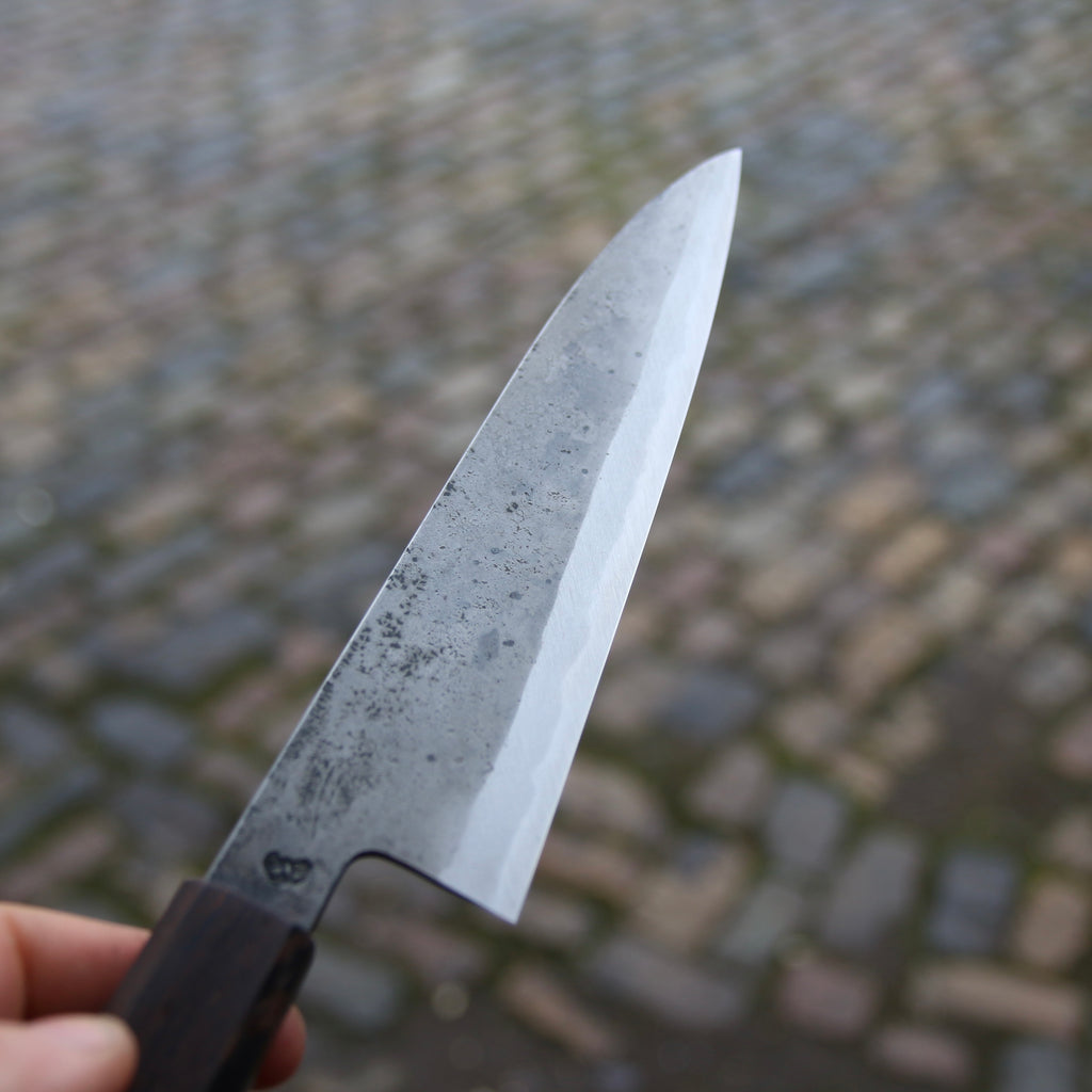 This Nashiji Ko-Gyuto feature a short blade, good distal taper, and thin tip. Flat profile with a slight curve toward the tip. The san-mai is made from 135Cr3 core steel with soft steel cladding. Forged to shape and to geometry the bevels are ground on water cooled grinding stone with a machine finish (scratches visible).