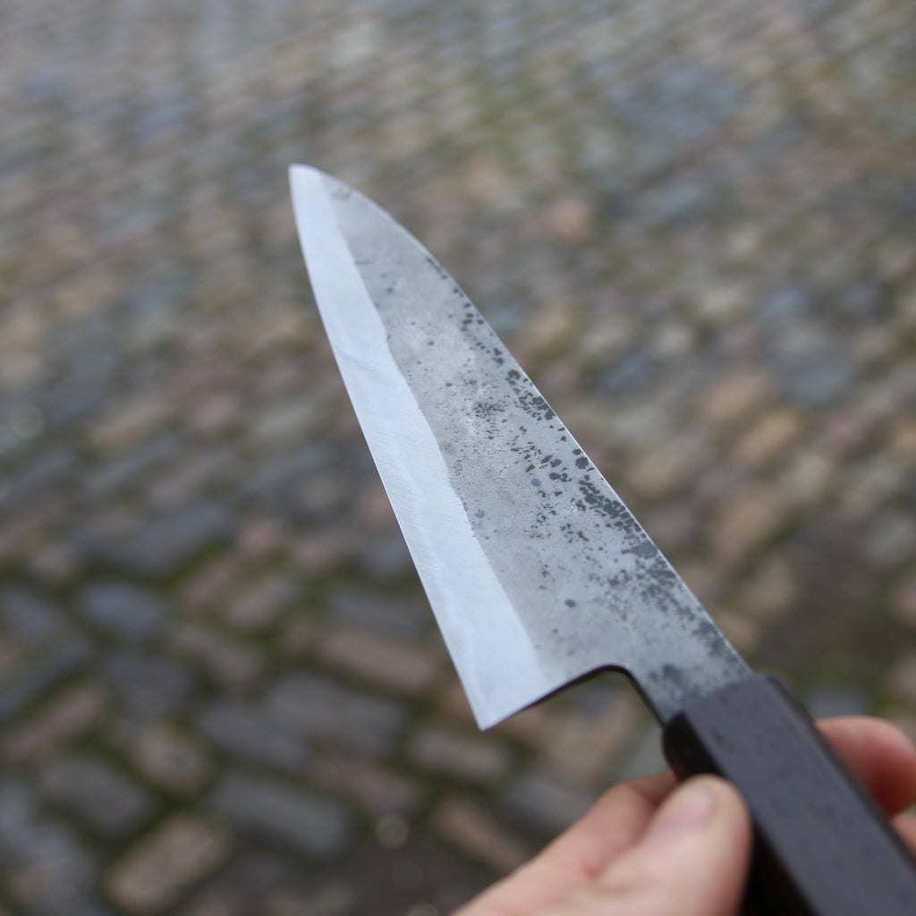 My blades are made from carbon steel not stainless steel, it gives my knives an unbeatable sharpness. I prefer carbon steel for it ease to sharpen, the fine edge it takes and the beautiful patina that will develop. You do, however, need to give carbon steel knives just a little extra care to keep them in top shape. There are trade-offs in everything. Claddings stated as "dirty wrought iron" will be very reactive.