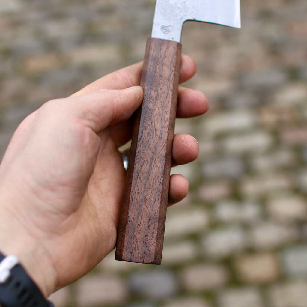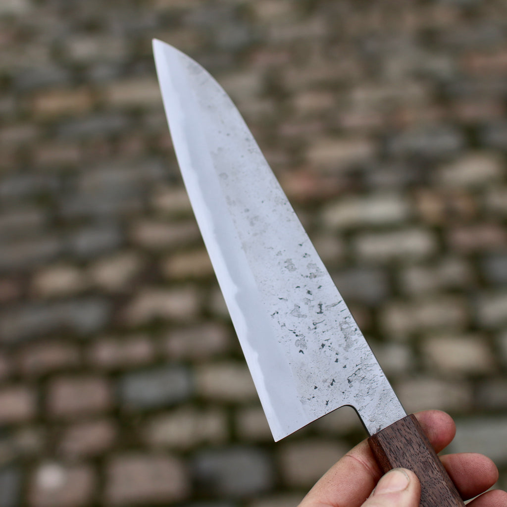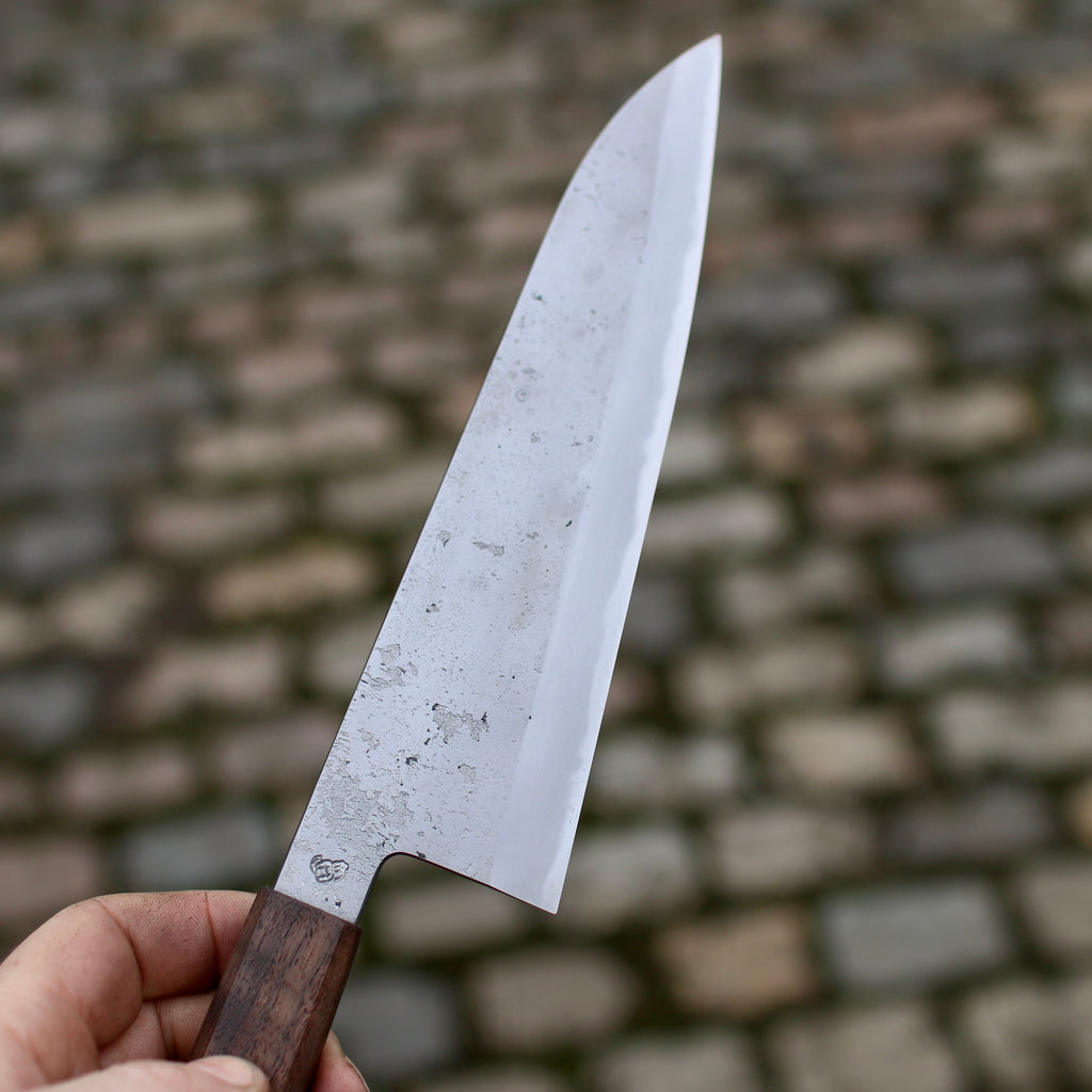This Ko-Gyuto feature a medium size blade, good distal taper, and thin tip. Workhorse blade with flat profile with a slight curve toward the tip. The Warikomi is made from 135Cr3 steel core with soft steel cladding. Forged to shape and to geometry the blade is ground on water cooled grinding wheel with a satin finish.