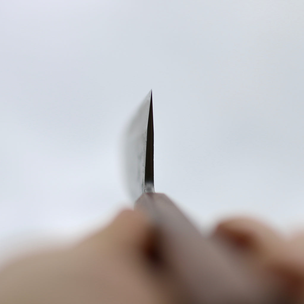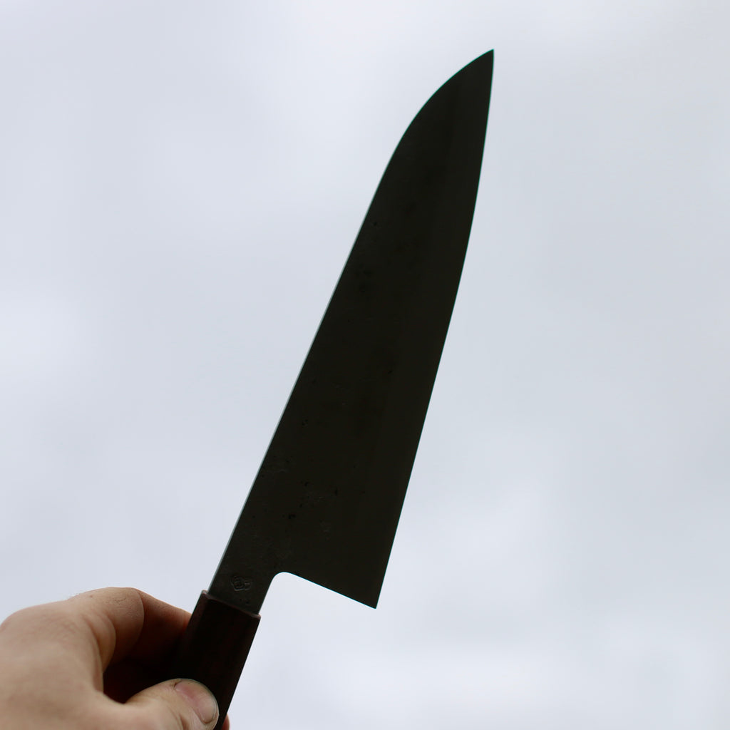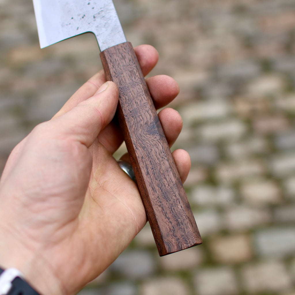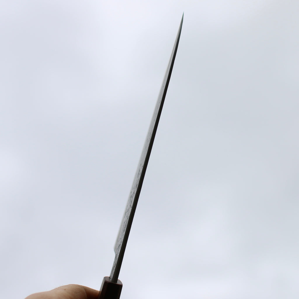 This Ko-Gyuto feature a medium size blade, good distal taper, and thin tip. Workhorse blade with flat profile with a slight curve toward the tip. The Warikomi is made from 135Cr3 steel core with soft steel cladding. Forged to shape and to geometry the blade is ground on water cooled grinding wheel with a satin finish.