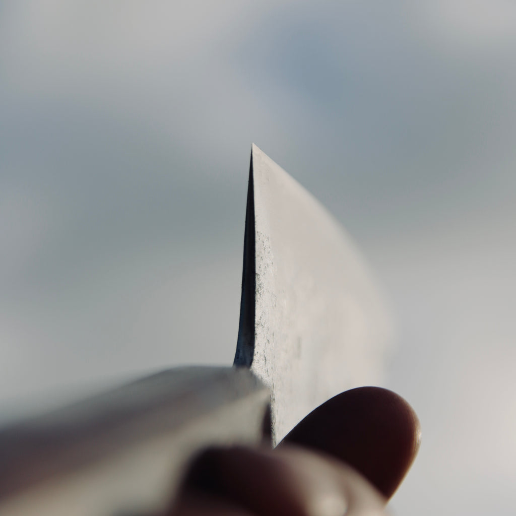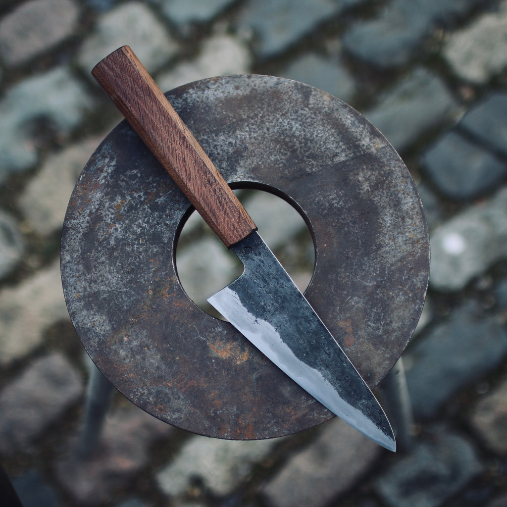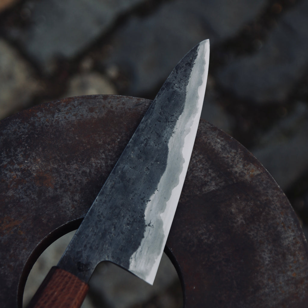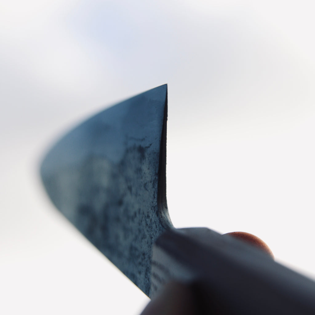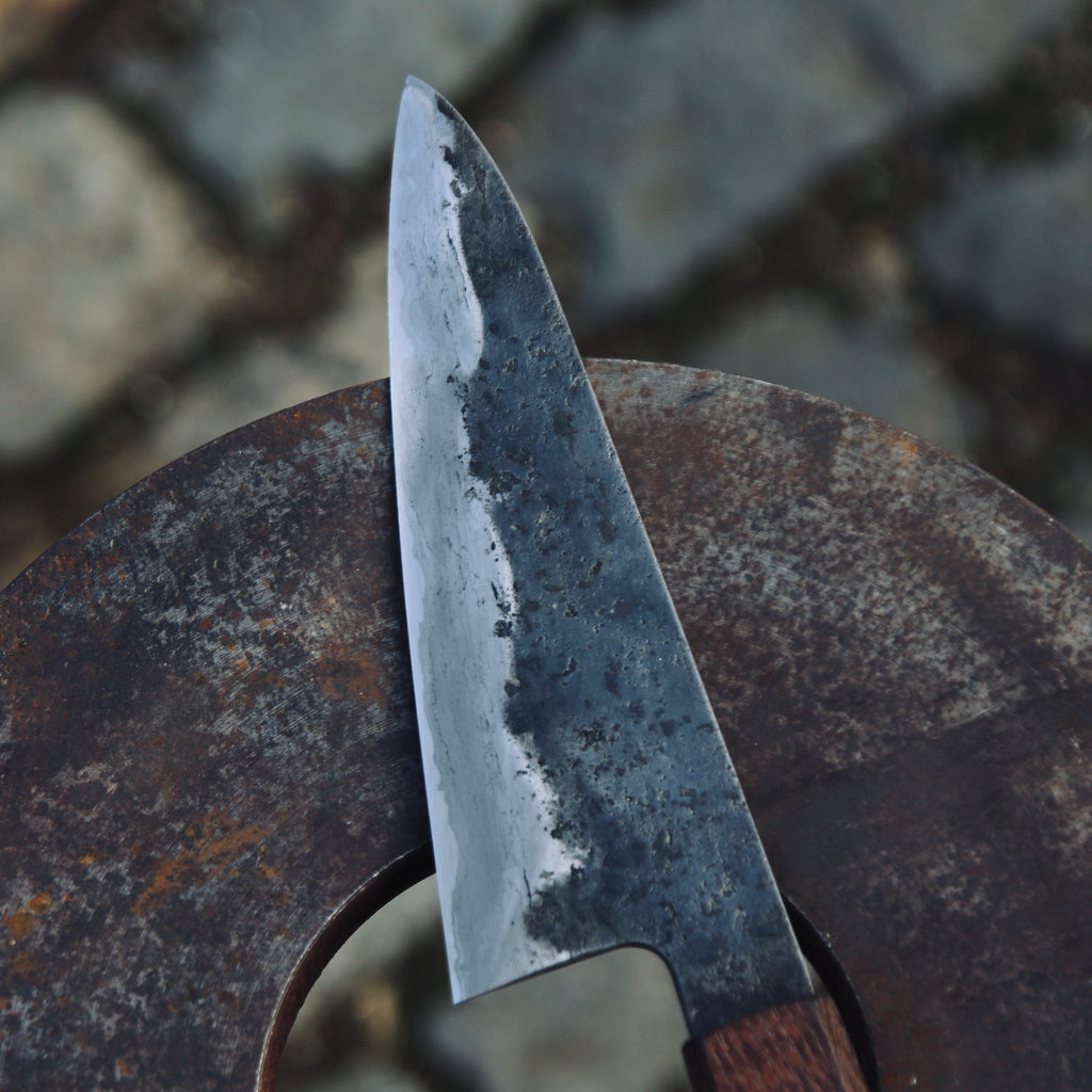 My blades are made from carbon steels not stainless steel, it gives my knives an unbeatable sharpness. I prefer carbon steel for it ease to sharpen, the fine edge it takes and the beautiful patina that will develop. You do, however, need to give carbon steel knives just a little extra care to keep them in top shape. There are trade-offs in everything.