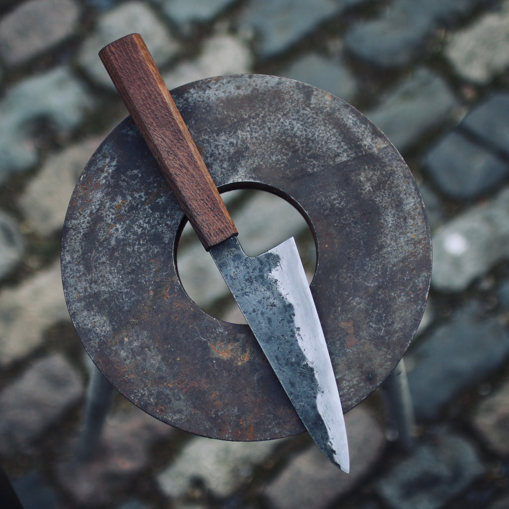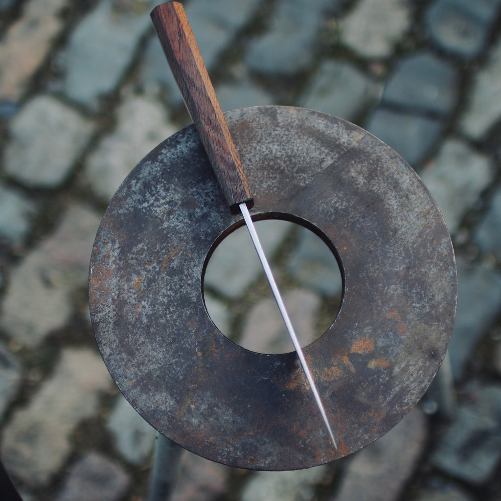 Small workhorse Santoku with sturdy tip. Distal taper from 4mm at the handle to 2.3mm mid blade to 0.9mm at the tip. The wrought iron cladding have some small inclusions, it