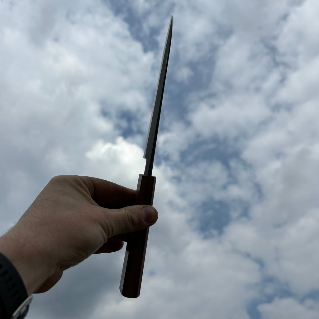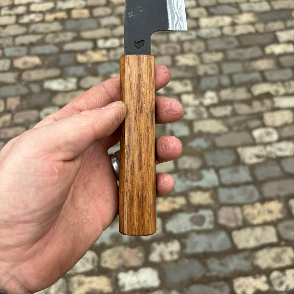 This Ko-Santoku feature small blade, good distal taper, and thin tip. Flat profile with a slight curve toward the tip. The san-mai is made from Aogami 2 steel core with a suminagashi cladding. Forged to shape and to geometry the blade is ground on water cooled grinding wheel with a kasumi finish.