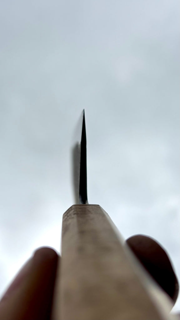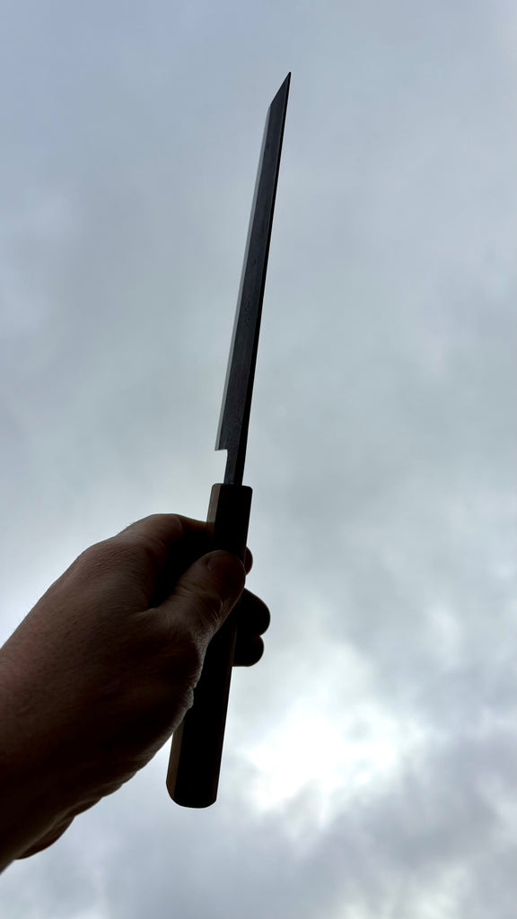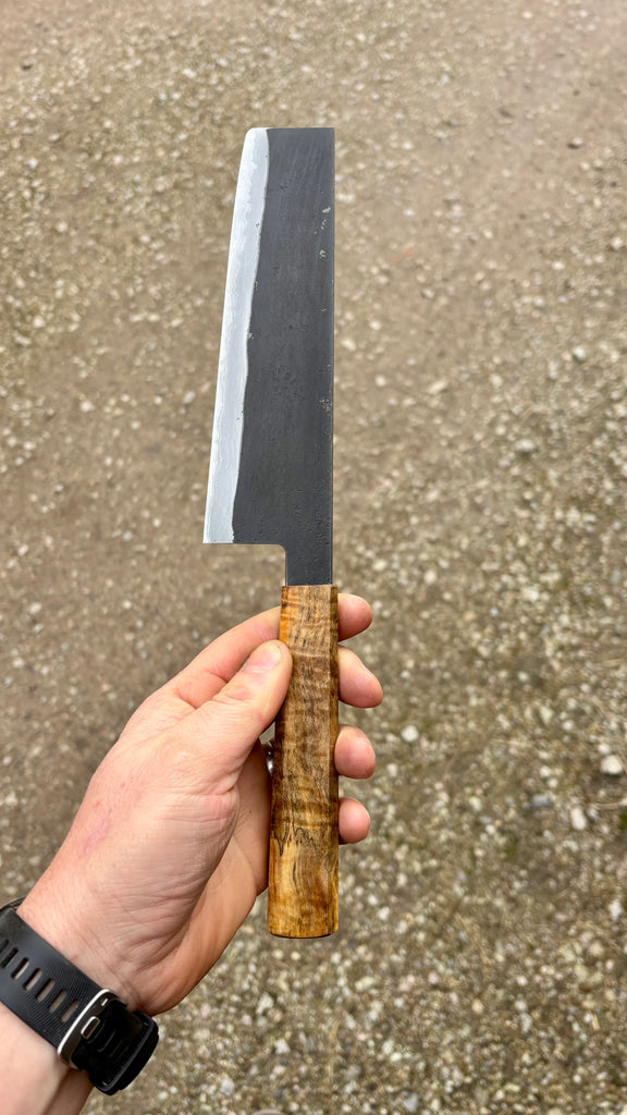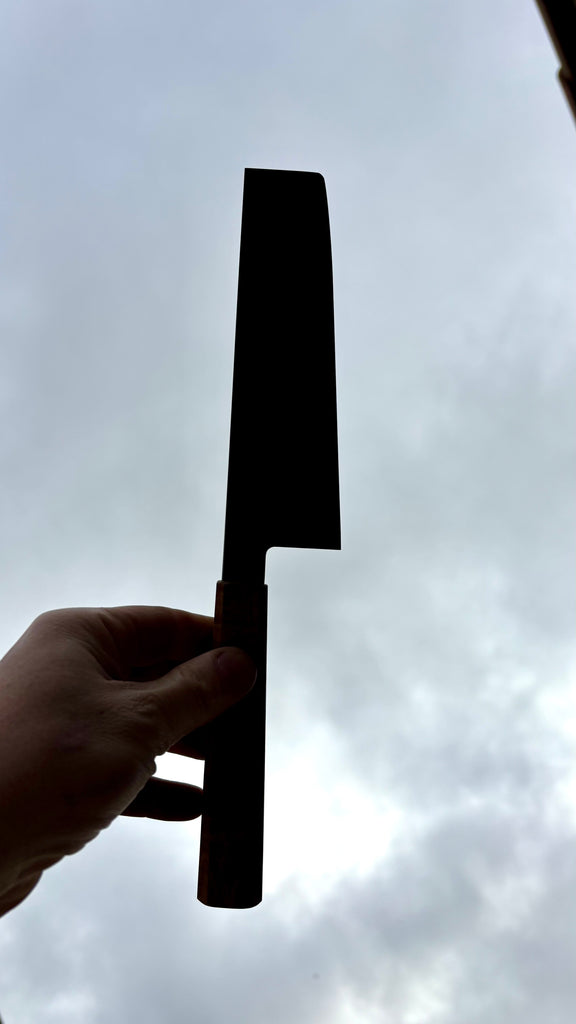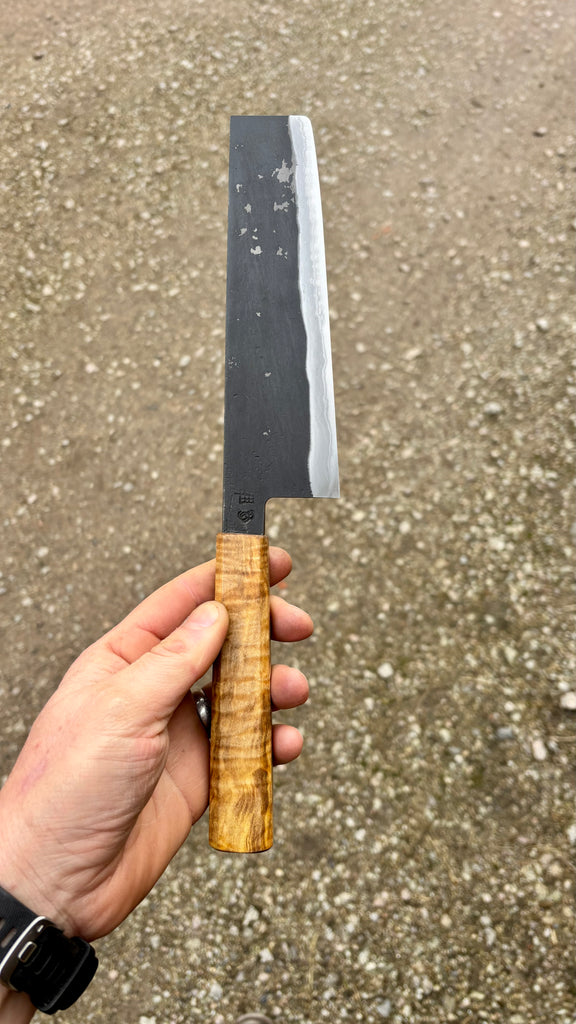 This Tetsu Nakiri feature a short blade, good distal taper, and thin tip. Flat profile at the heel with a slight curve toward the tip. The San-mai is made from 135Cr3 steel core with wrought iron cladding. Forged to shape and to geometry the blade is ground on water cooled grinding wheel.