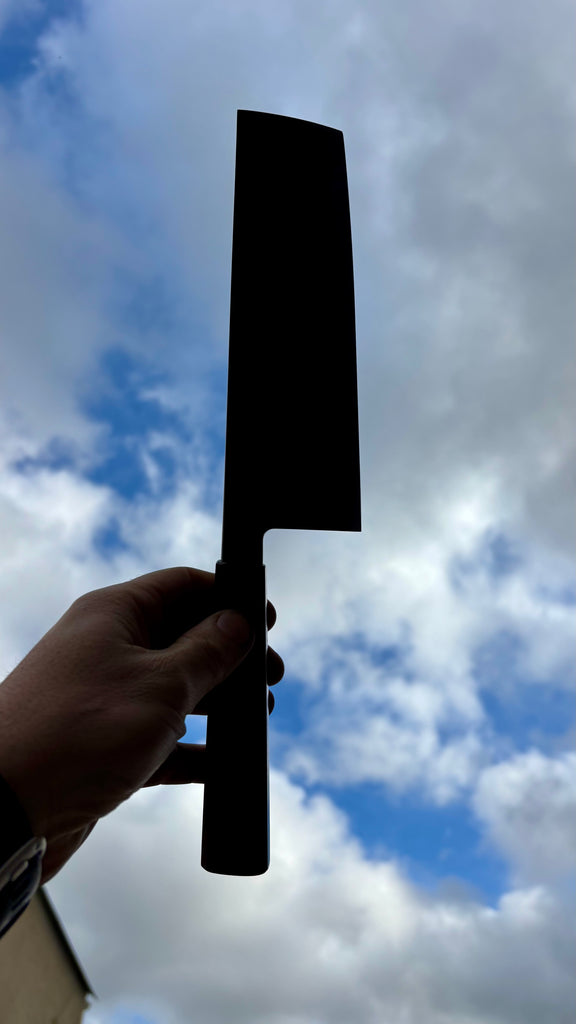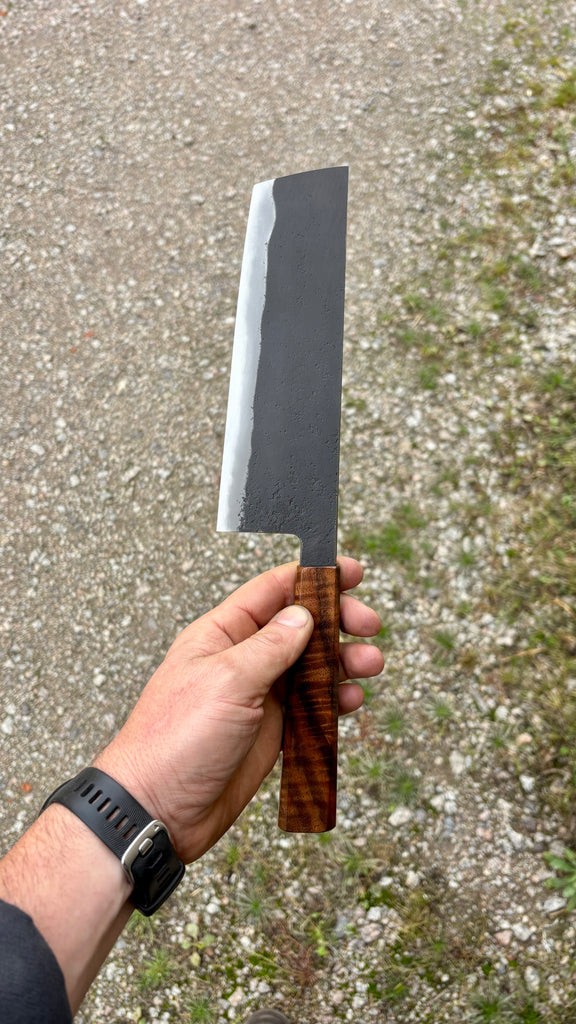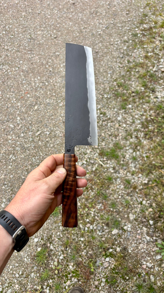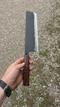 This Nishiji Nakiri feature a medium size and thin blade with a good distal taper. Flat profile at the heel with a slight curve toward the tip. The San-mai is laminated by myself in house. Forged to shape and to geometry the blade is ground on water cooled grinding wheel.