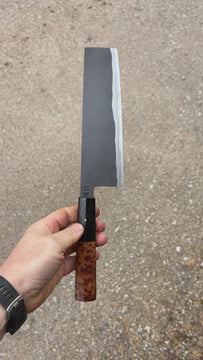 This Tetsu Nakiri feature a medium size but tall blade, good distal taper, thin tip. Flat profile from the heel with a curve toward the tip. The San-mai is laminated by myself in house. Forged to shape and to geometry the blade is ground on water cooled grinding wheel then finish by hand on bench stone.