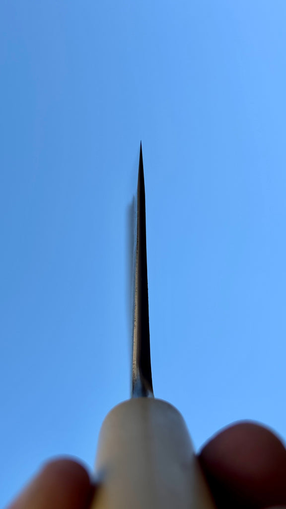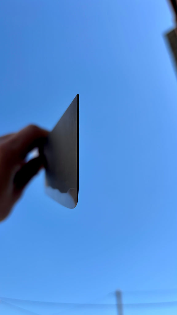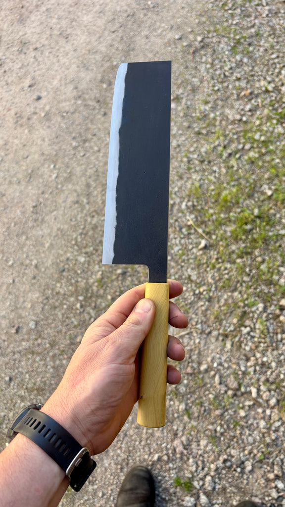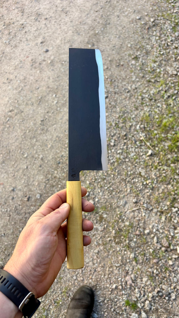 This Tetsu KU Nakiri feature a tall blade, good distal taper, thin tip. Flat profile at the heel with a slight curve toward the tip. The San-mai is made from 135Cr3 steel core with vintage soft iron cladding. Forged to shape and to geometry the blade is ground on water cooled grinding wheel.